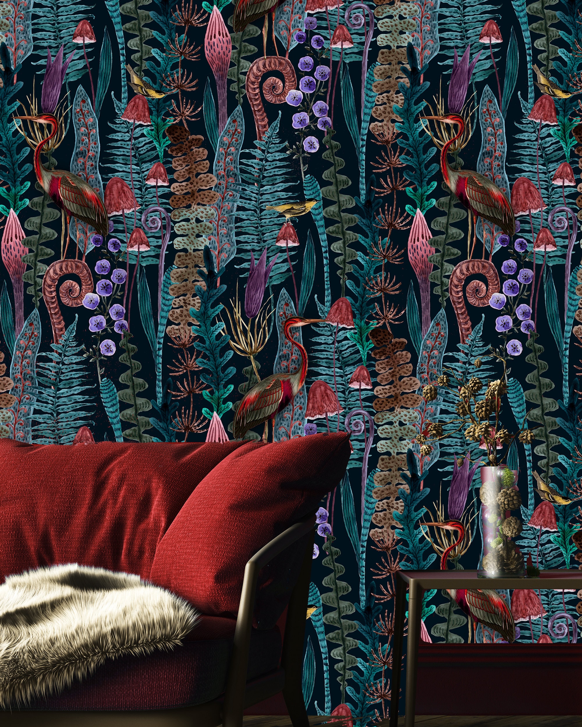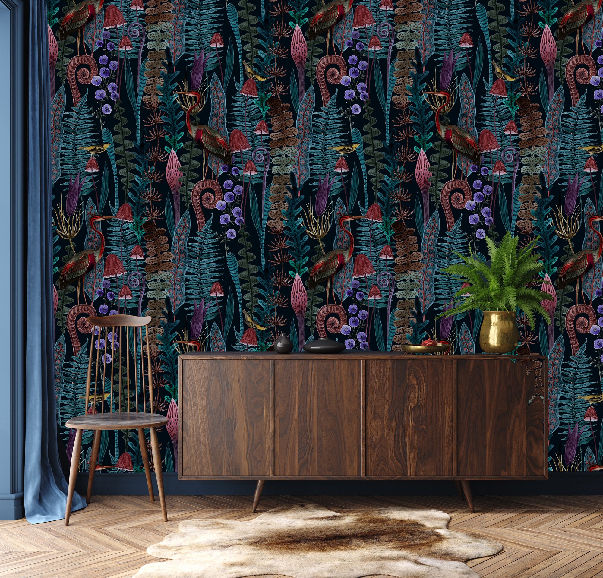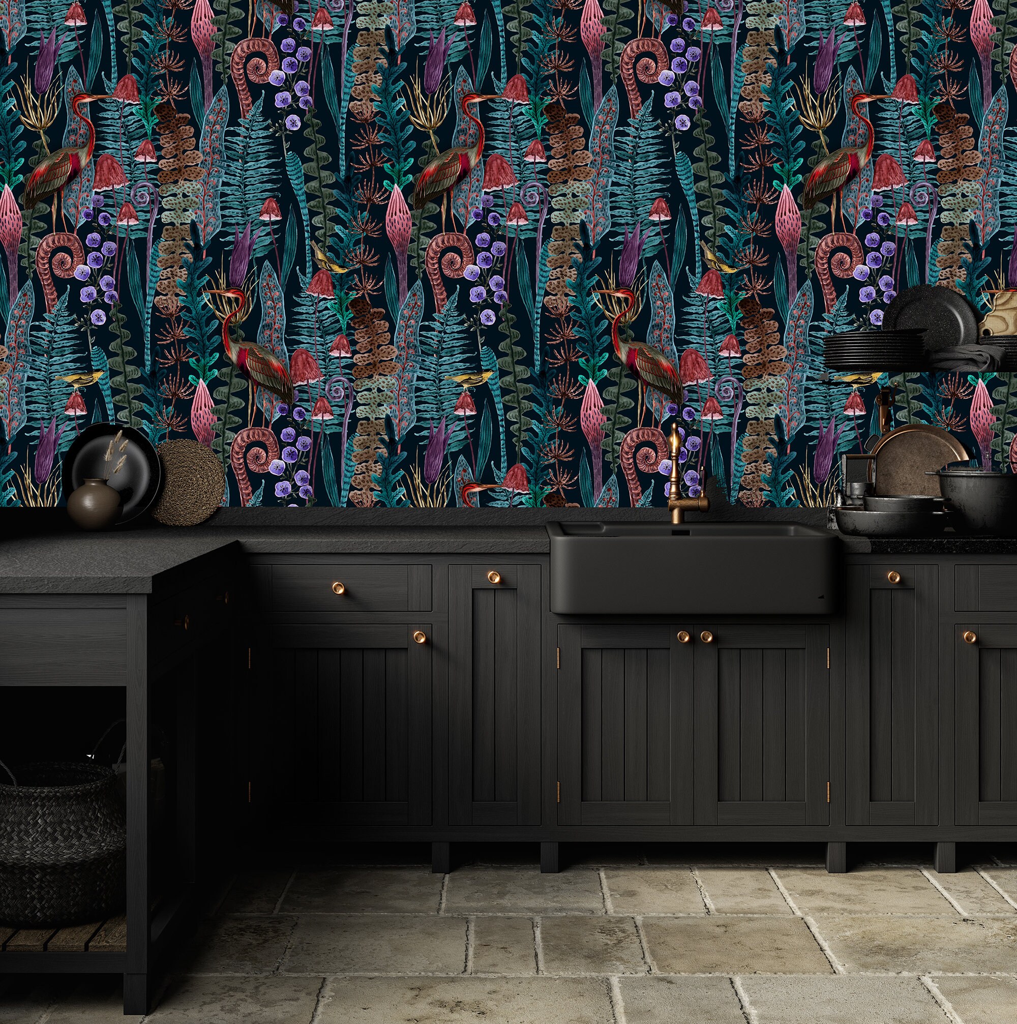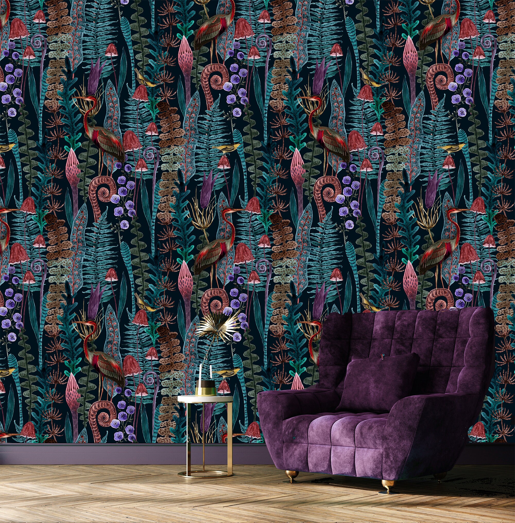 Add a touch of natural wonder to your space with our stunning Botanical Wallpaper. This colorful forest design exudes a tranquil ambience with a charming crane motif amidst lush foliage. Dark-colored plants add drama, complemented by the presence of a subtle heron mural. ,The exotic appeal of this design is further enhanced by a beautiful mushroom mural, complemented by vibrant red tones. Transform any room into a botanical paradise with this enchanting combination of heron, colorful forest, crane dark plants and the striking presence of red mushroom.
