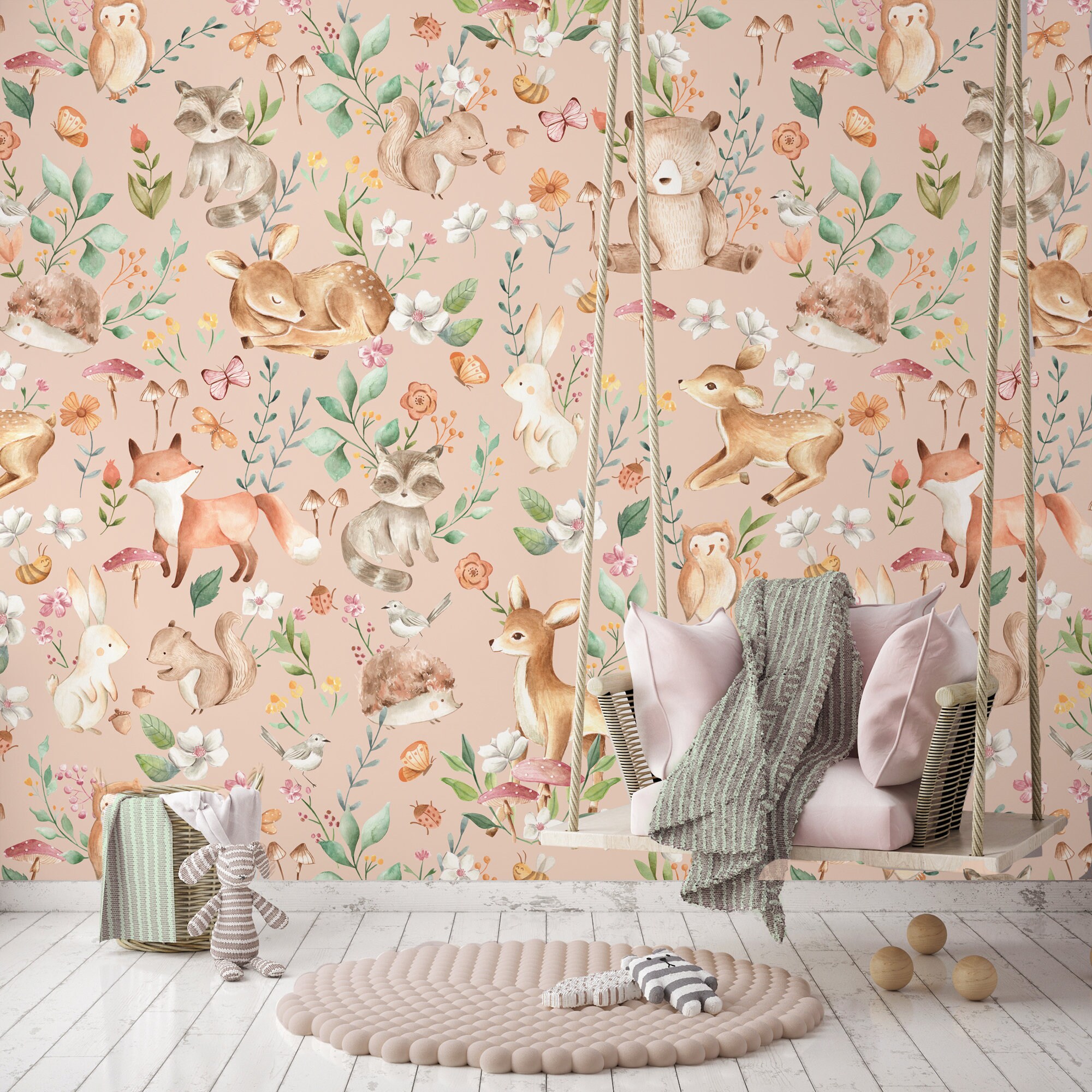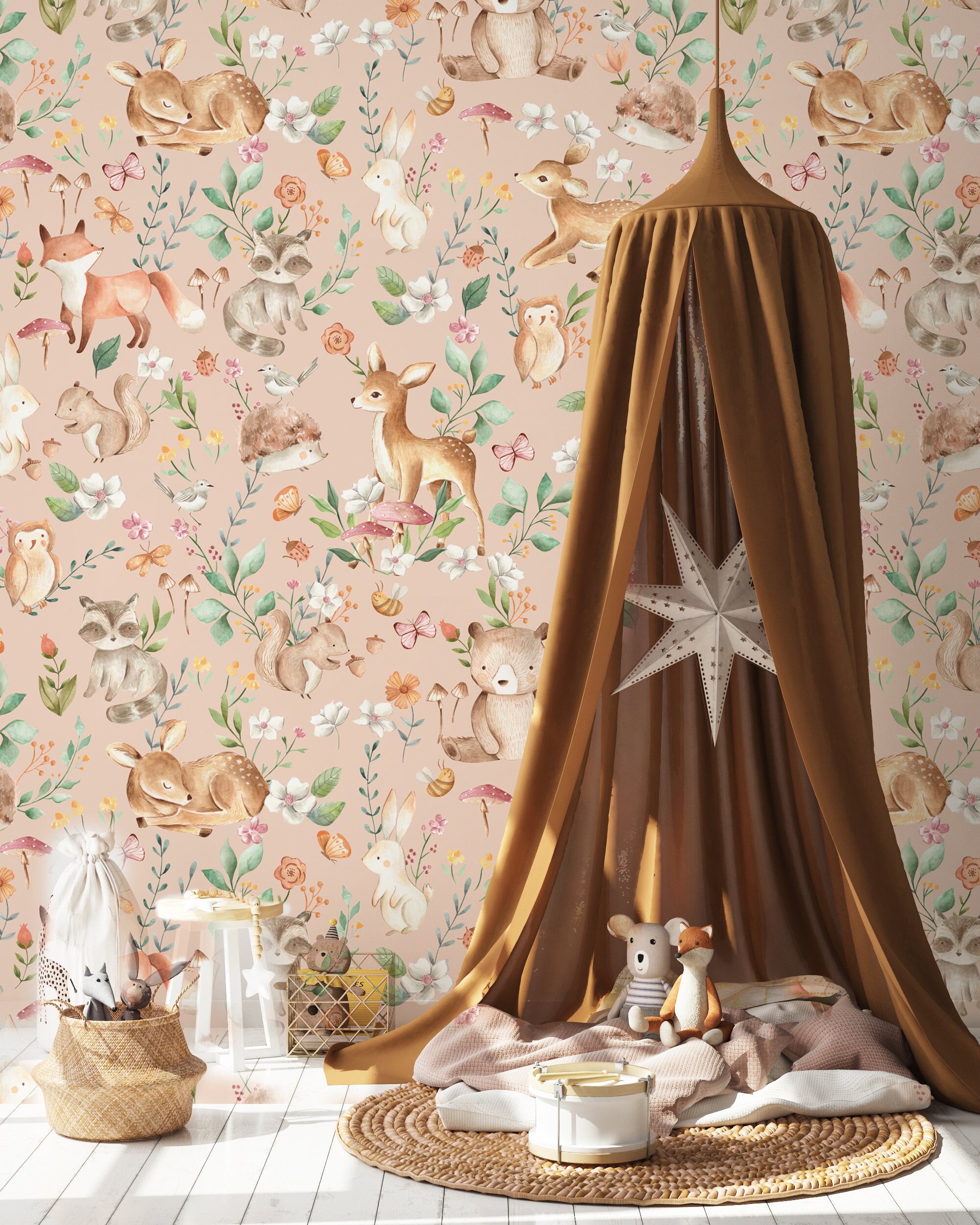 Introducing our whimsical woodland baby nursery wall art that will transport your little one straight into a charming forest full of delightful creatures. You will want to lose yourself in this enchanting scene, where baby ladybugs and delicate butterflies flutter freely. Bambi and baby gazelles prance gracefully amidst a backdrop of towering mushrooms. Friendly hedgehogs and playful rabbits hop about, while curious birds sing their cheerful melodies from above. And let's not forget the mischievous foxes and adorable raccoons who add a touch of woodland charm. Bring the magic of nature into your nursery with this captivating wall art that is sure to spark their imagination.