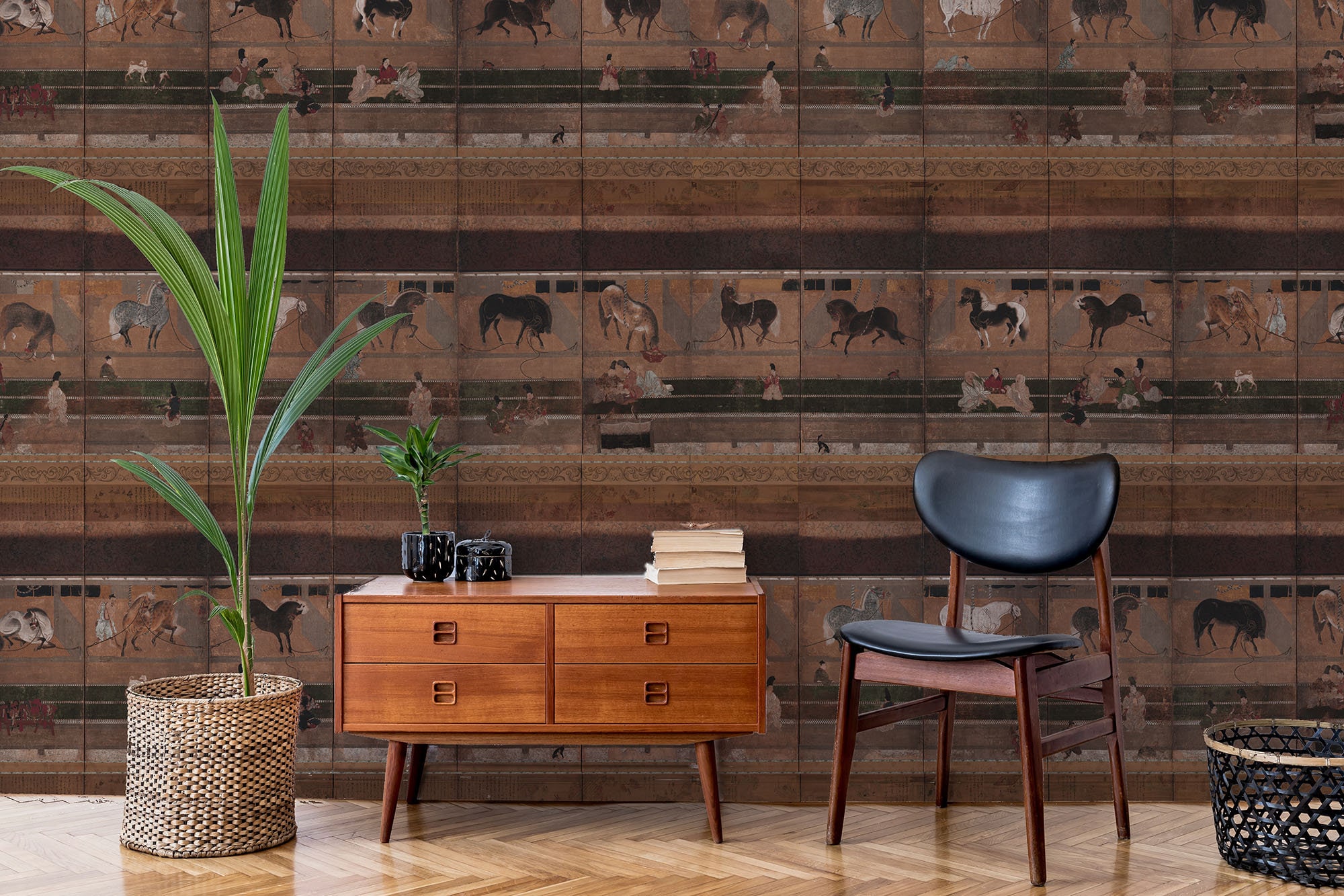 Step into an atmospheric world where the noble heritage of Chinese traditional art captures the timeless essence of the horse. This vintage-inspired mural features a detailed composition of a horse stud and trainers, reflecting a legacy of strength and disciplined grace. It is a bold visual signature that brings an intellectual energy to your walls. Designed for all interiors, every vivid detail highlights a sense of curated history and sophisticated character. A powerful signature for an interior with a poetic soul.