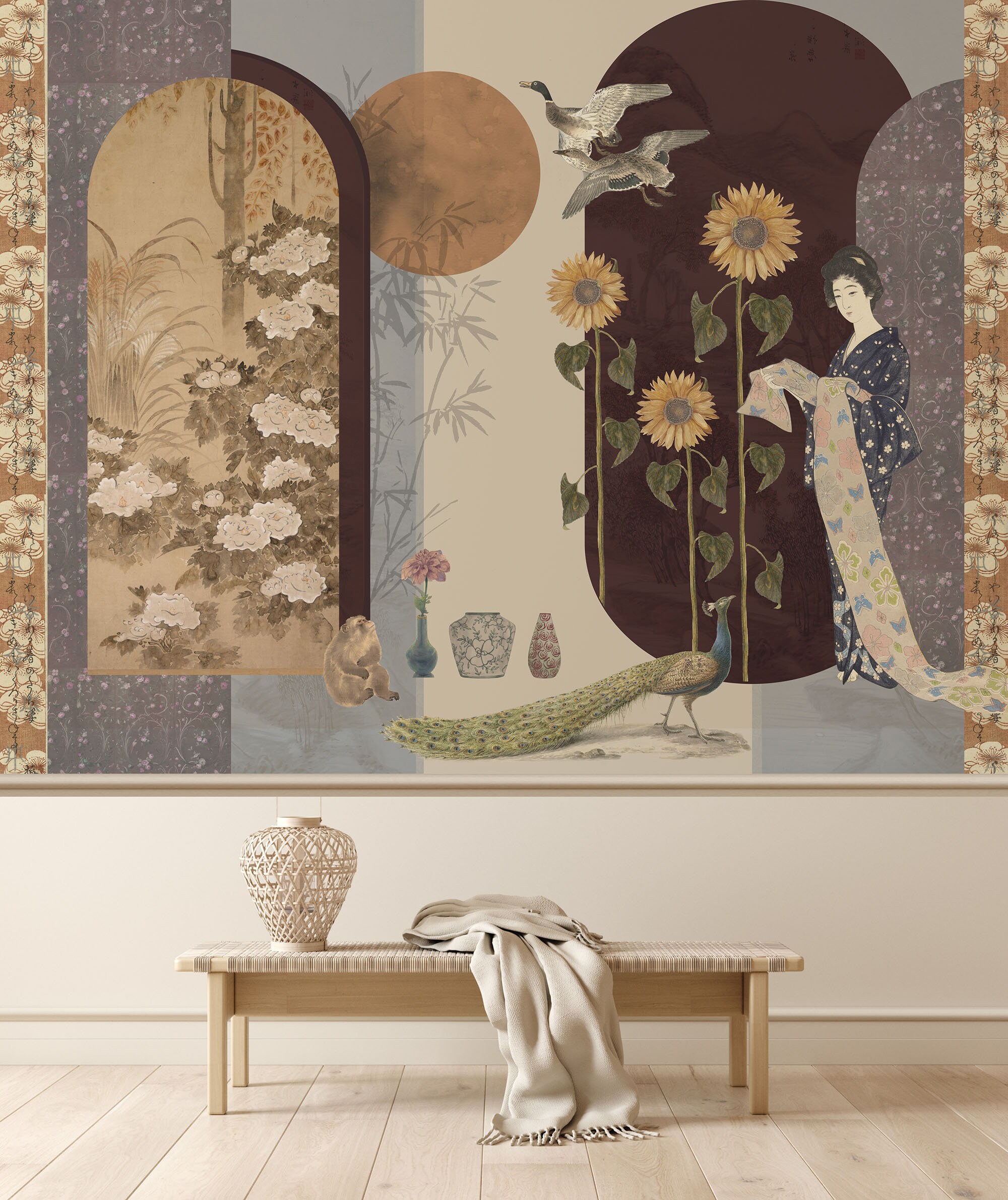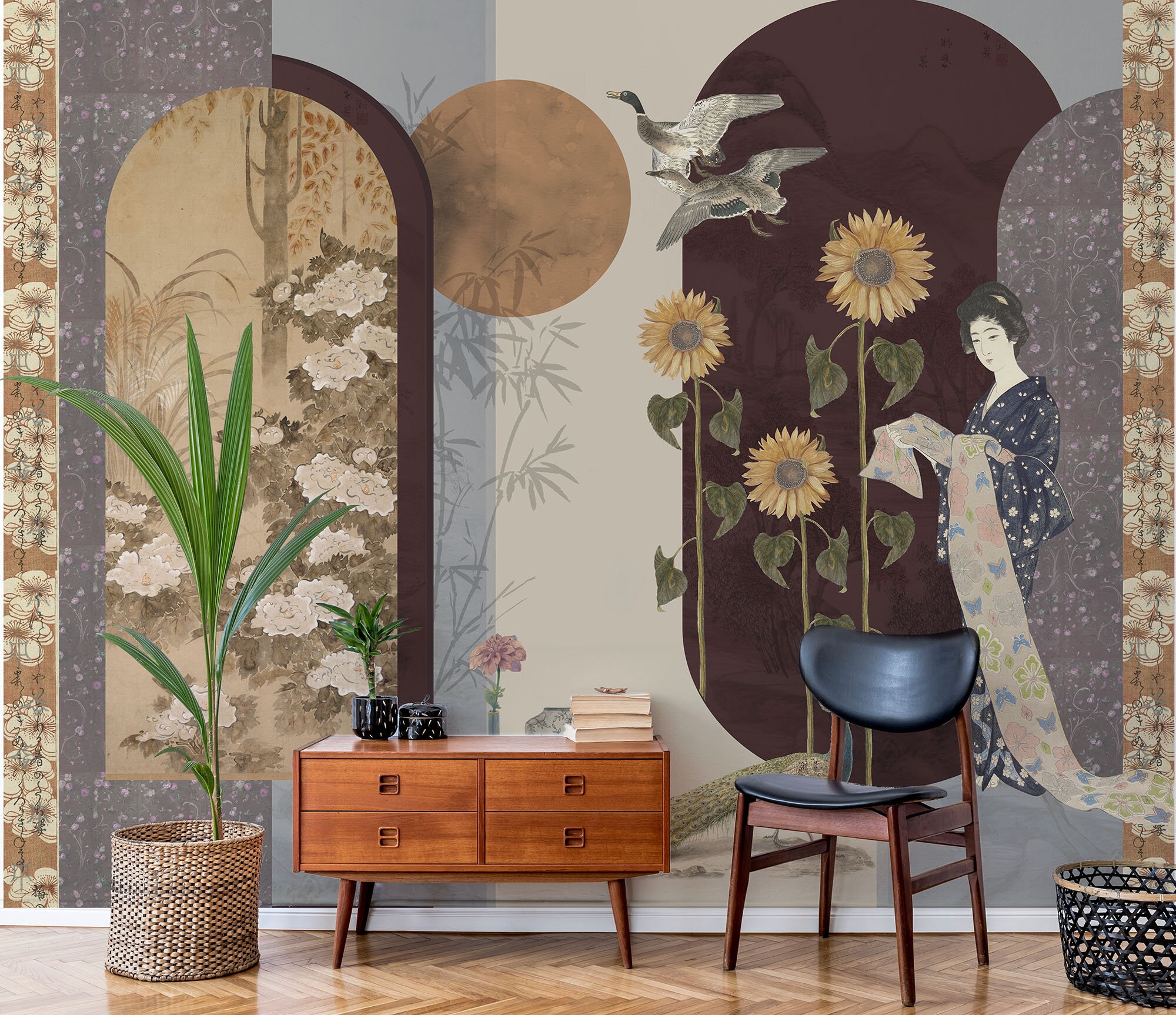 Introducing our extraordinary blend of the old and the new in the design of our wallpaper. We embarked on a creative journey to capture the essence of traditional Japanese art, where the iconic geisha gracefully roams amidst a radiant meadow of sunflowers. As you wander through this stunning scene, be greeted by peacocks, monkeys, and other majestic wild animals, all observing the geisha's captivating journey. The design boasts classic floral patterns that will undoubtedly transform the atmosphere of your spaces forever. Crafted with the utmost quality in mind, our wallpapers are created using the latest system and premium materials. Choose between our classic vinyl application or adhesive paper options, ensuring a seamless installation process. Elevate your decor with this mesmerizing wallpaper and experience a delightful fusion of tradition and innovation.