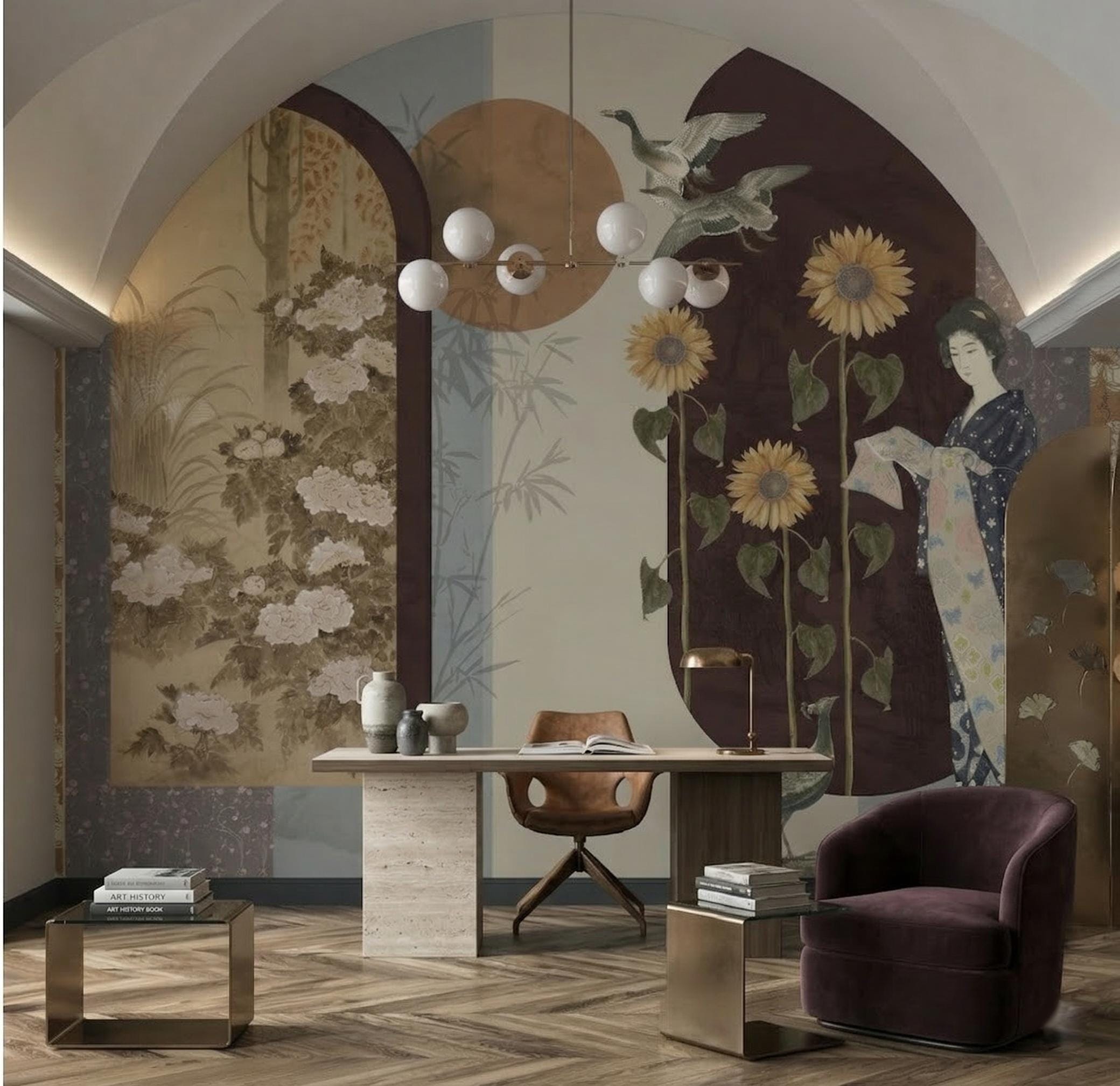 Japanese Garden Wallpaper • Vintage Geisha & Sunflower