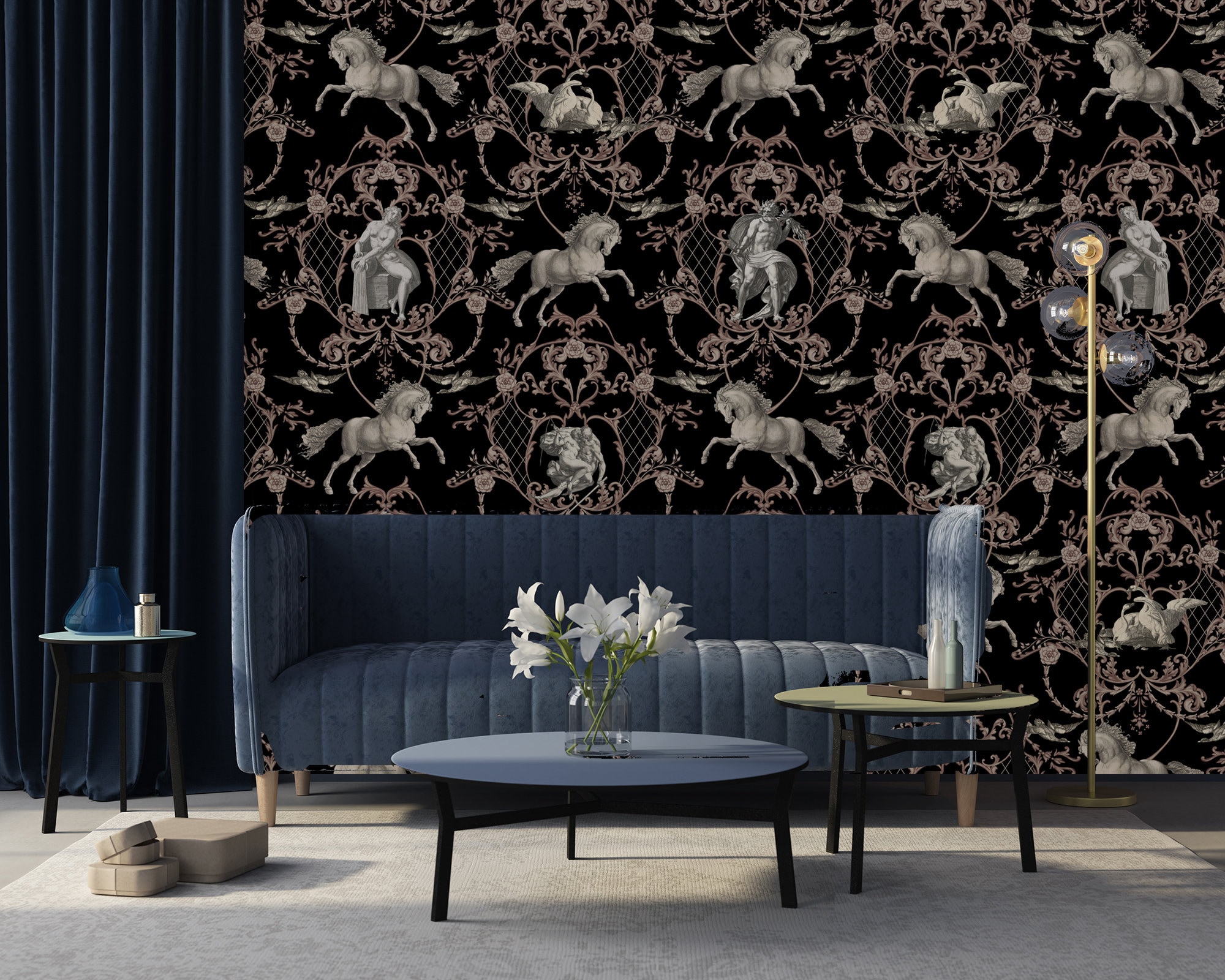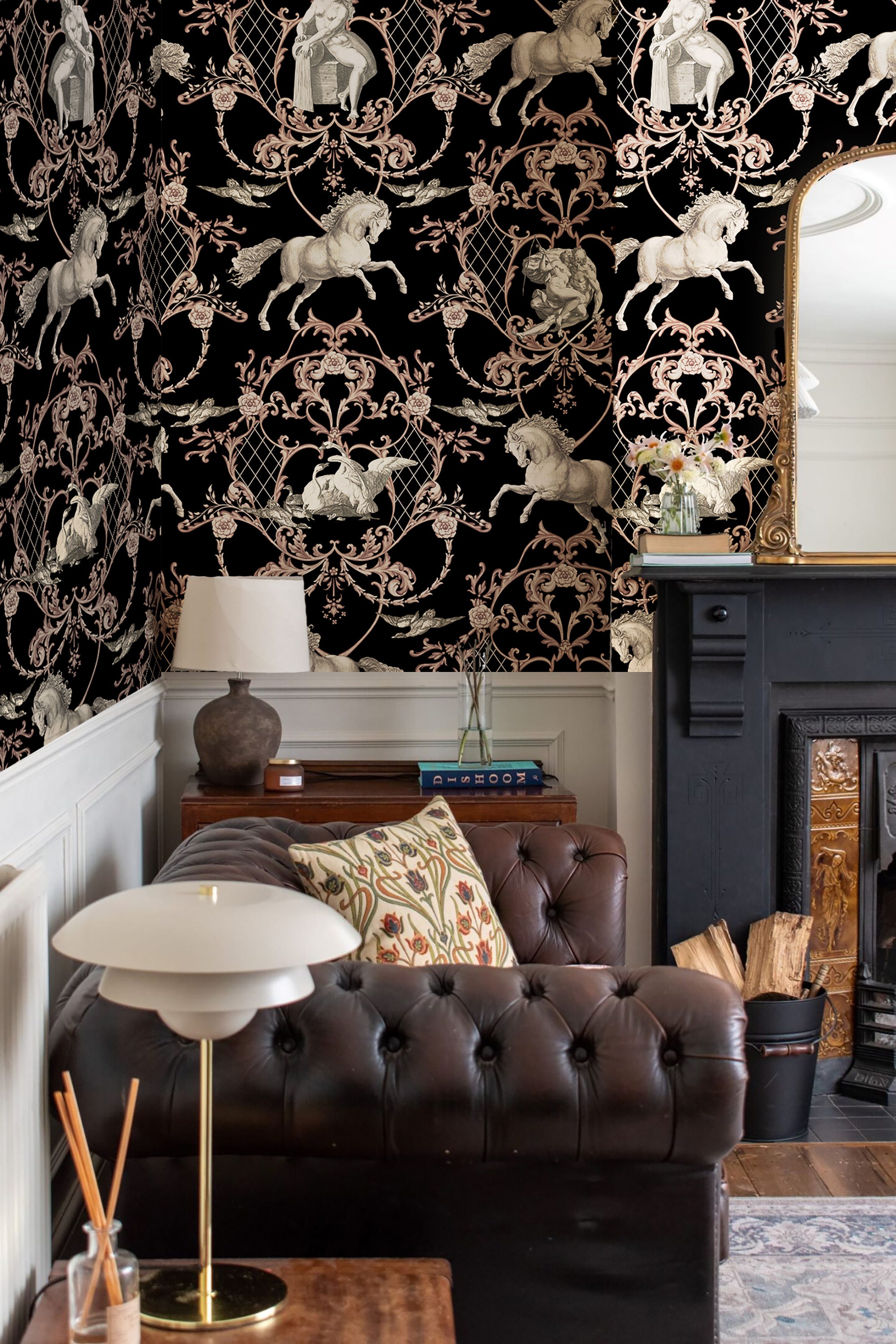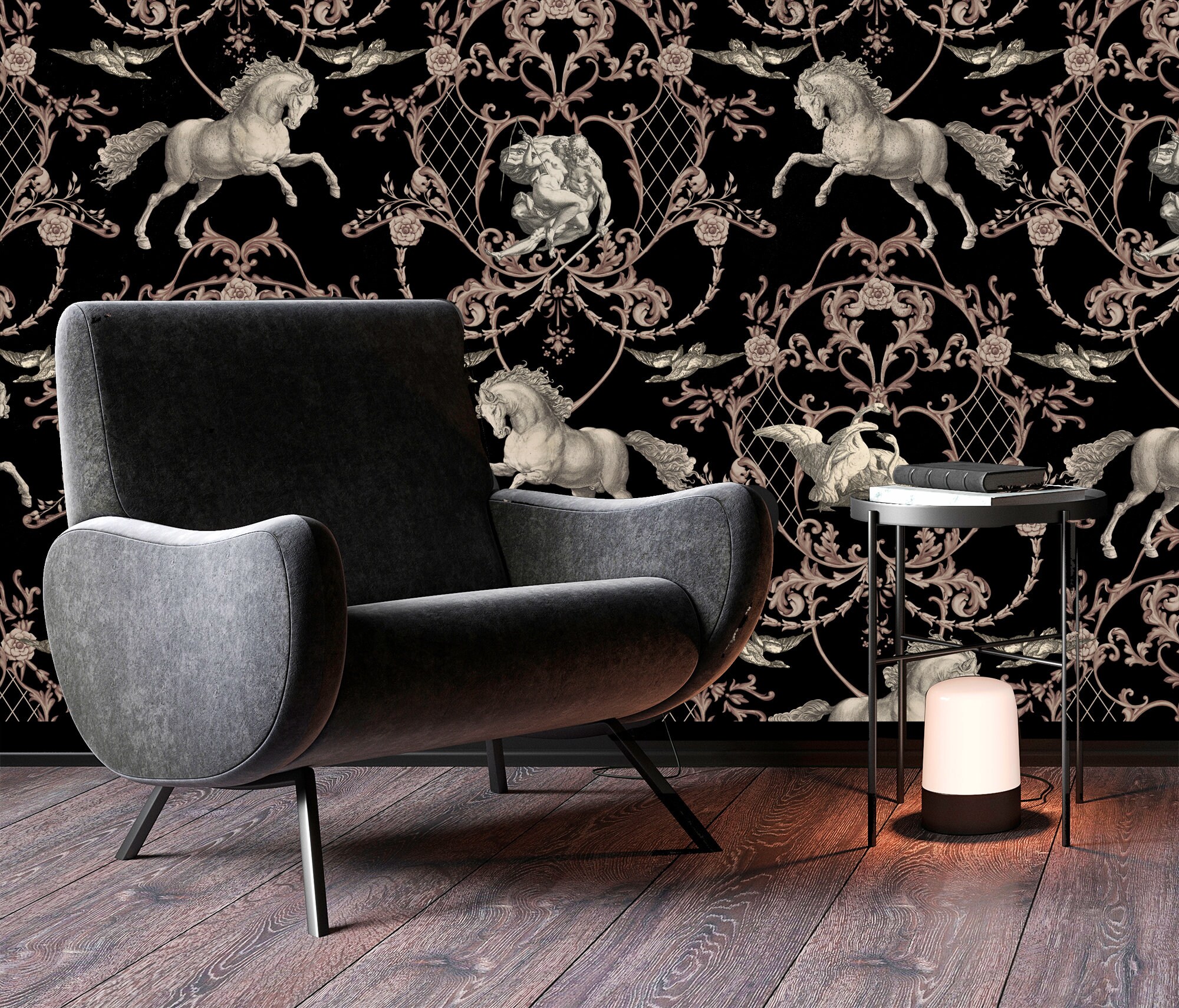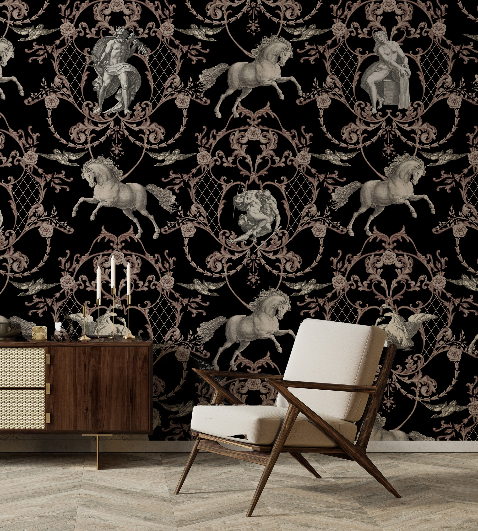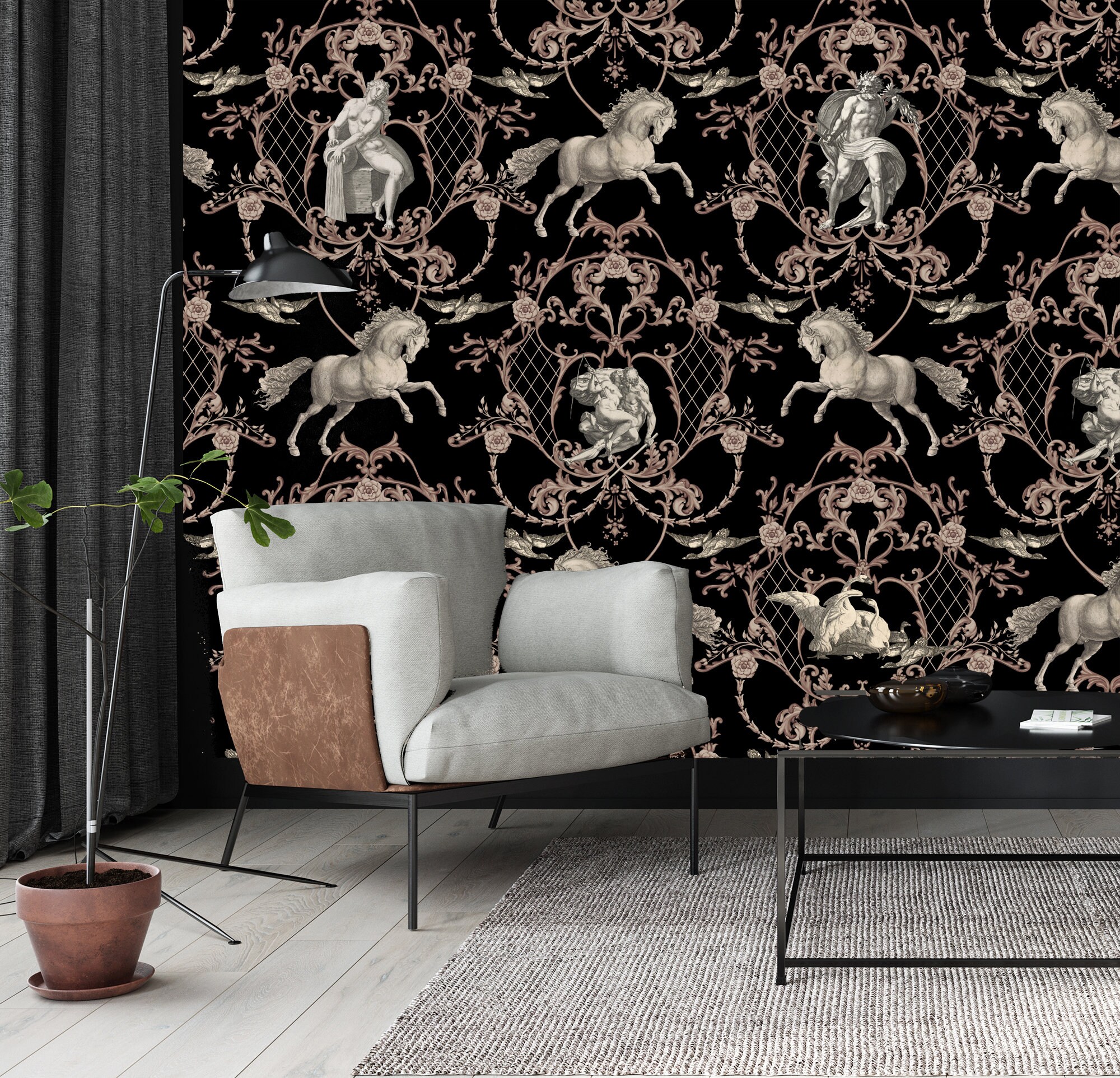 Vintage Horse Damask Wallpaper: Historical Art Print (Peel & Stick or Vinyl)