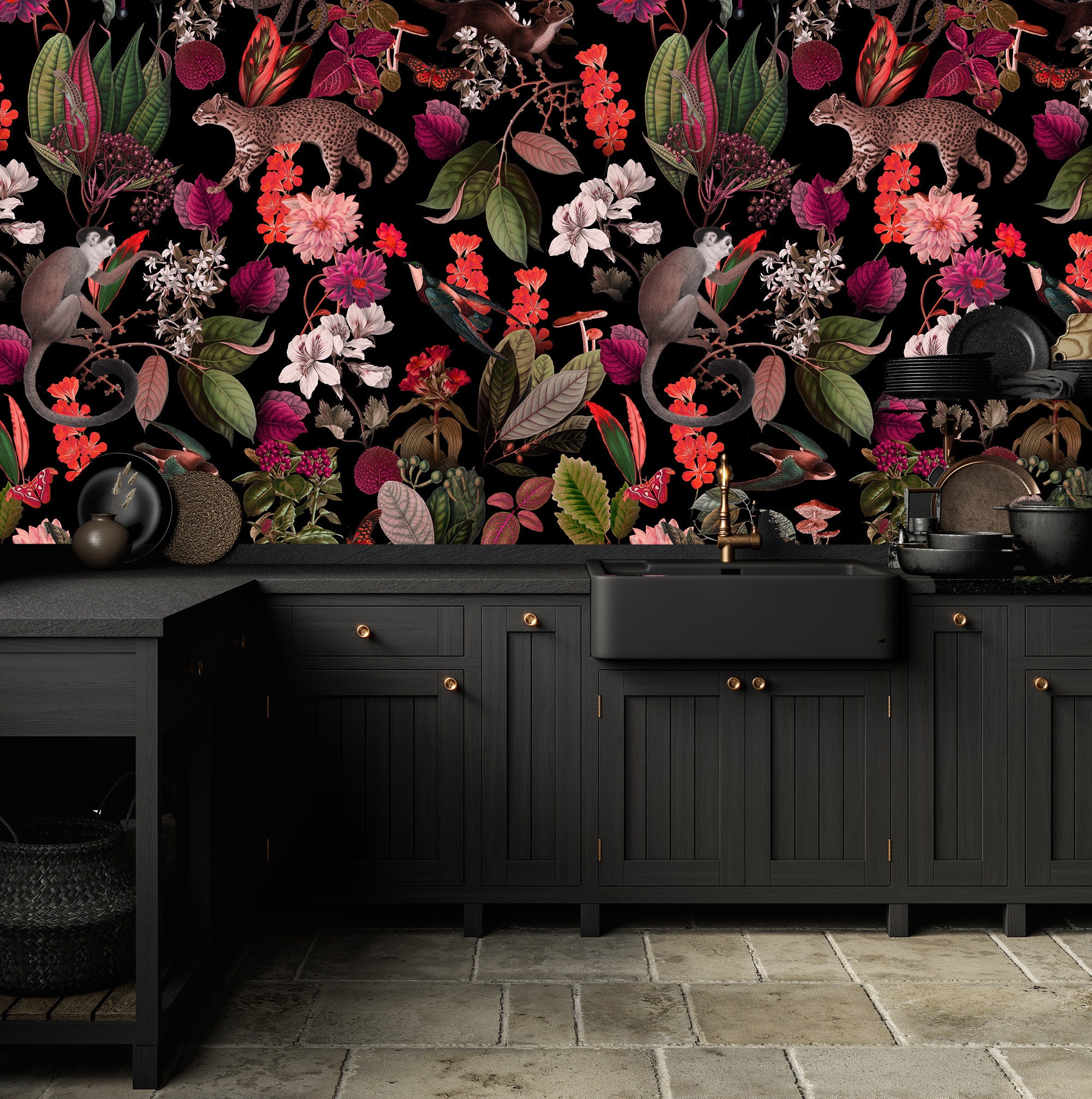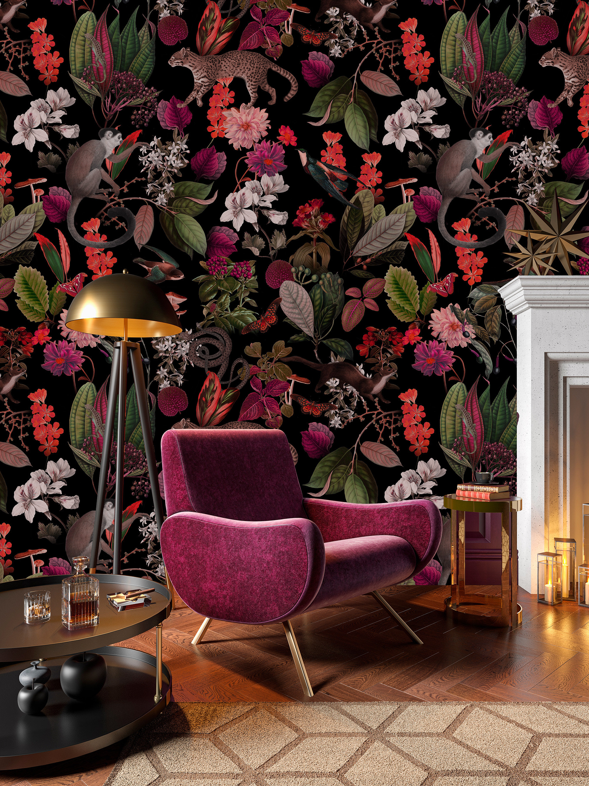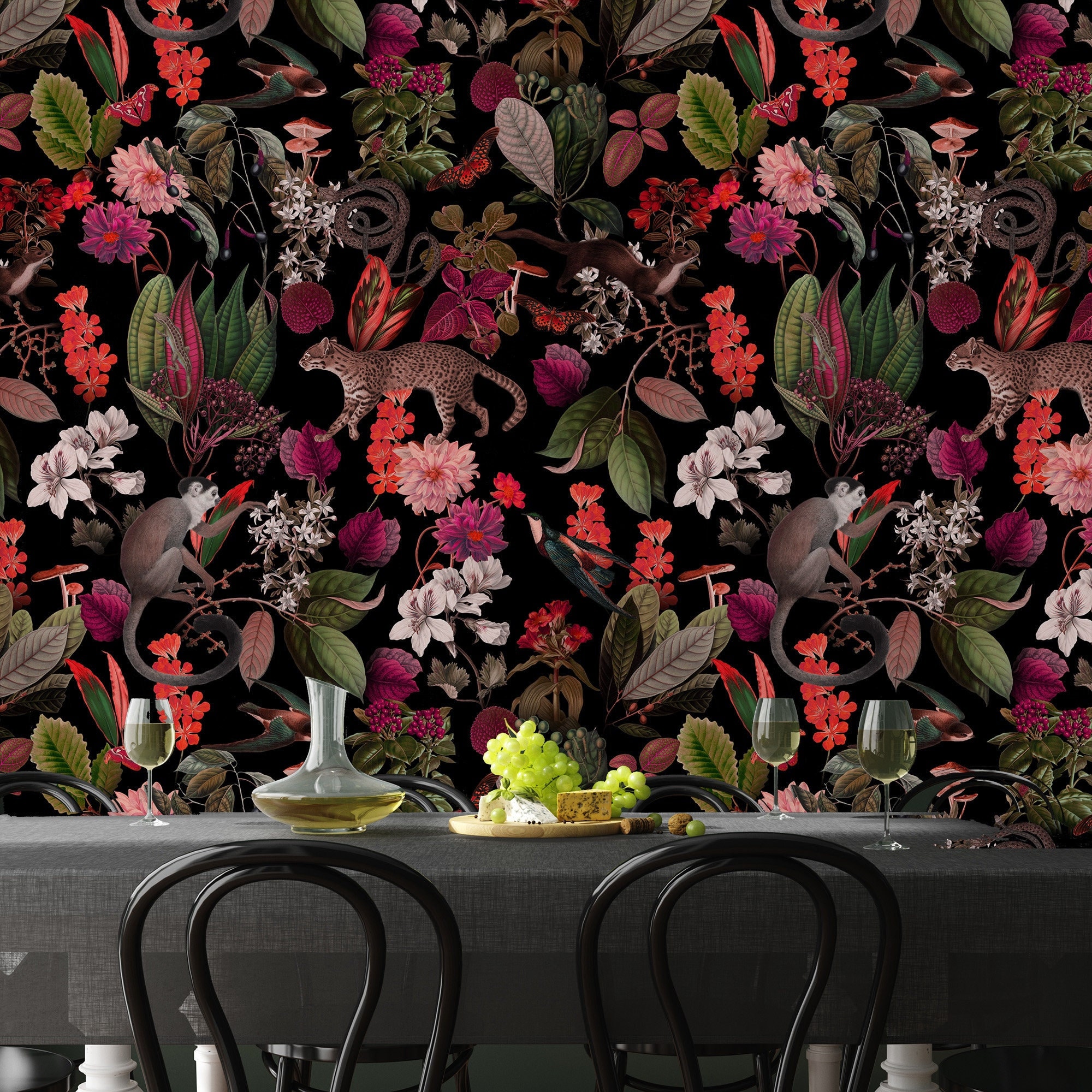 Dark Botanic Wallpaper: Pink Forest Animals, Removable Vinyl