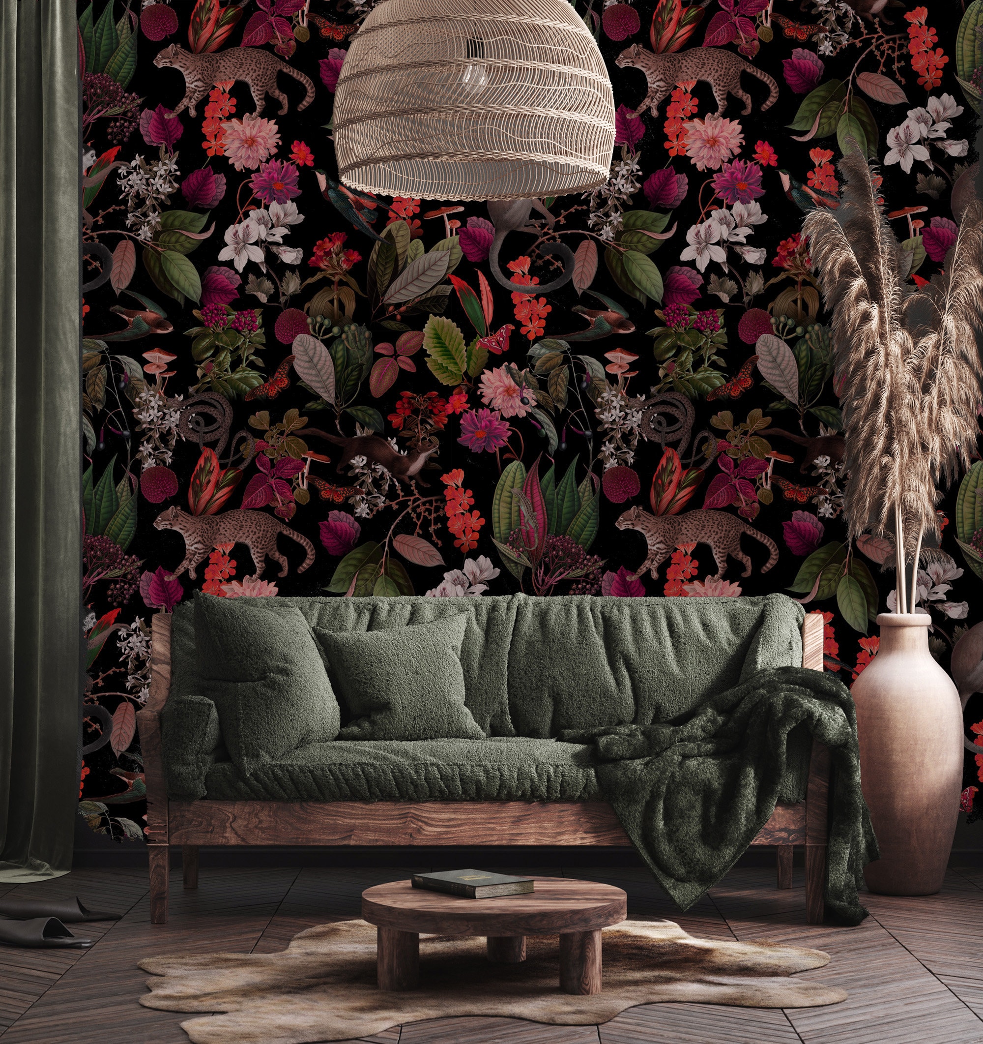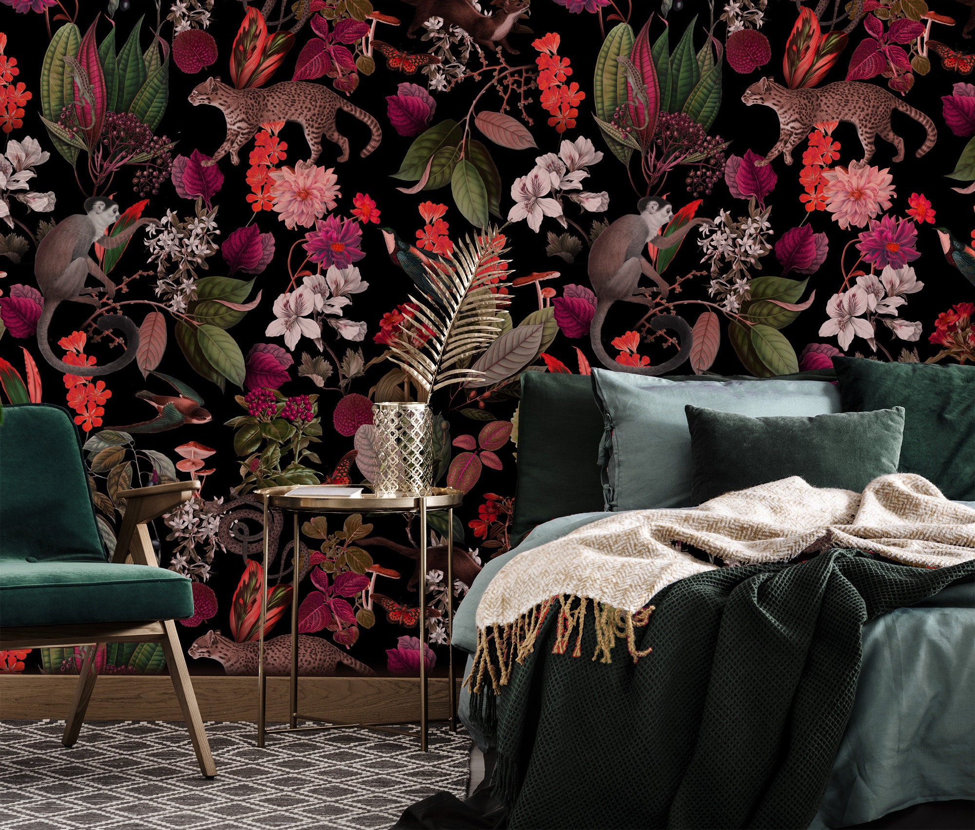 Transform your space into a heavenly botanical garden with our mesmerizing Dark Forest Wallpaper. Bursting with vibrant colors, this peel and stick wallpaper features a variety of delicate flowers, graceful birds, and majestic animals. From slithering snakes to lush plants, from playful cheetahs to elegant herons, our wallpaper brings the enchantment of a real forest right into your home. Adorned with beautiful creatures like chameleons and butterflies, this vinyl wallpaper is not only self-adhesive and removable, but also effortlessly transforms any room into a captivating oasis. Surround yourself and your guests with the wonders of nature, all within the convenience of your own walls.