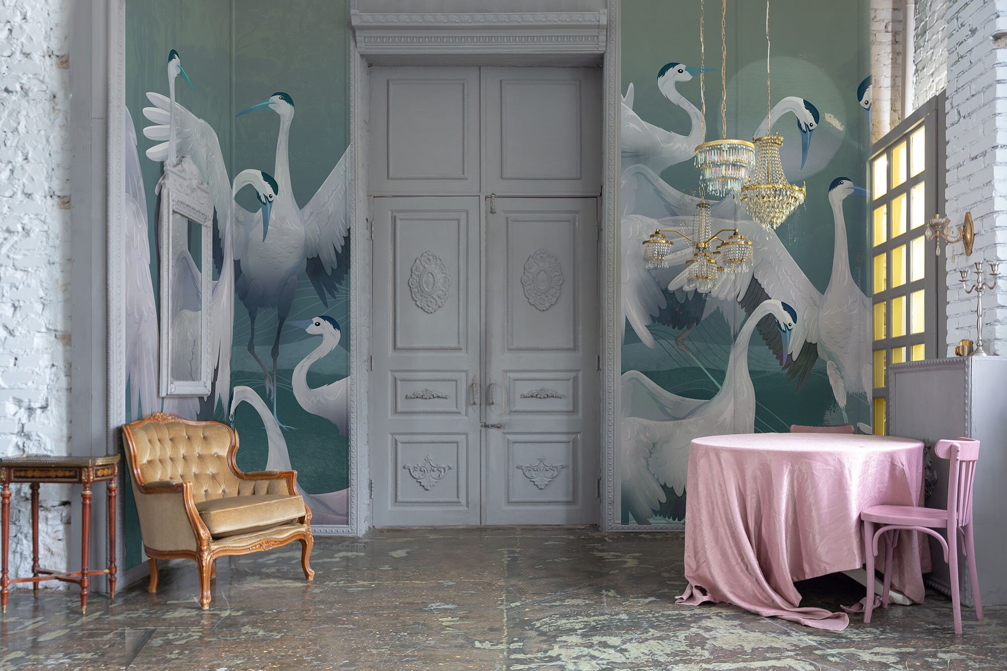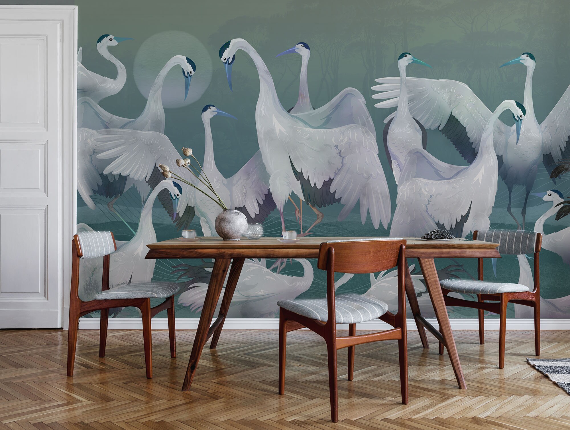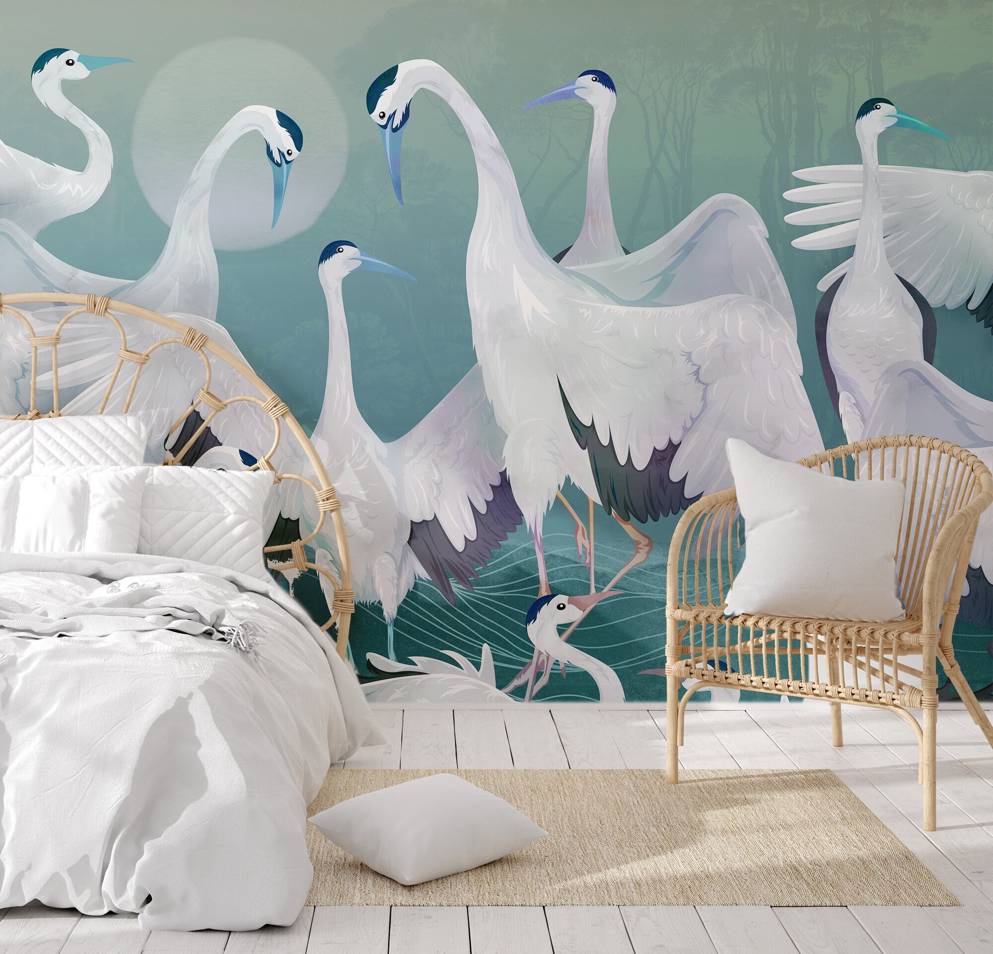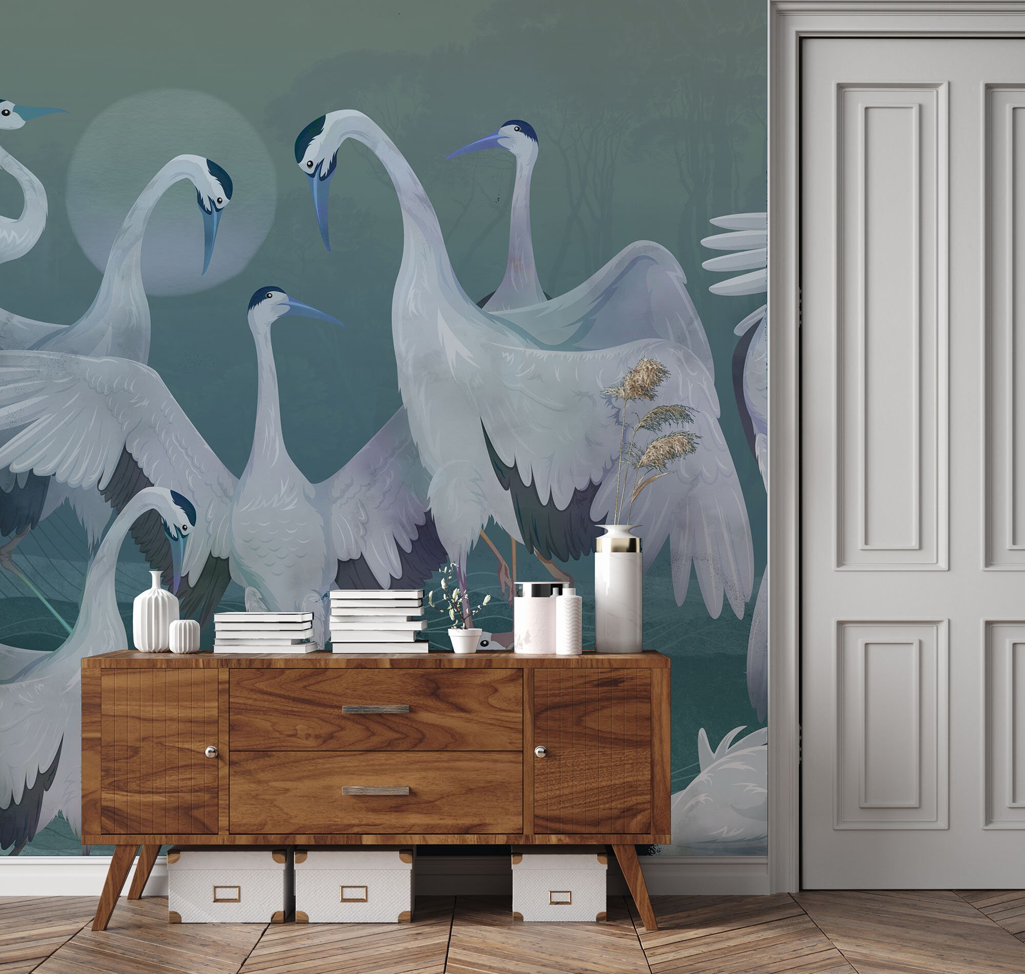 Blue Heron Crane Wallpaper: Asian Birds Vinyl Mural (Peel and Stick)
