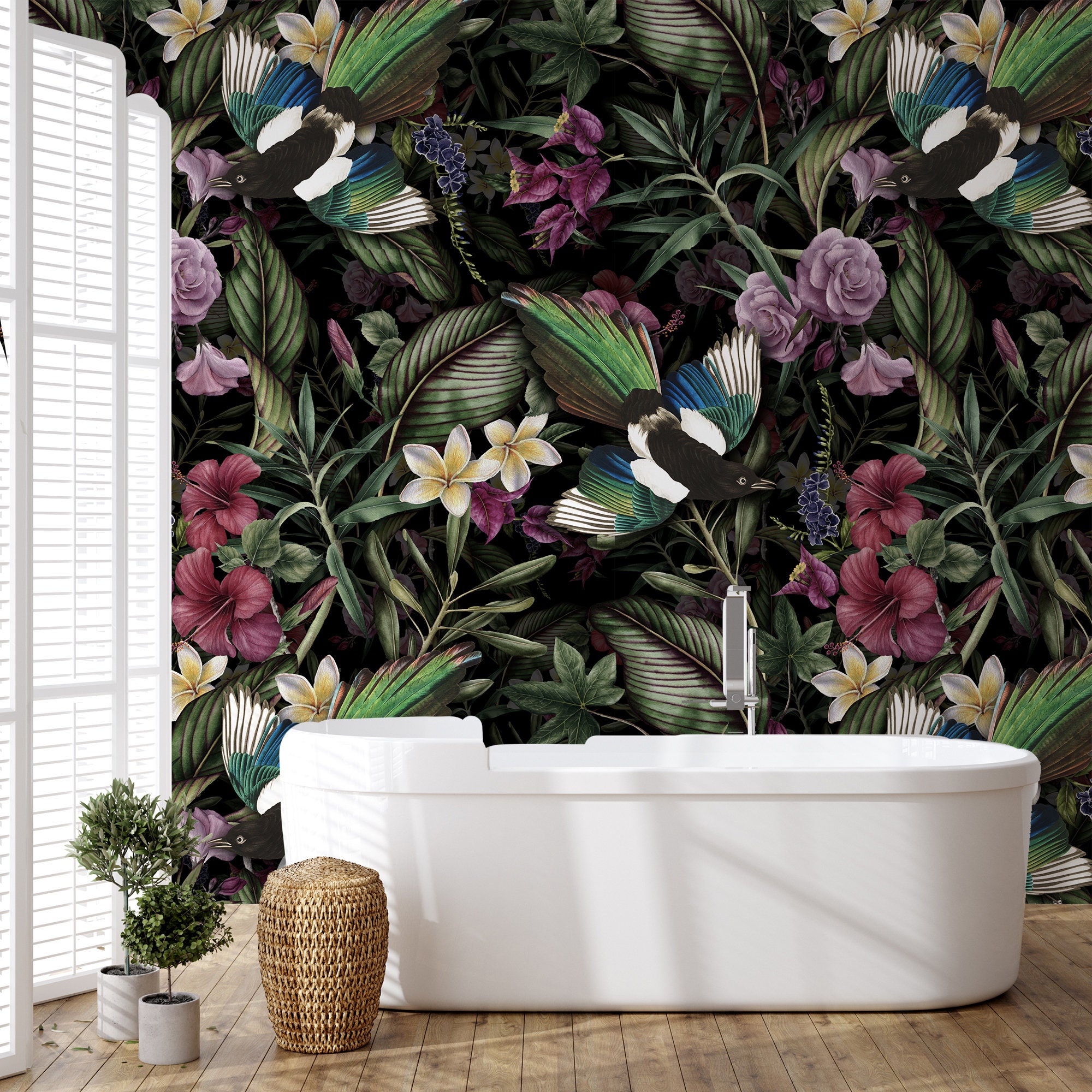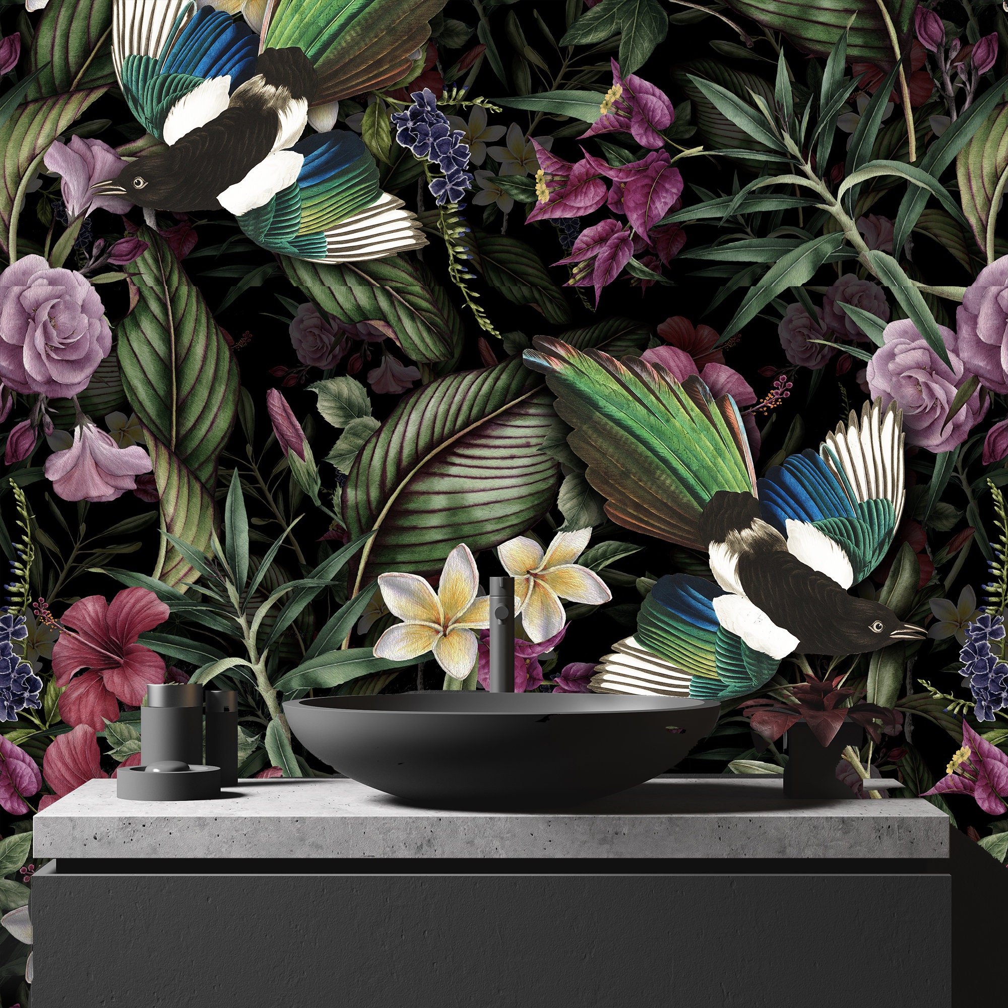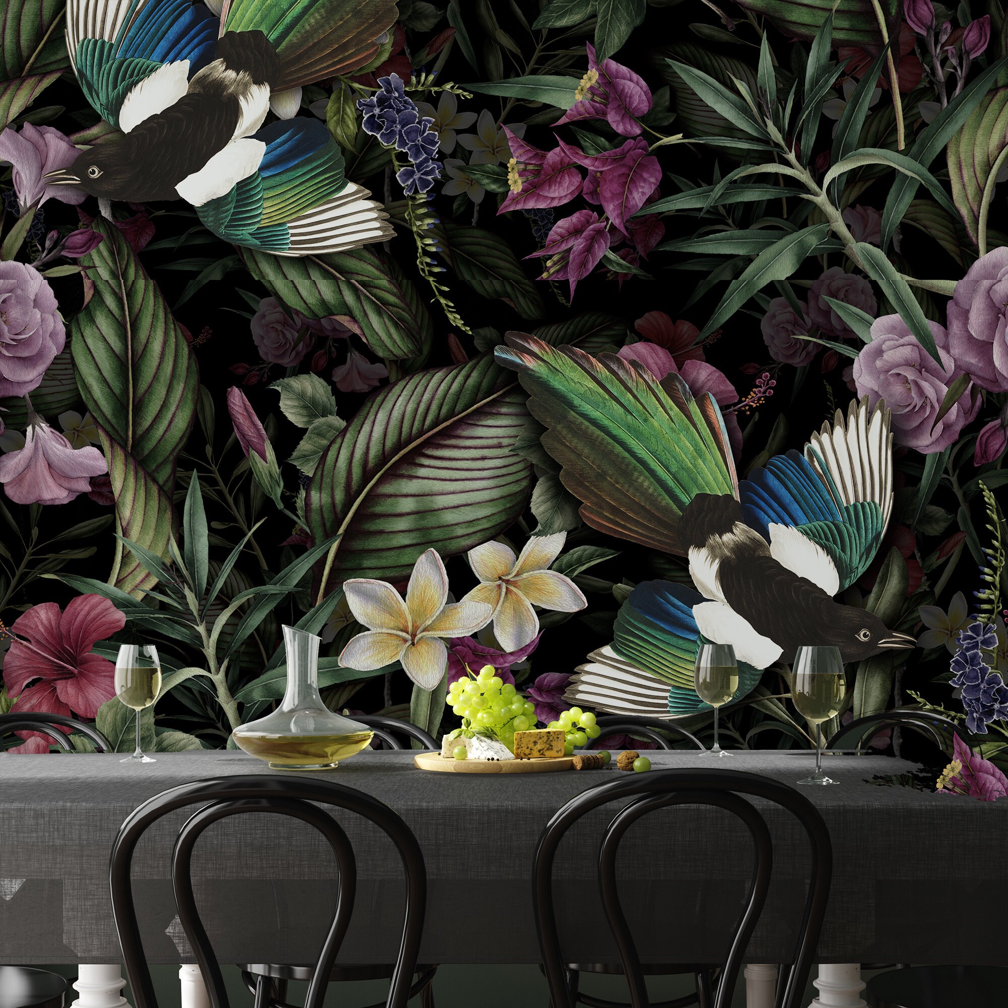 Dark Botanical Wallpaper: Vintage Birds, Flowers, Leaves (Peel and Stick)