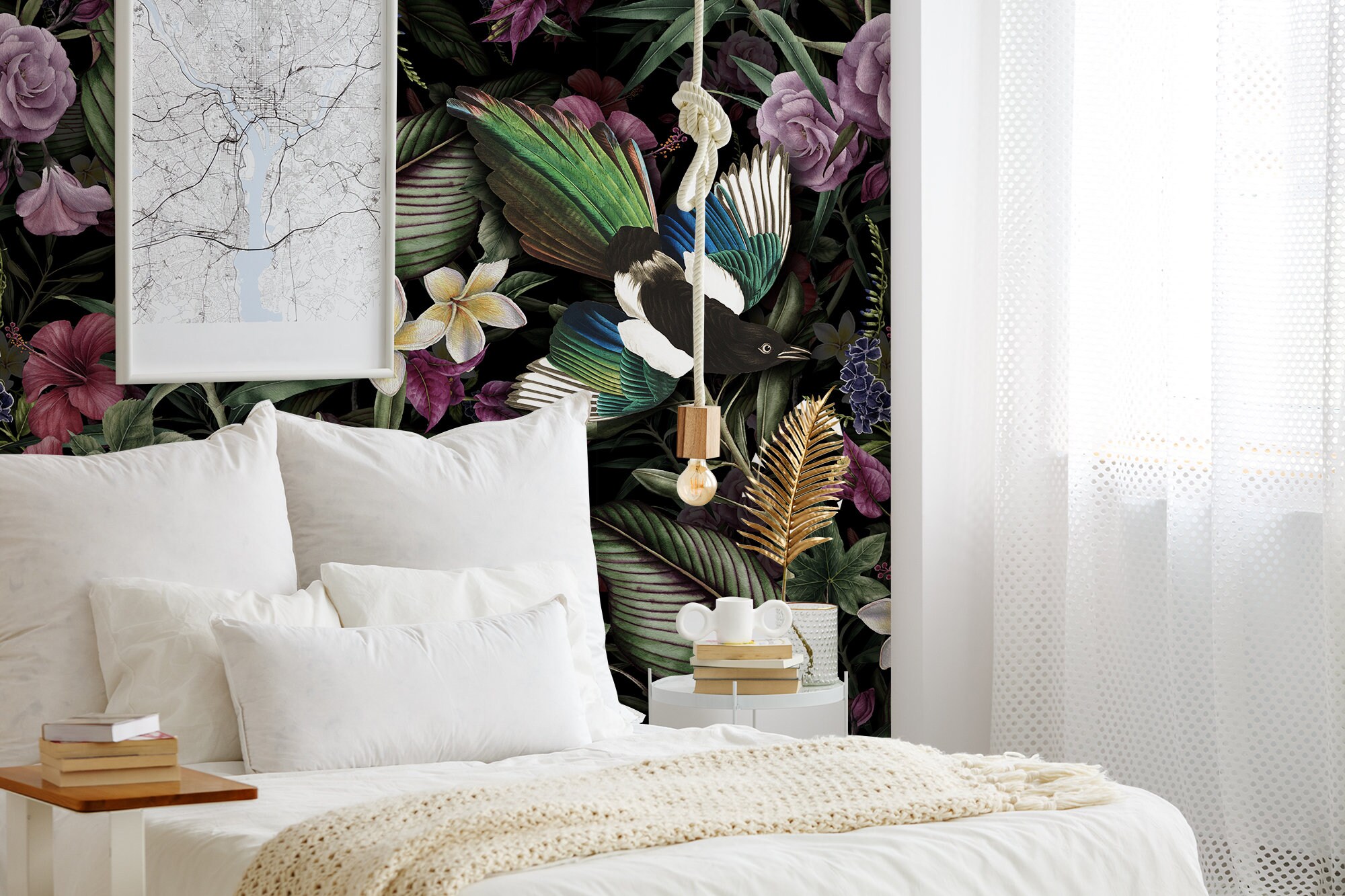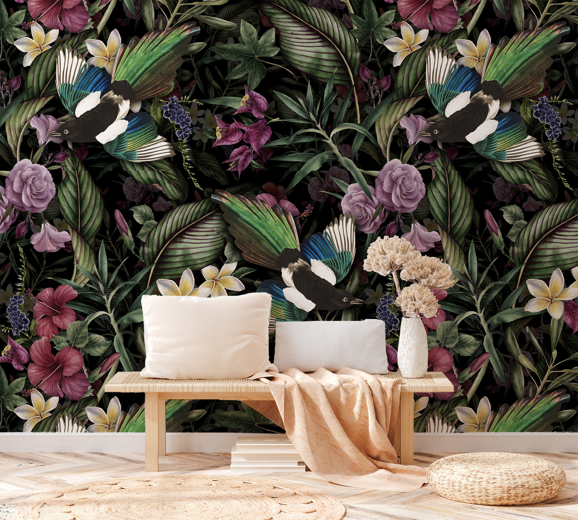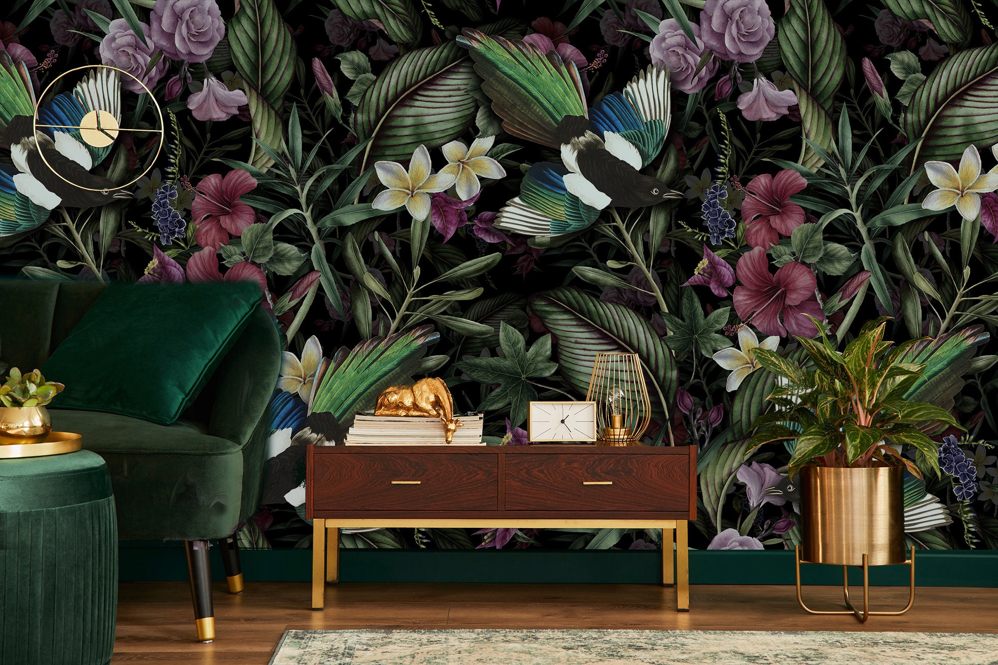 Dark Botanical Wallpaper: Vintage Birds, Flowers, Leaves (Peel and Stick)