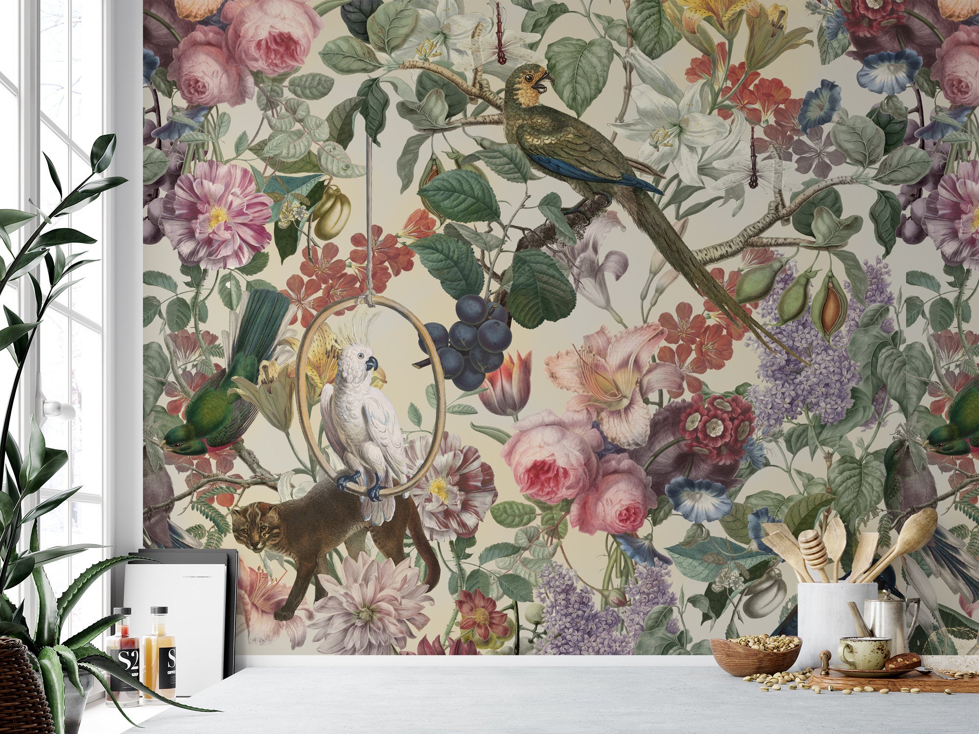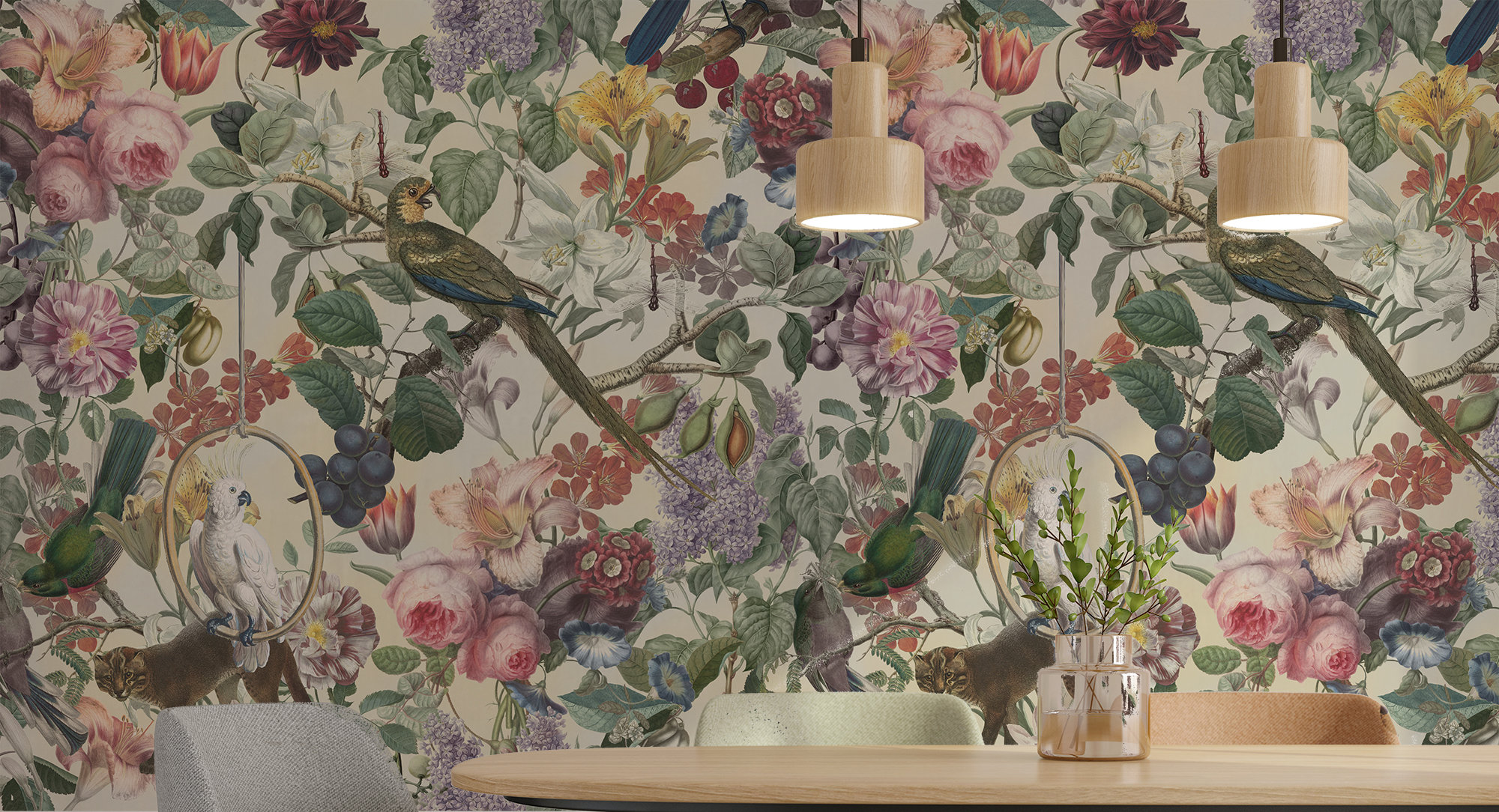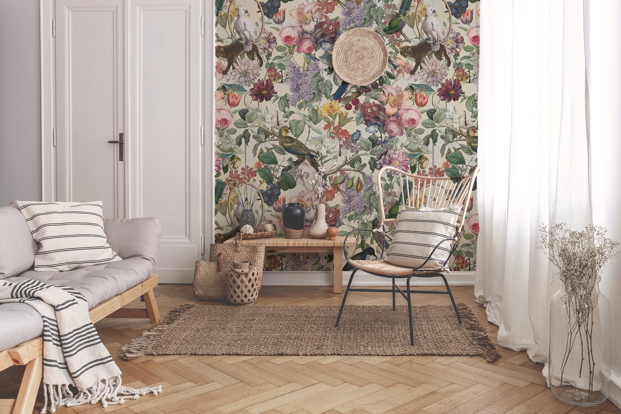 Meet our elegant Floral Oasis Wallpaper, where you will feel like you have stumbled upon a tranquil paradise of blooming flowers and lovely birds. Immerse yourself in the enchanting scent of various flowers around you. The melodious chirping of talkative birds will transport you to a tranquil paradise inside your home. Designed with a soothing cream-coloured base, this versatile wallpaper seamlessly complements any interior design style and furnishing, adding vibrancy and serenity to any space. Once it decorates your walls, you will have difficulty leaving the comfort of your environment. You will be eager to witness this masterpiece decorating your living space with its user-friendly application and superior paper quality. We offer 2 types of grades to suit your preferences: timeless vinyl paper for a classic application and adhesive paper for added convenience. Set the stage for an oasis-like environment in your home with our stunning Floral Oasis Wallpaper.