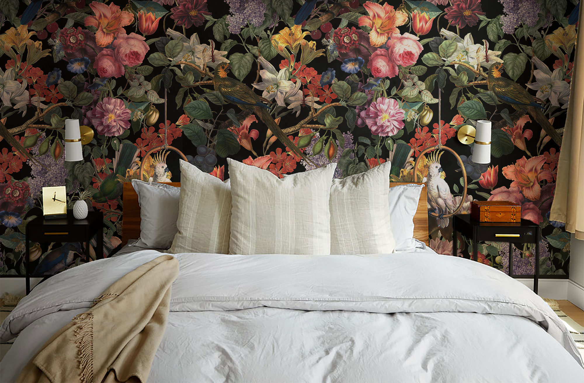 Step into an atmospheric world where deep shadows embrace the vivid intensity of a hidden garden. This moody maximalist mural features hand-painted blooms, lush greenery, and exotic birds perched among the vines. It is a bold, high-definition visual that brings a sharp, exotic energy to your walls. Designed for visionary spaces, every detail tells a story of untamed elegance and timeless heritage. A powerful signature for an interior with a sophisticated soul.