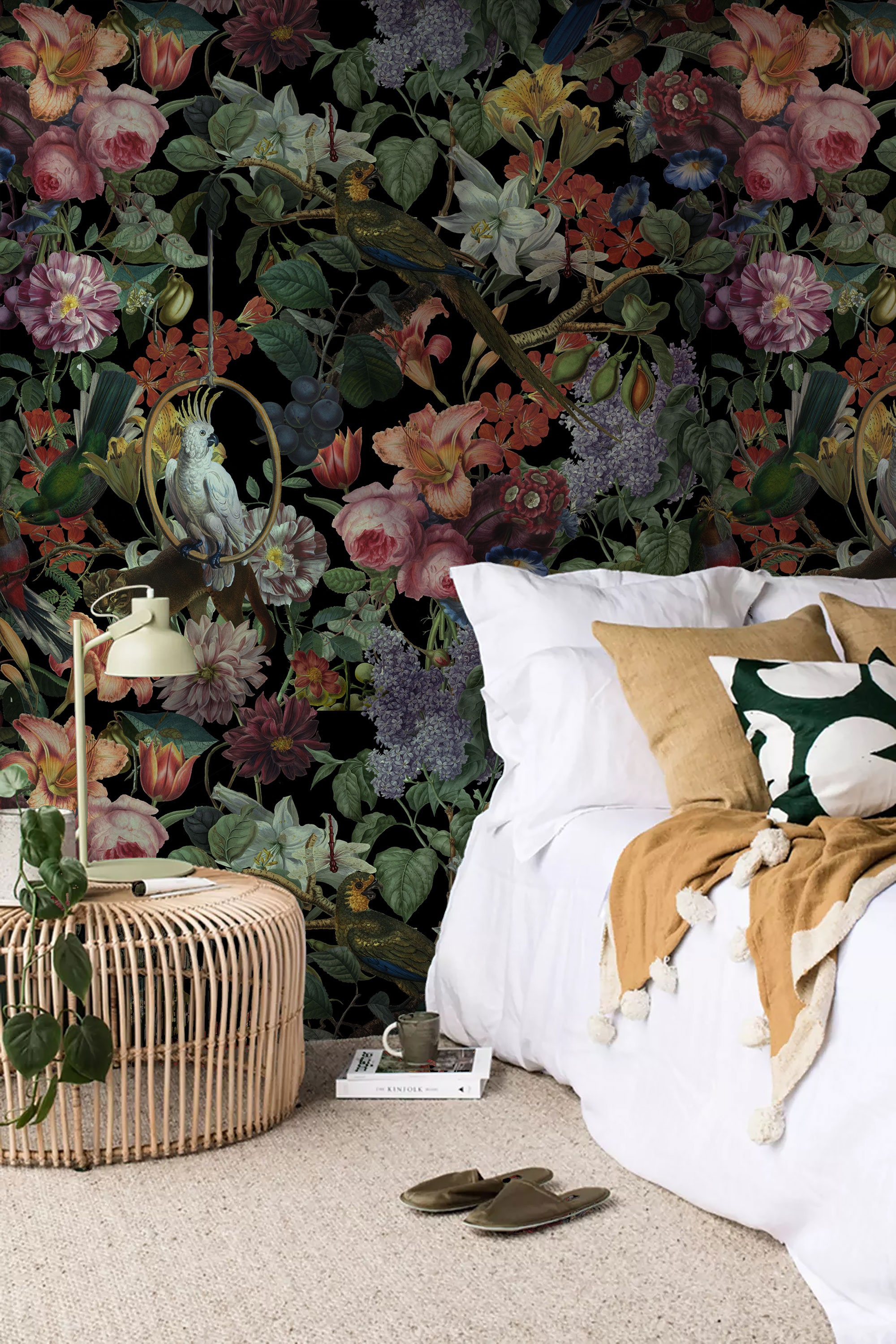 Moody Dark Floral Wallpaper • Vintage Exotic Bird & Vibrant Bloom