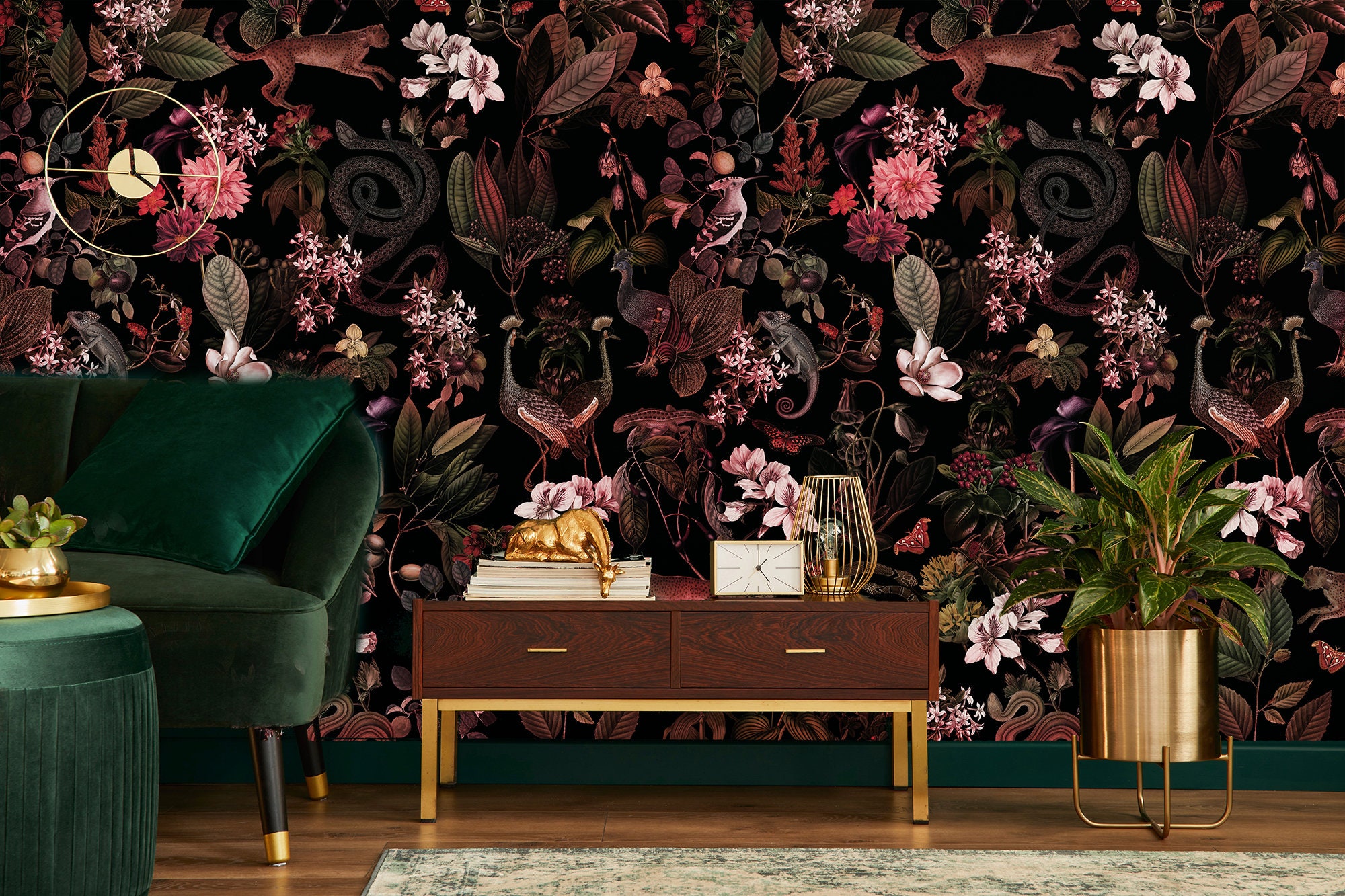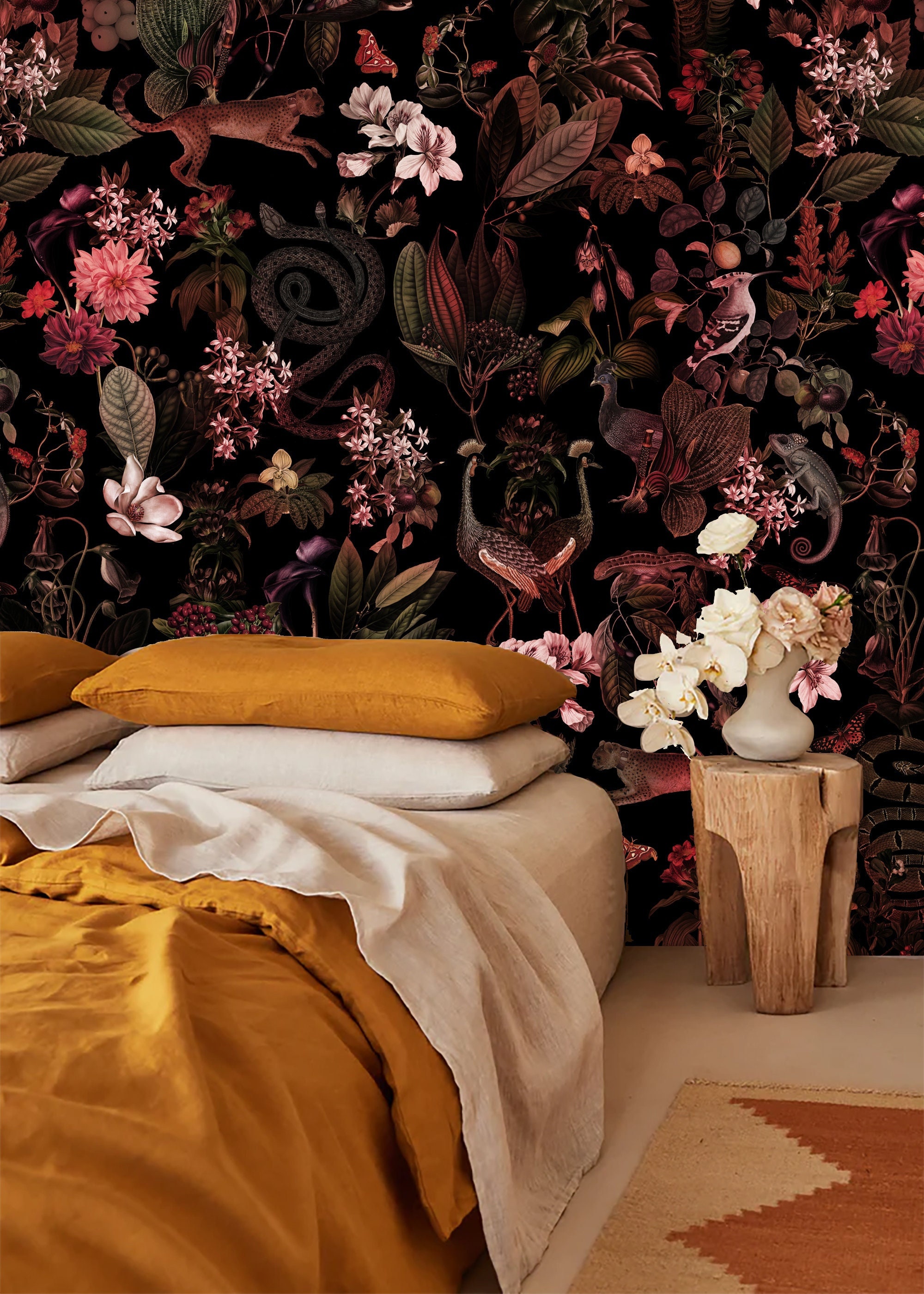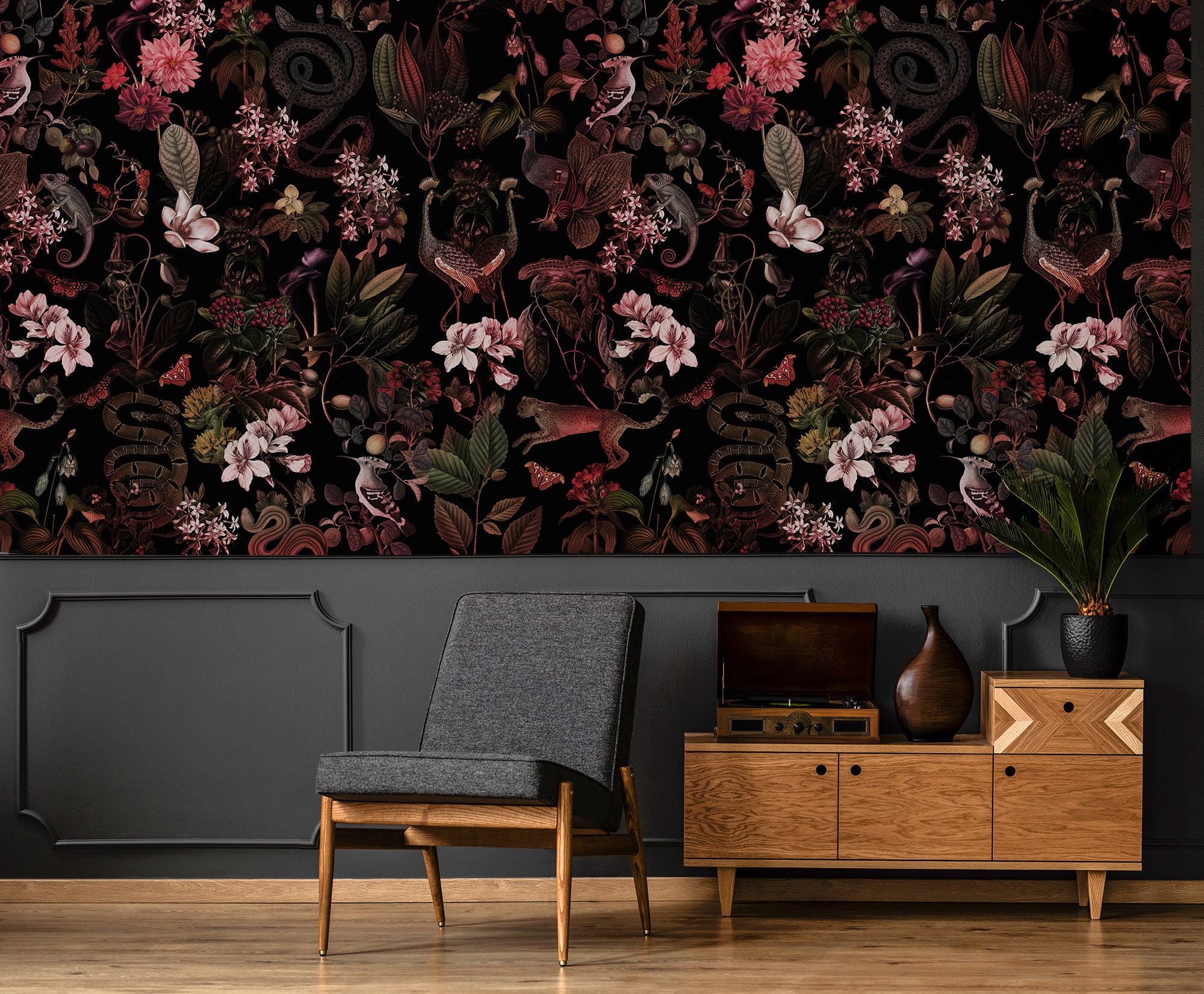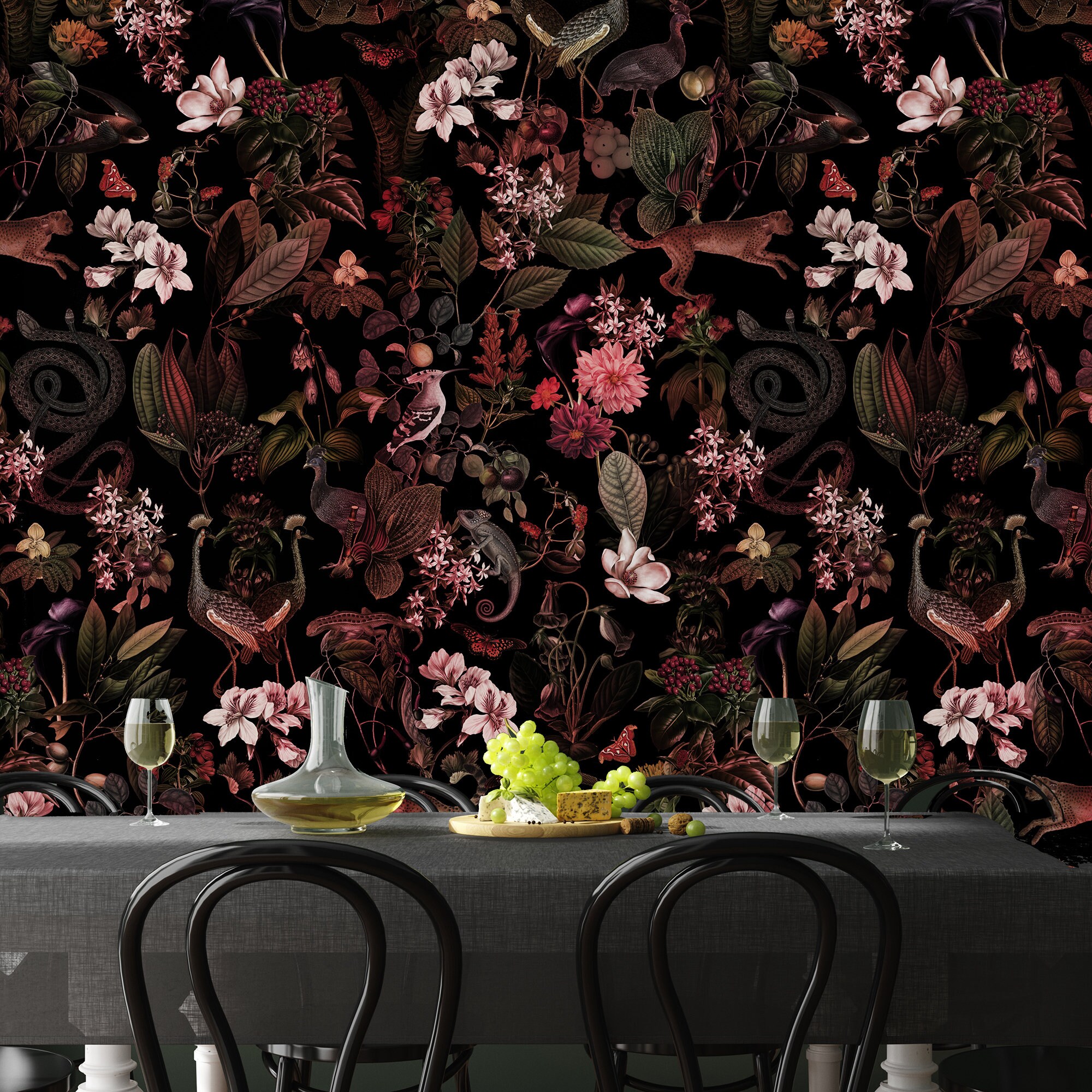 A Nature Lover's Dream:Removable Botanical Wallpaper Featuring Dark Plants,Birds,Cheetahs,Snakes and More,peel and stick,self adhesive,vinly