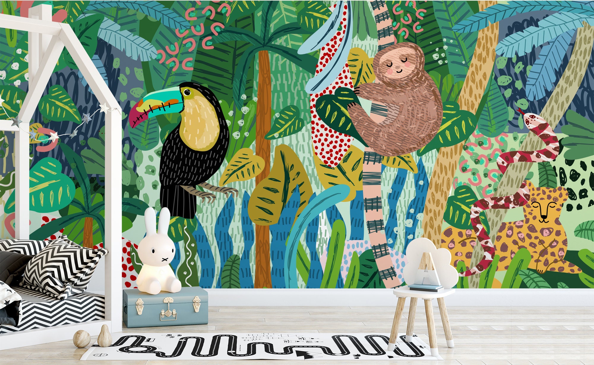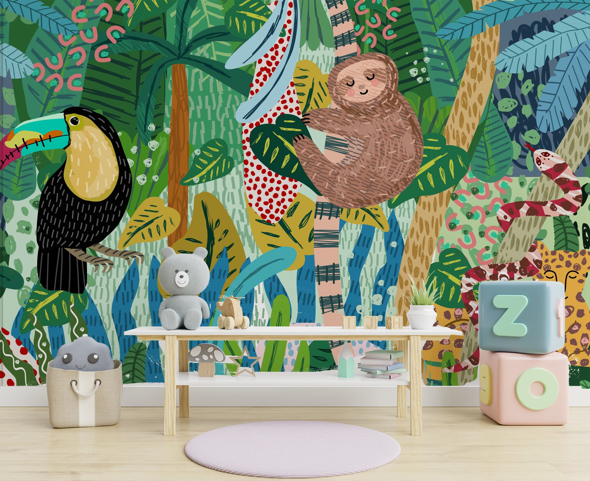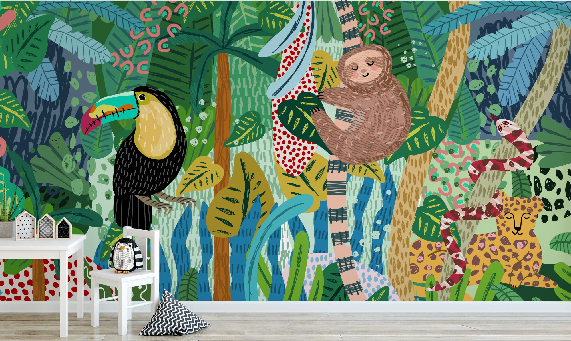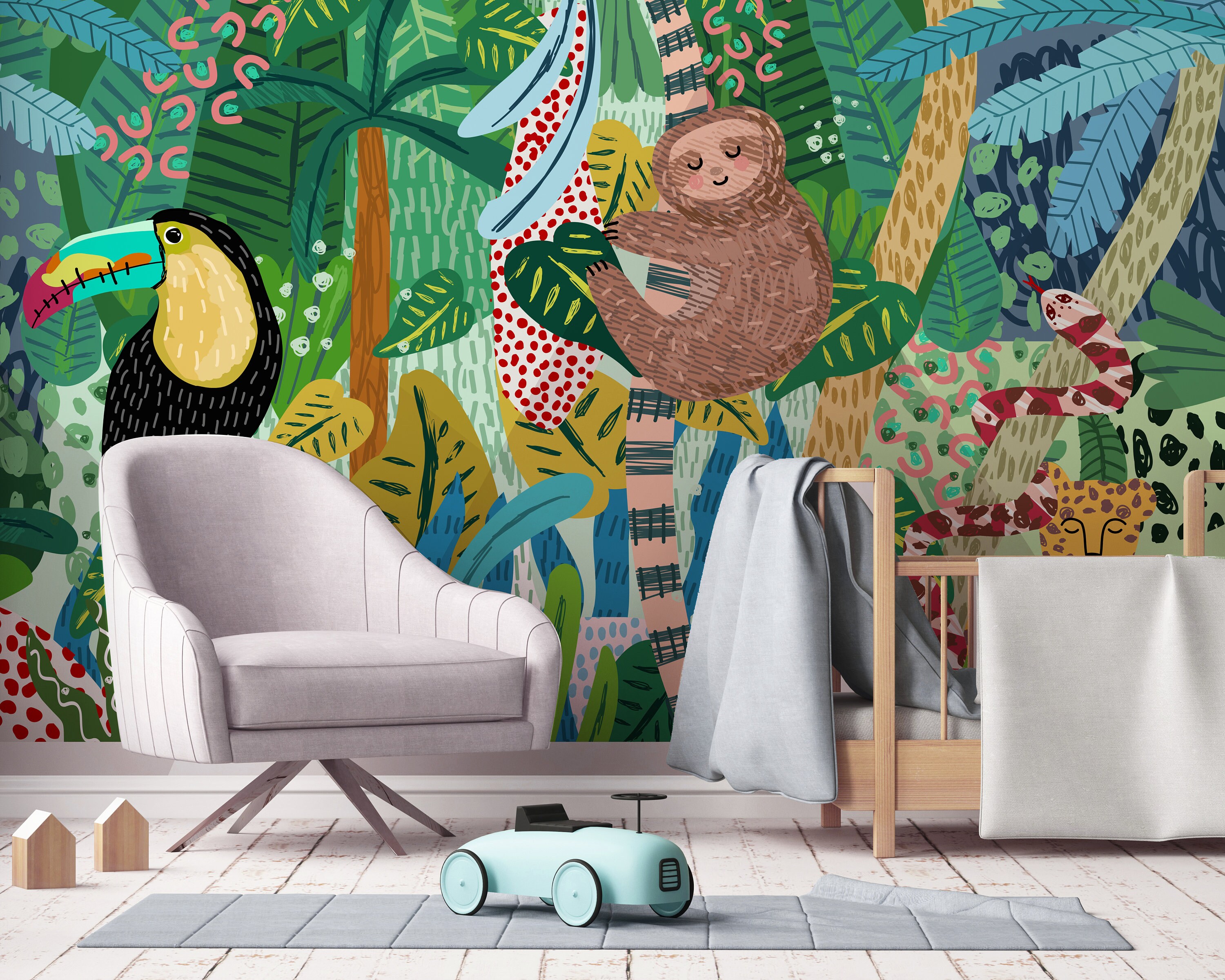 Transform your little one's room into a colorful jungle oasis with this adorable Baby Animal Safari Jungle wallpaper! Featuring cute cheetahs, snakes, sloths, and parrots hand-drawn all over, this wallpaper will bring a sense of whimsy and adventure to any space. Perfect for creating a cozy and playful atmosphere in your child's room, this wallpaper is the perfect addition to any safari-themed decor. Let your child's imagination run wild with this charming and vibrant jungle wallpaper!