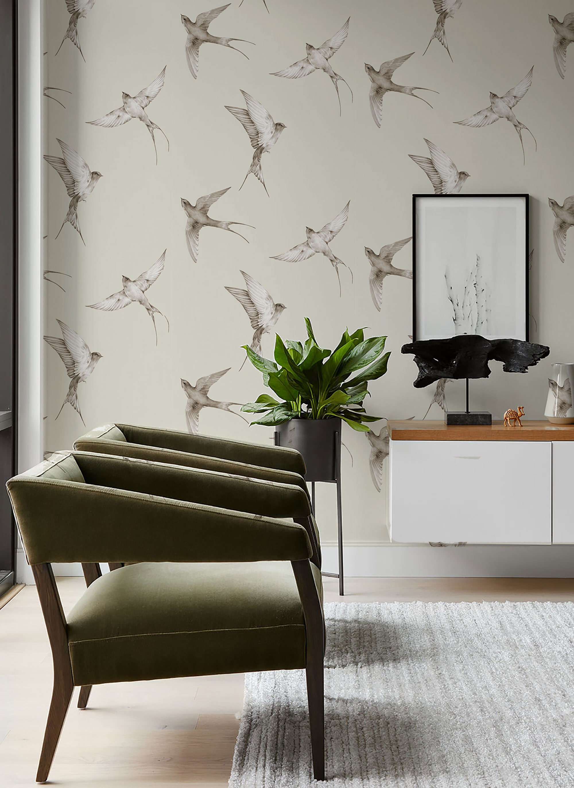 Transform your space with this vintage-inspired bird wallpaper featuring a charming swallow pattern. Set against a cream background, this lovely decor piece embraces the timeless beauty of nature. Not only is the high-quality paper easy to install, it also ensures flawless application. Flying swallows decorate your walls, creating a charming vintage look. Elevate your interior design with this stunning wallpaper that effortlessly combines comfort and style.