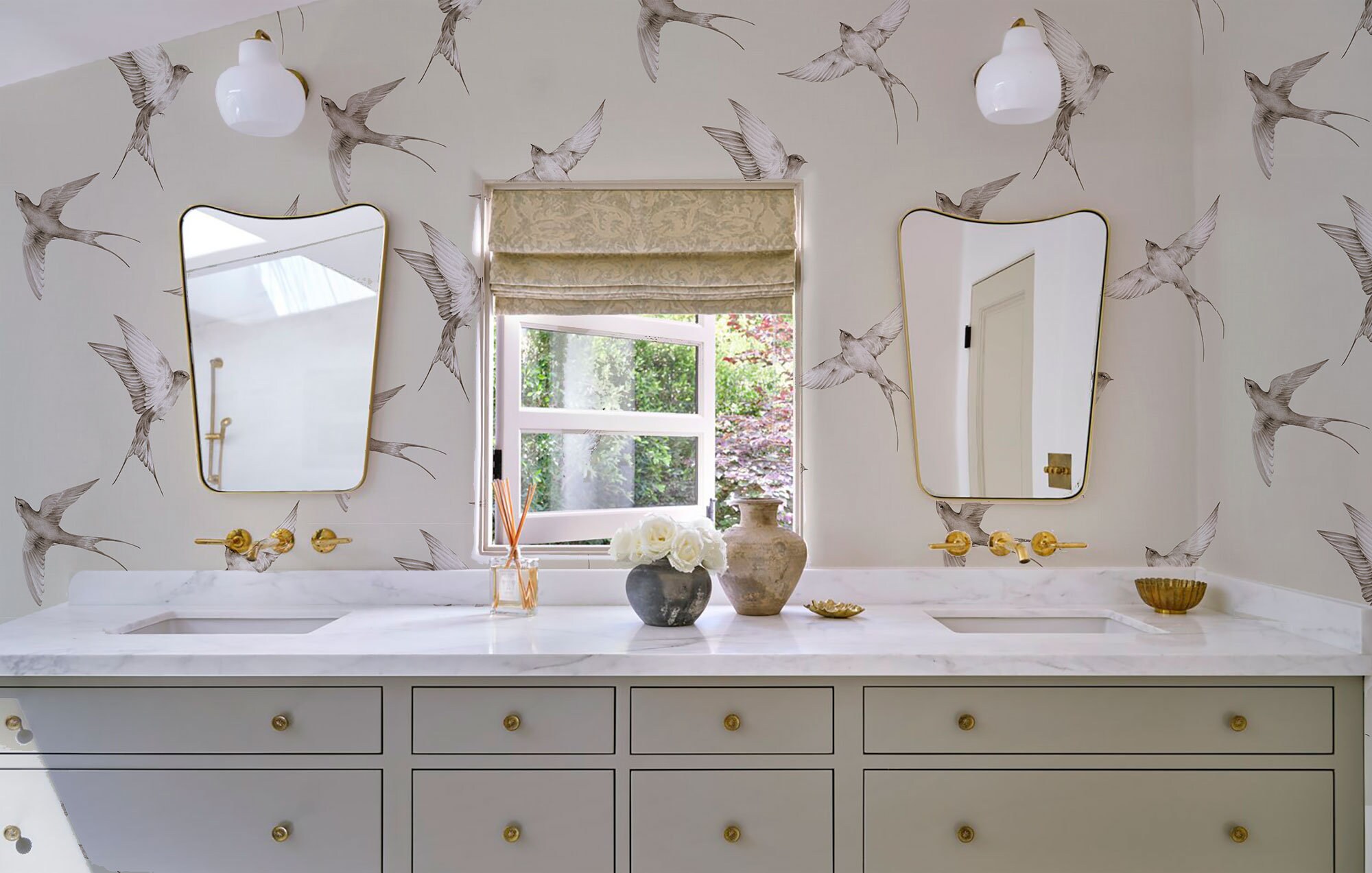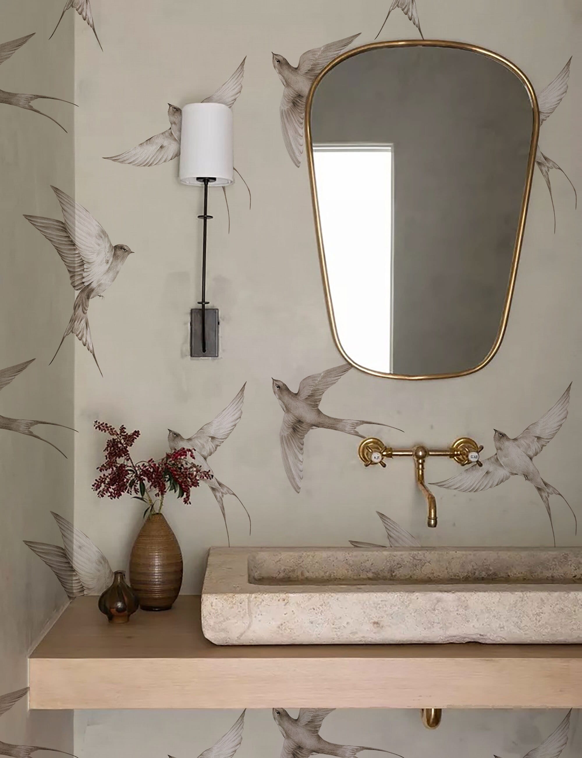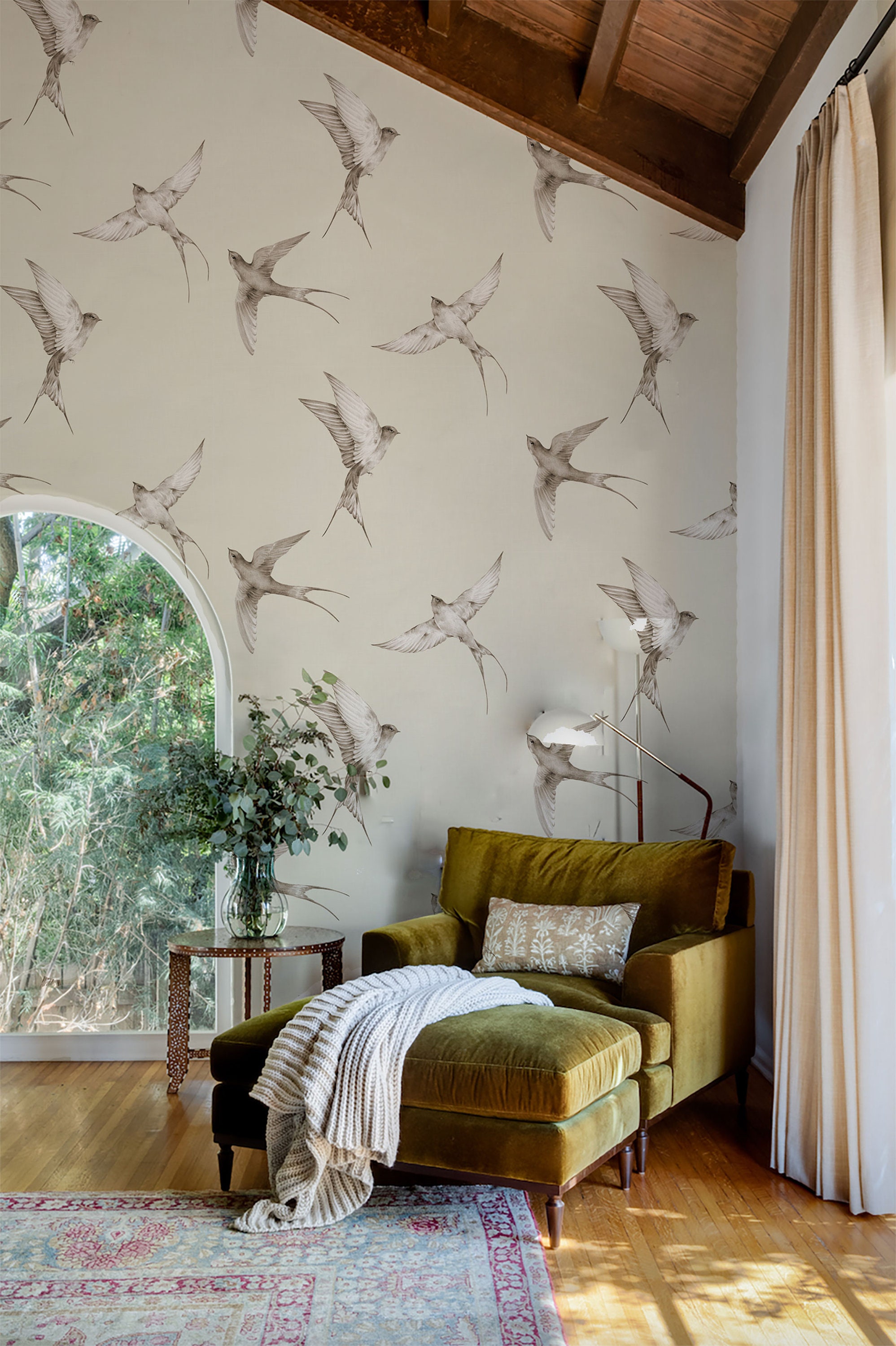 Vintage Swallow Bird Wallpaper: Hand Drawn Boho Wall Mural