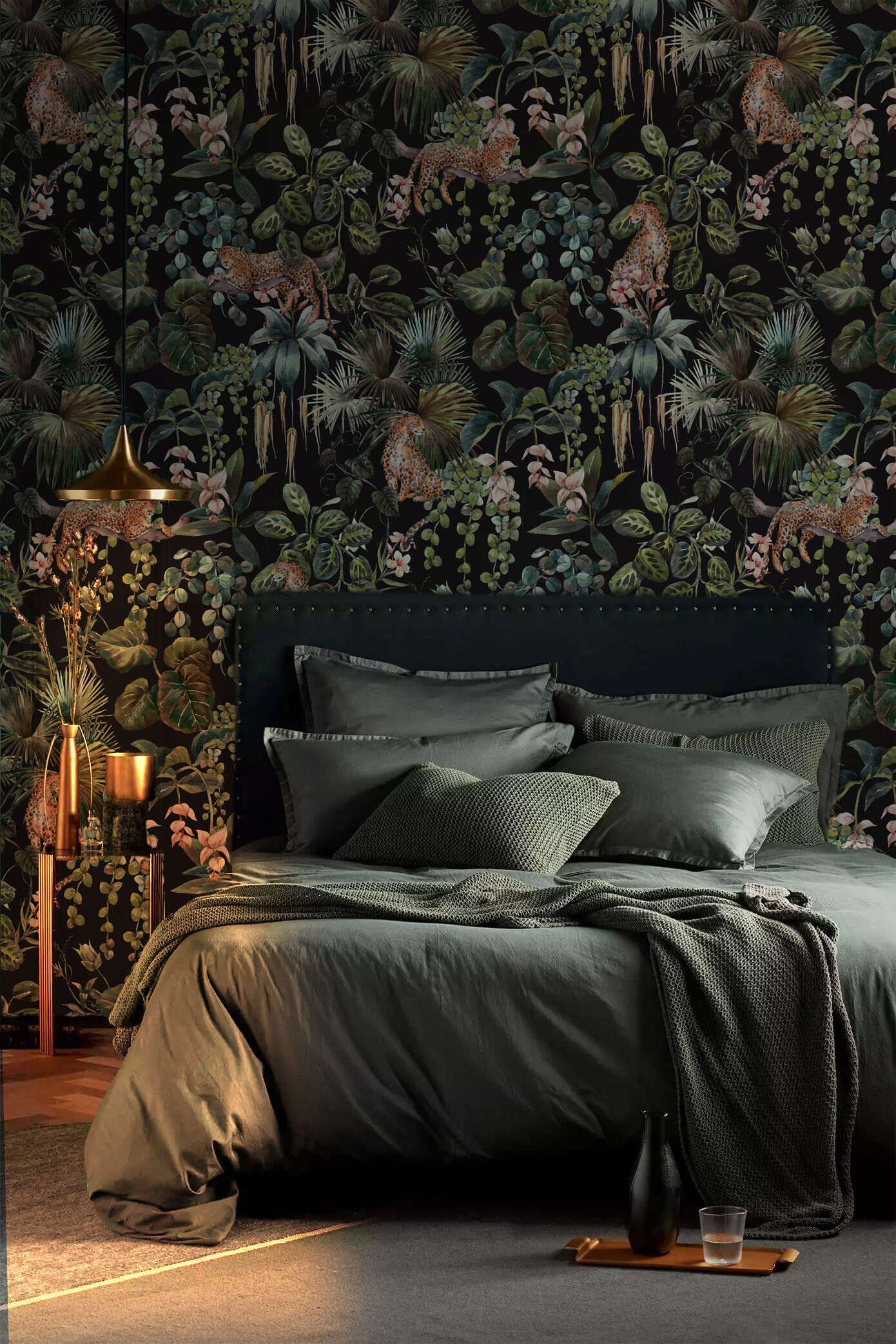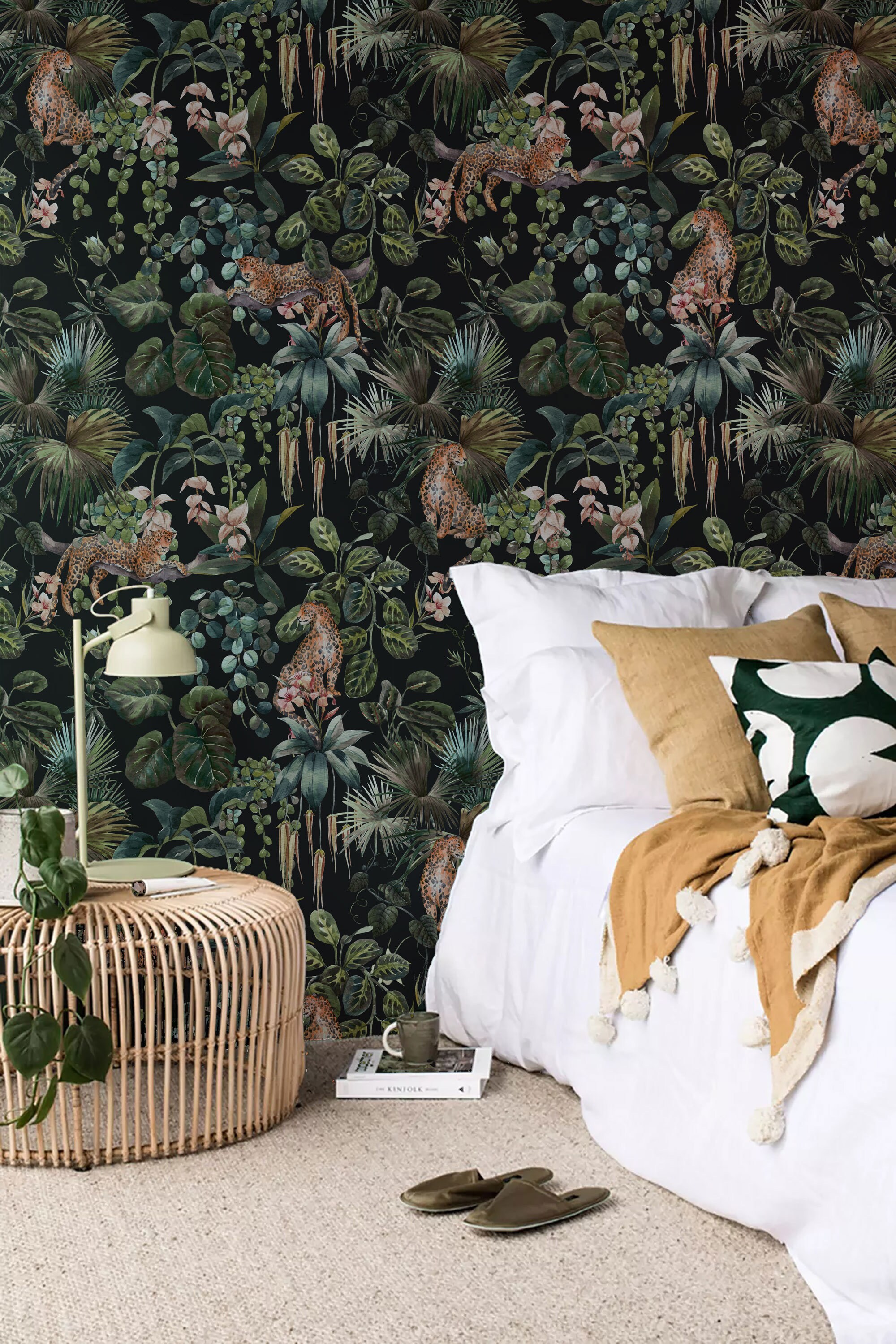Introducing our Dark Botanic Wallpaper, where vintage charm meets wild elegance! This custom-designed wallpaper features a captivating blend of dark green nature motifs, including vintage-inspired depictions of cheetahs. Adorned with lush leaves and spft pink flowers, this forest-themed wallpaper is sure to add a touch of mesmerizing beauty to any space. Made with removable pre-pasted paper, it offers easy application and removal. You can also opt for the peel and stick option for added convenience. Embrace the allure of the jungle with our Dark Botanic Wallpaper and transform your room into a captivating oasis.