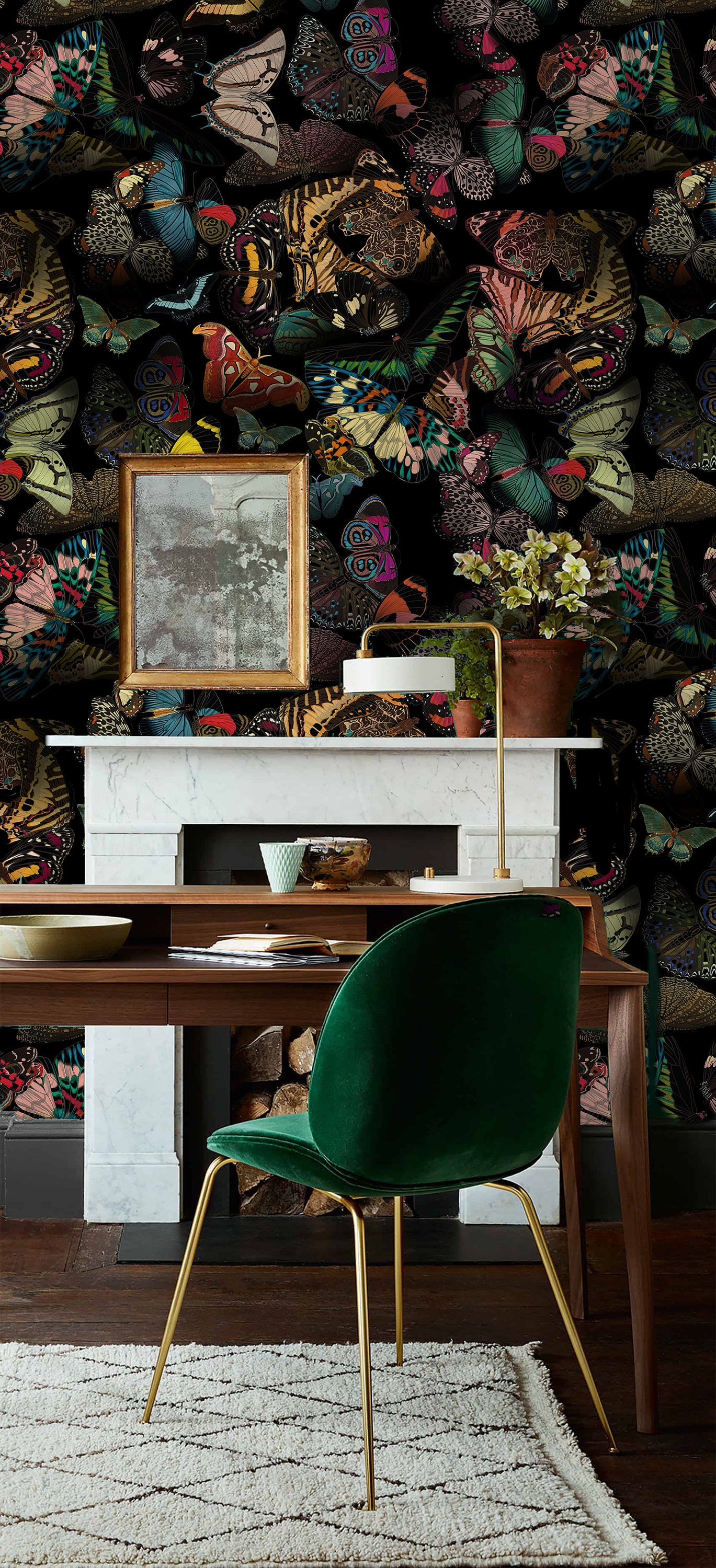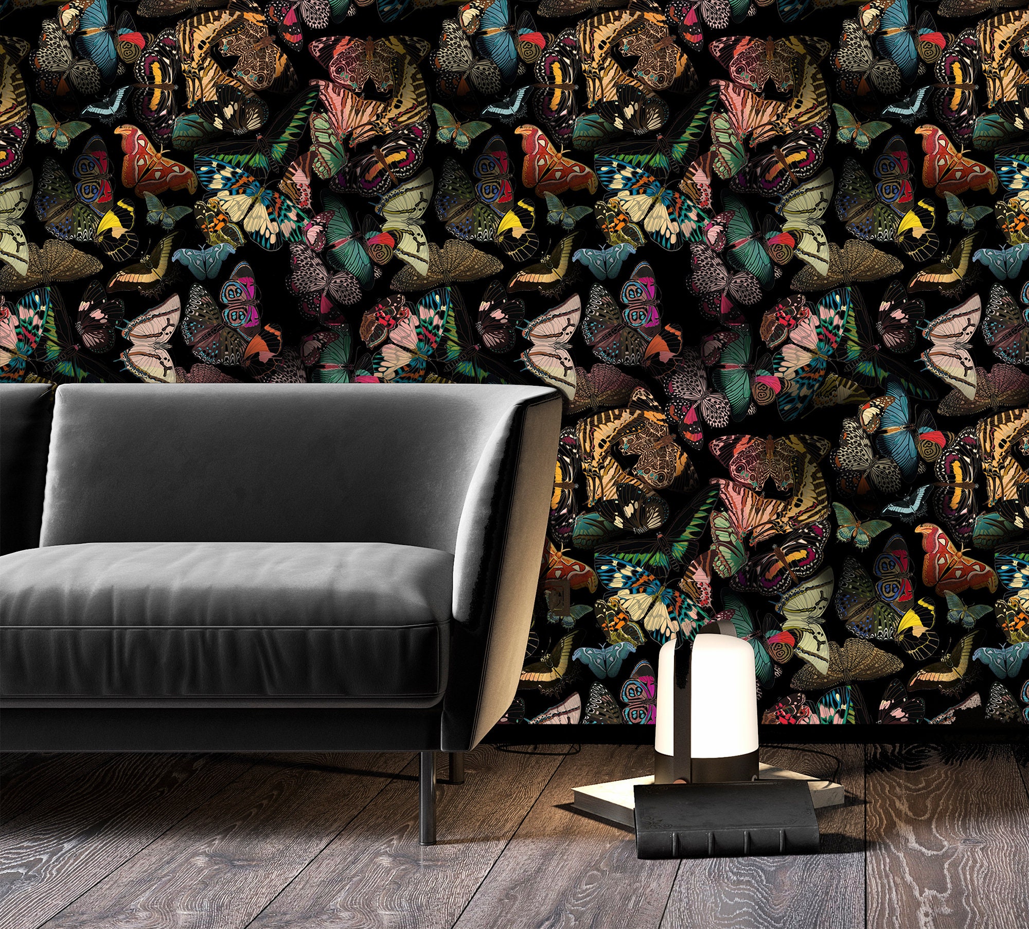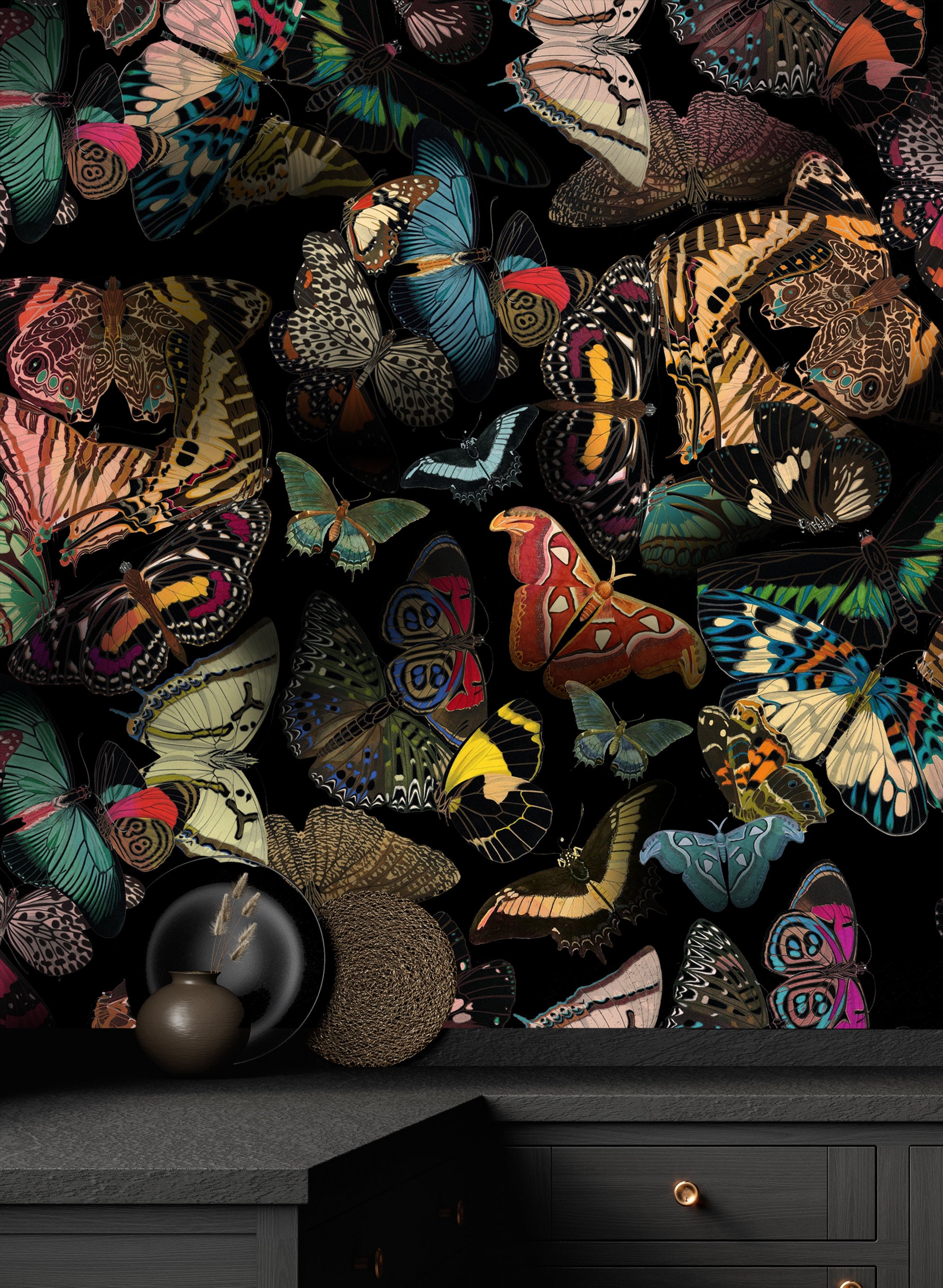 Dark Delight: Hand-Drawn Colorful Butterflies in Flight, vintage butterfly wallpaper, self adhesive,removable,high quality,wall mural