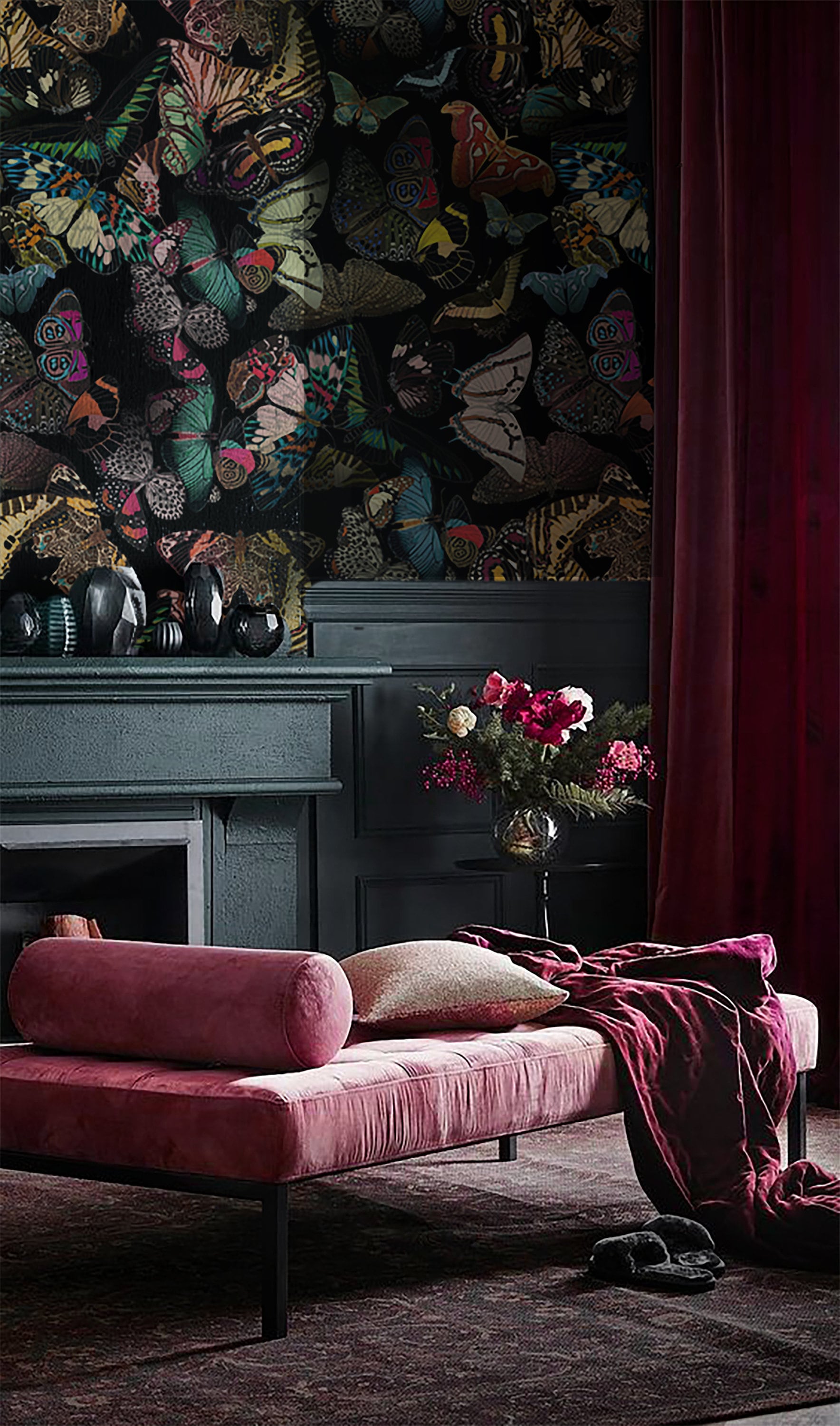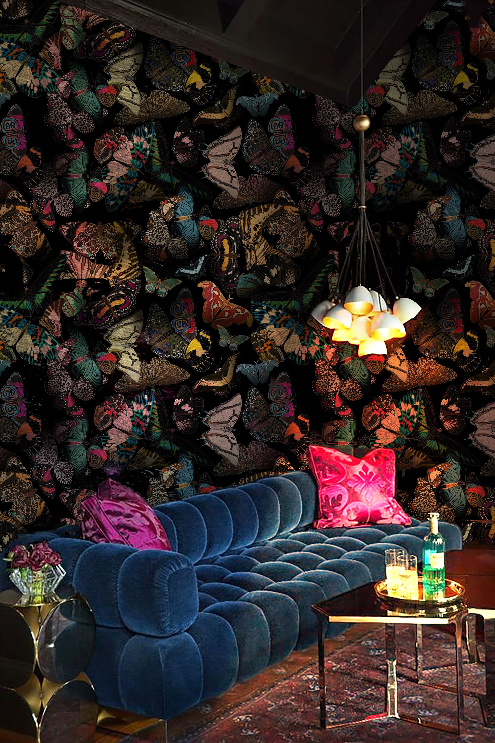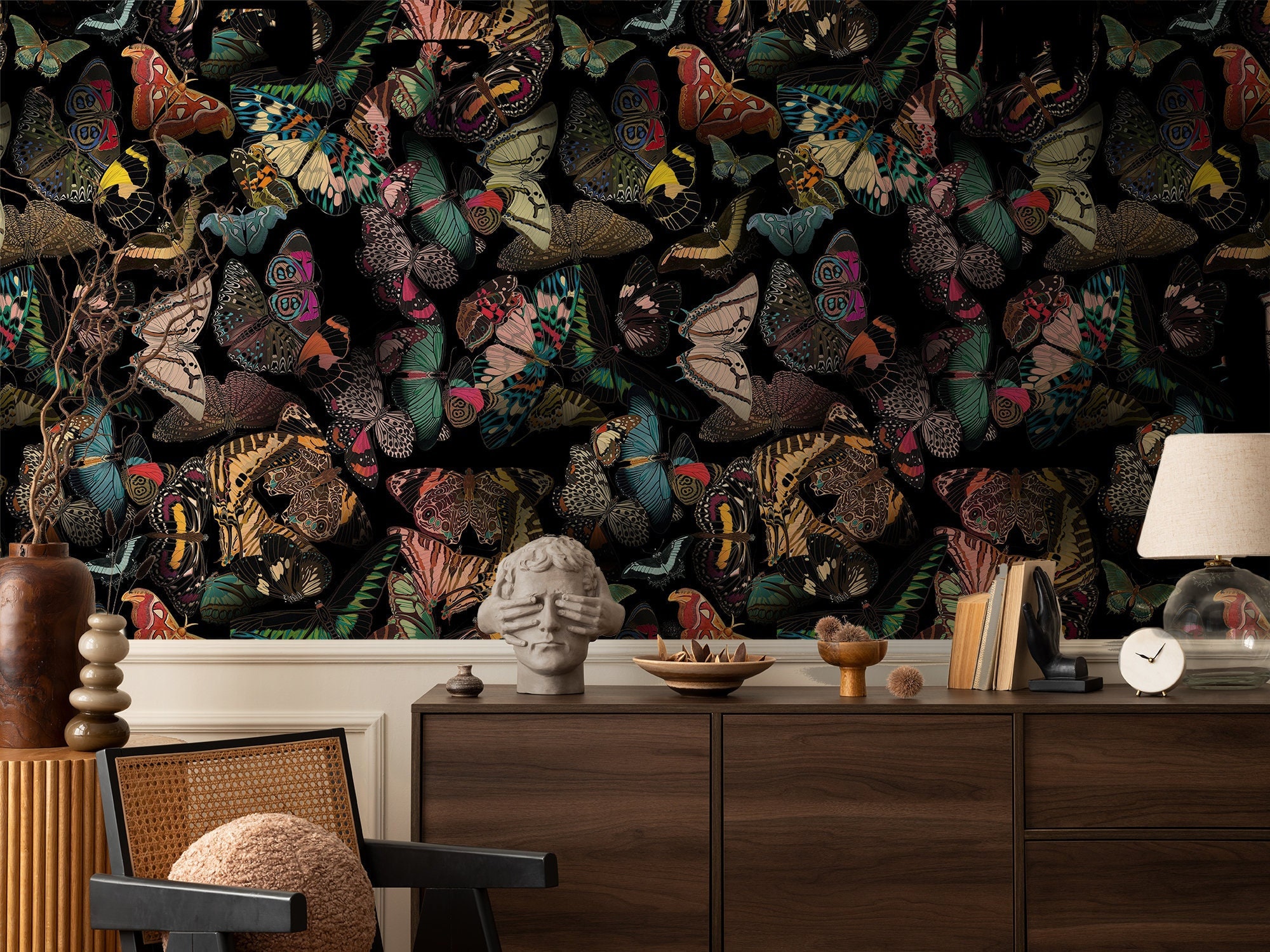 Dark Delight: Hand-Drawn Colorful Butterflies in Flight, vintage butterfly wallpaper, self adhesive,removable,high quality,wall mural