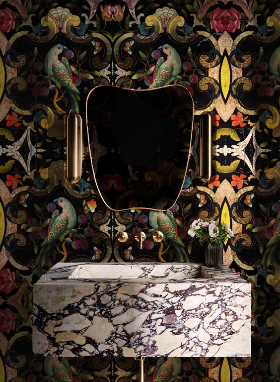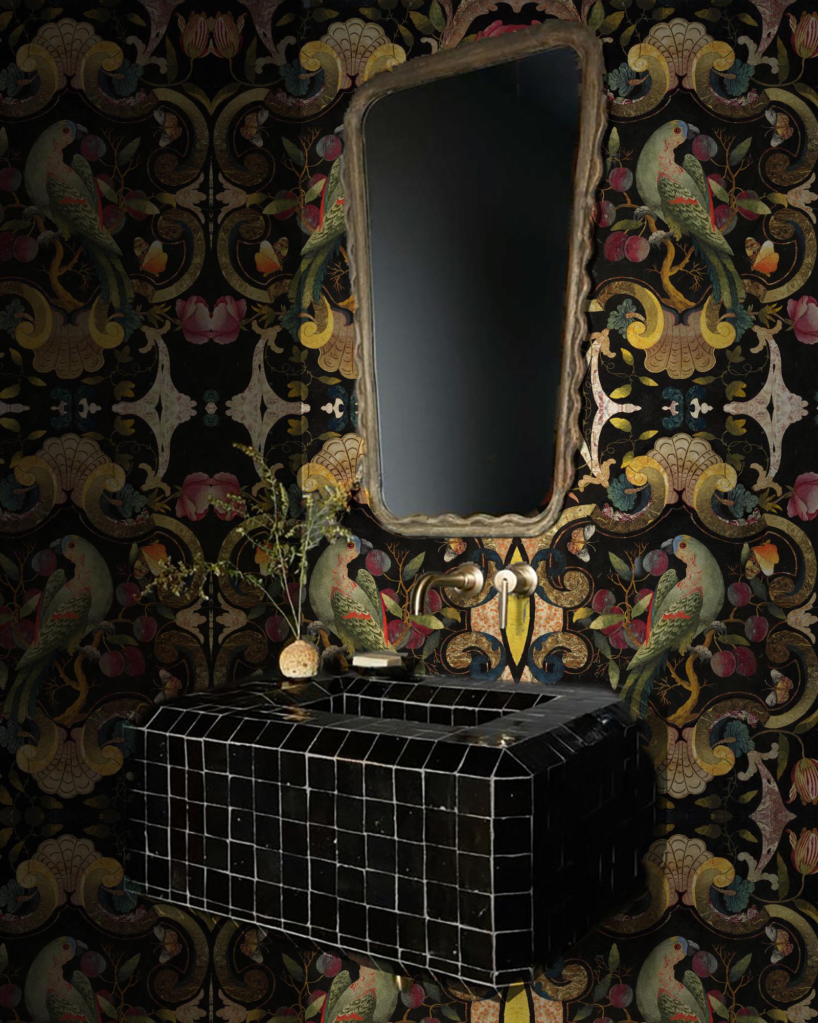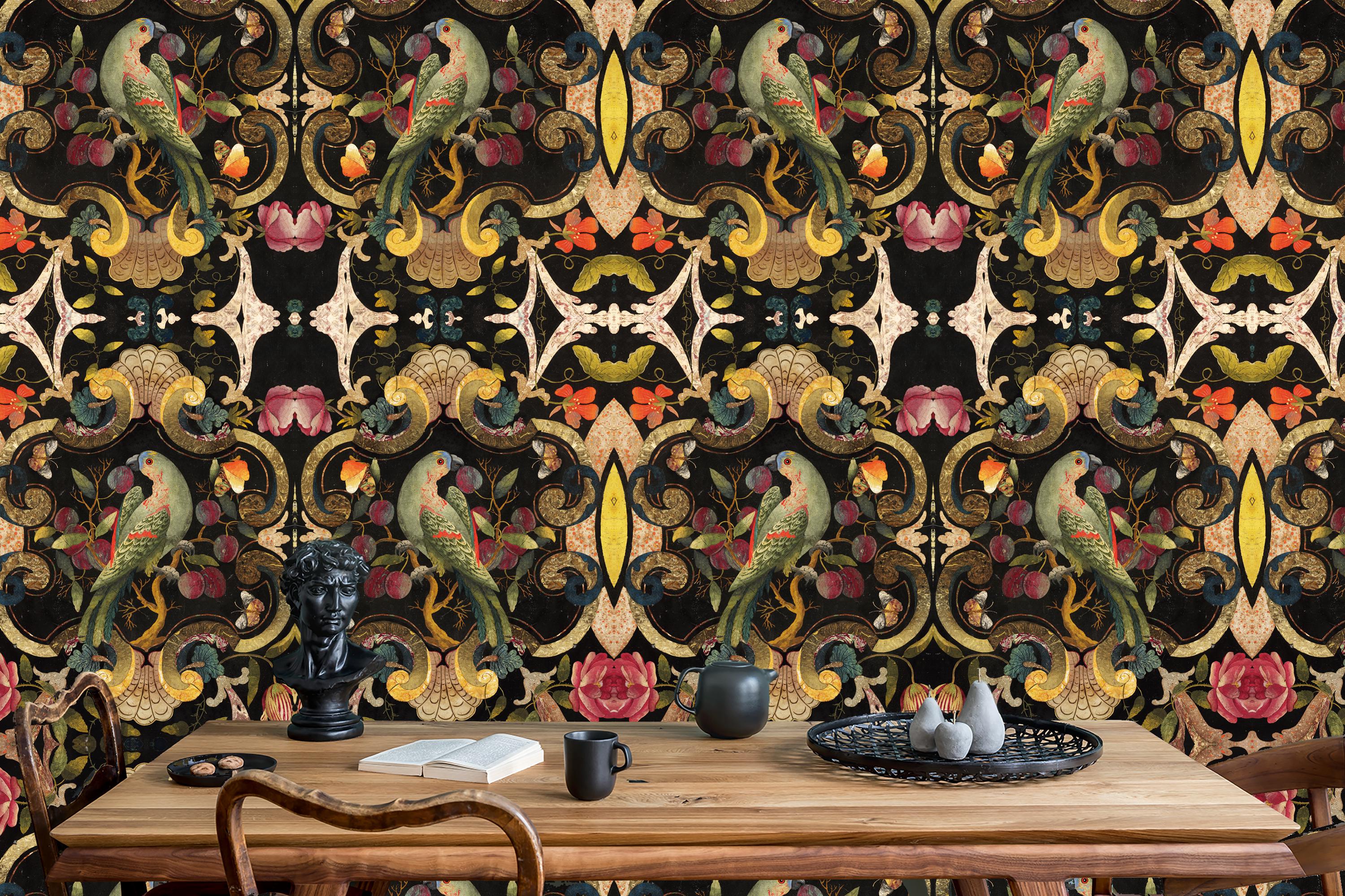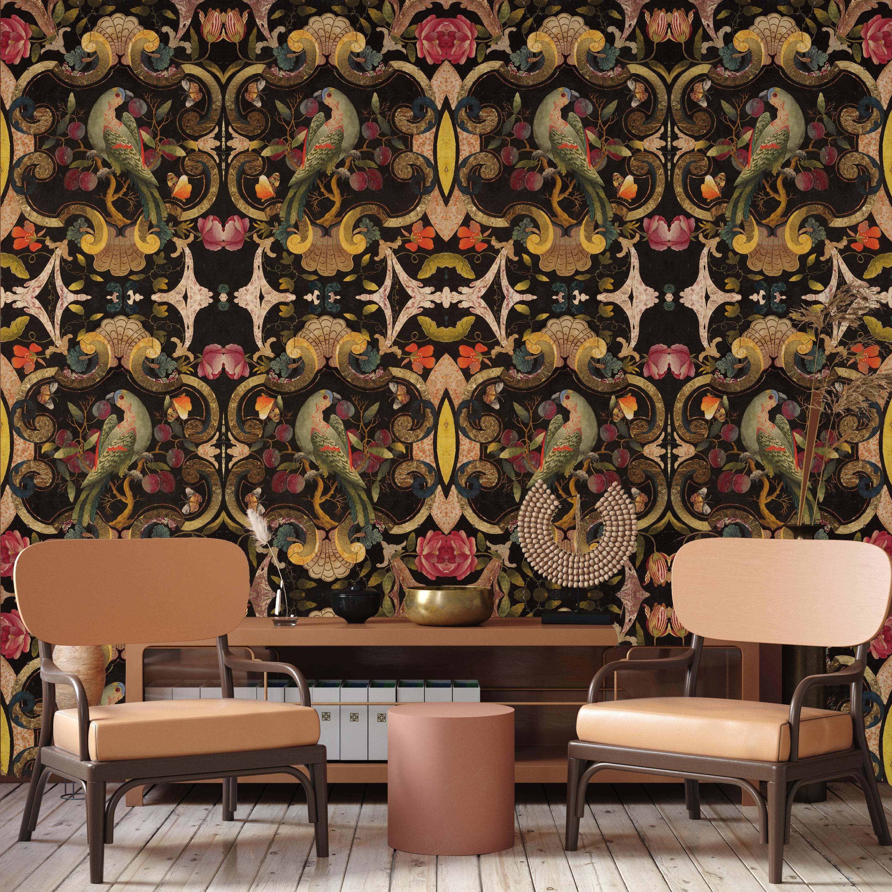 “This elegant pattern merges the grandeur of the Baroque and Rococo eras with modern design. Golden details on a black background, combined with vibrant bird and floral motifs, bring a sophisticated and stylish touch to any space. Perfect for wallpaper, textiles, or decorative products, this design adds a unique charm to every setting.”