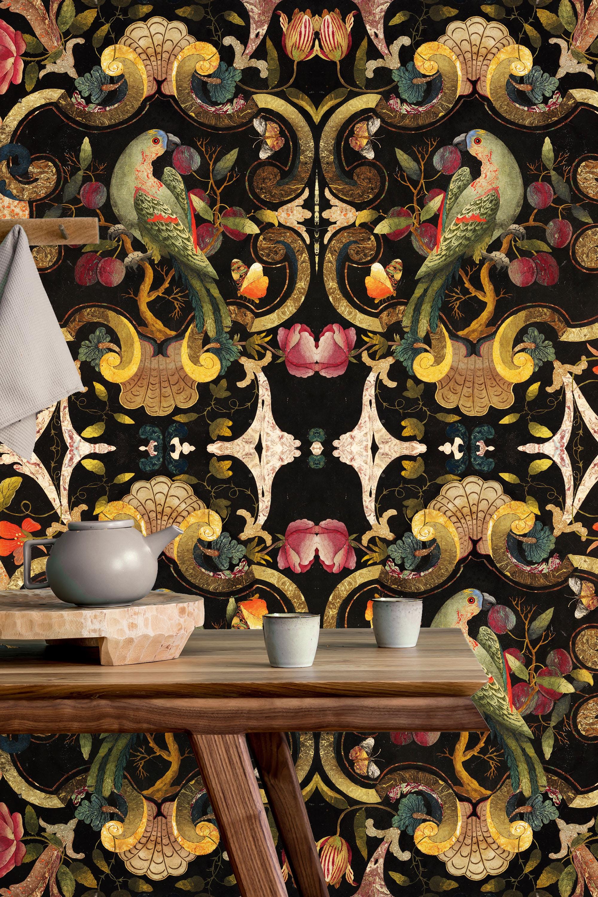 Step into an atmospheric world where the formal elegance of a royal tapestry meets the raw intensity of a timeless garden. This vintage-inspired mural features a symmetrical composition of noble birds and vibrant, hand-painted blooms framed by ornate heritage motifs. It is a bold, high-contrast visual that brings a sharp, intellectual character to your walls. Designed for visionary spaces, every vivid detail tells a story of untamed grace and timeless luxury. A powerful, dark-toned signature for an interior with a sophisticated and daring soul.