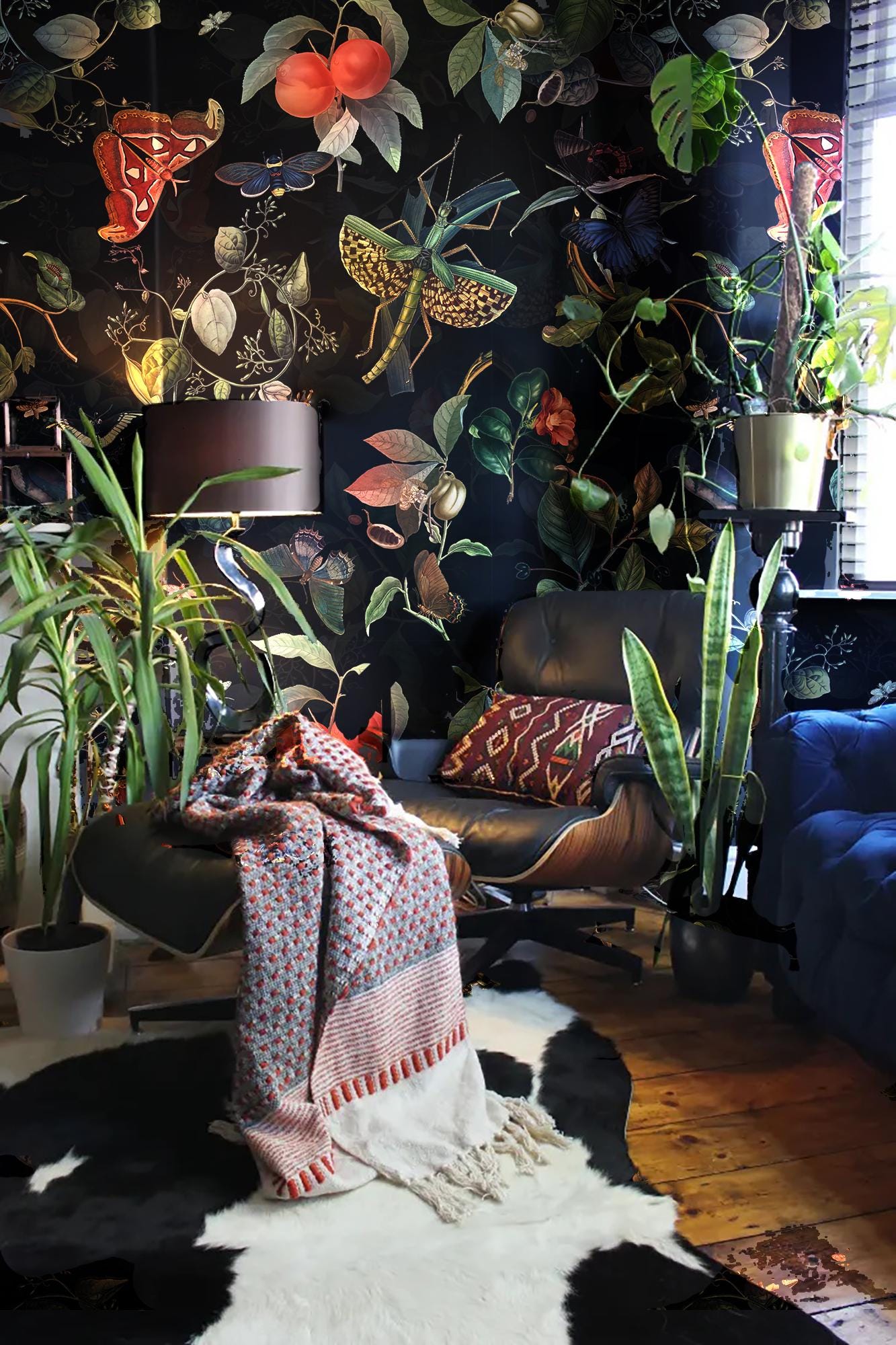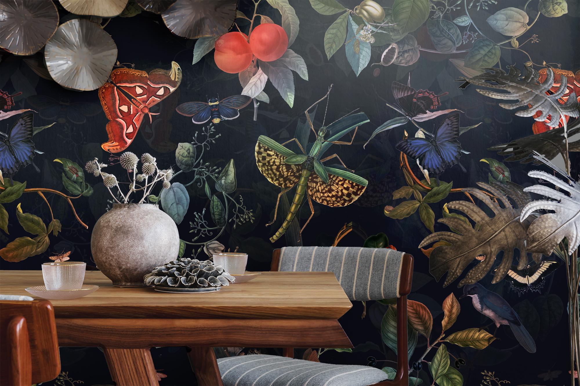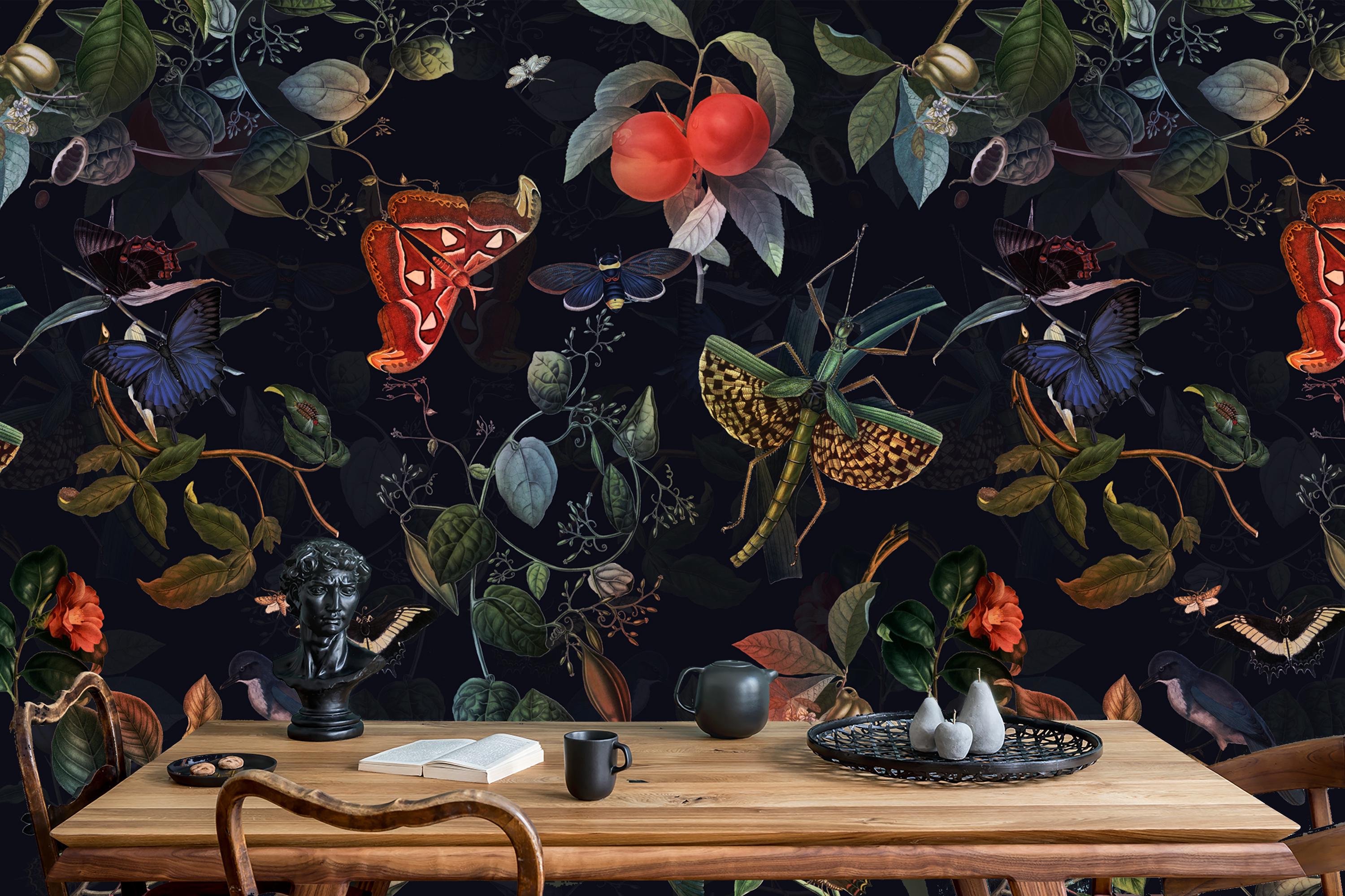 Enhance your space with this mesmerizing Dark Botanical Wallpaper. Immerse yourself in the colorful forest mural, as it showcases an enchanting interplay of vibrant hues. Adorned with striking images of this design captivates with its exotic butterfly motifs. The lush foliage and charming mural add a touch of whimsy. Crafted from high-quality vinyl, this peel and stick wallpaper offers easy installation and durability. Let the floral wonders and fascinating creatures come to life on your walls with this unique and captivating piece. Perfect for bringing a touch of nature and adventure into your home, this Dark Botanical Wallpaper is sure to transform any room into a magical sanctuary.