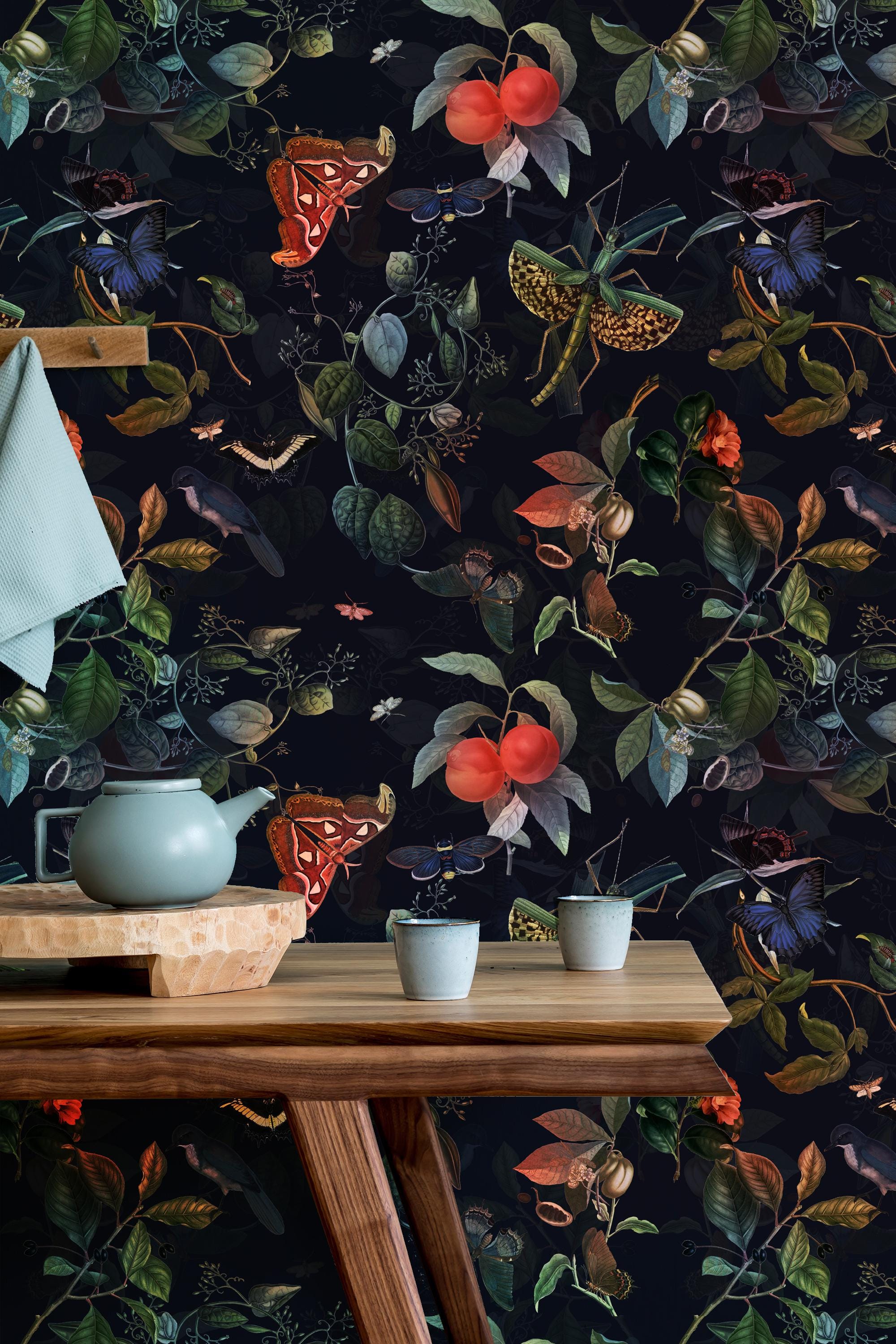 Escape the Jungle:Exotic Butterfly,Flowers on This Dark Botanical Wallpaper,Vintage hand draw plant and bugs,removable,vinyl wallpaper