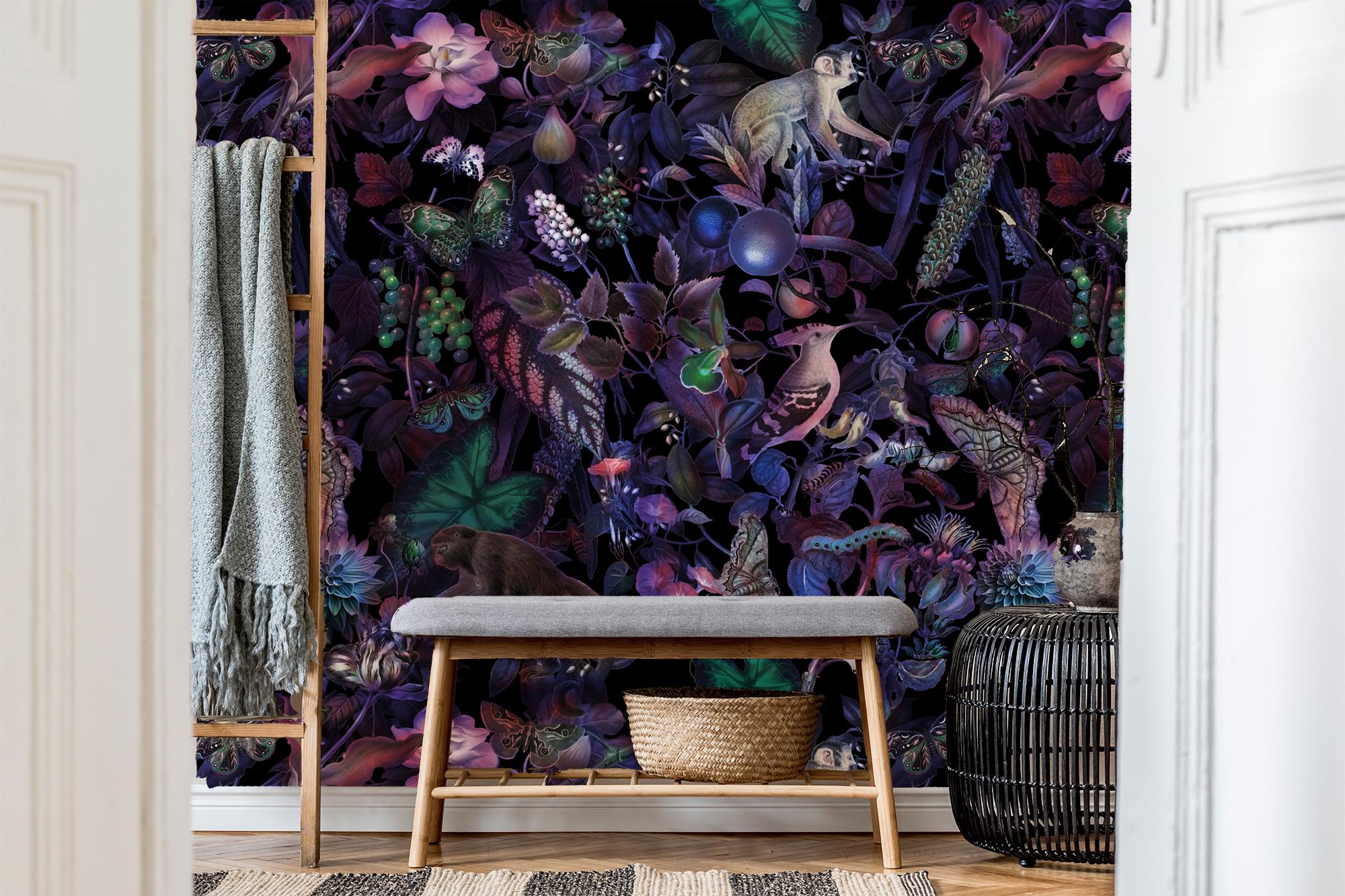 Purple Forest Wallpaper: Exotic Birds & Monkeys, Removable Vinyl