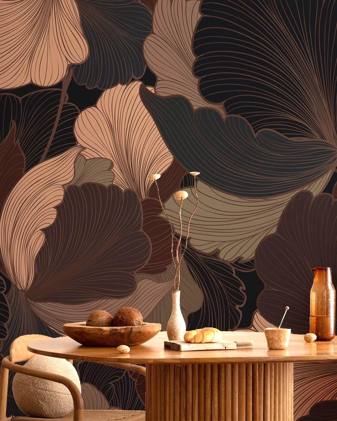This wallpaper brings together rich earthy elegance and timeless form. Featuring abstract botanical shapes in warm brown hues, soft cool blues, and deep charcoal tones, the design creates a modern yet classic visual balance.