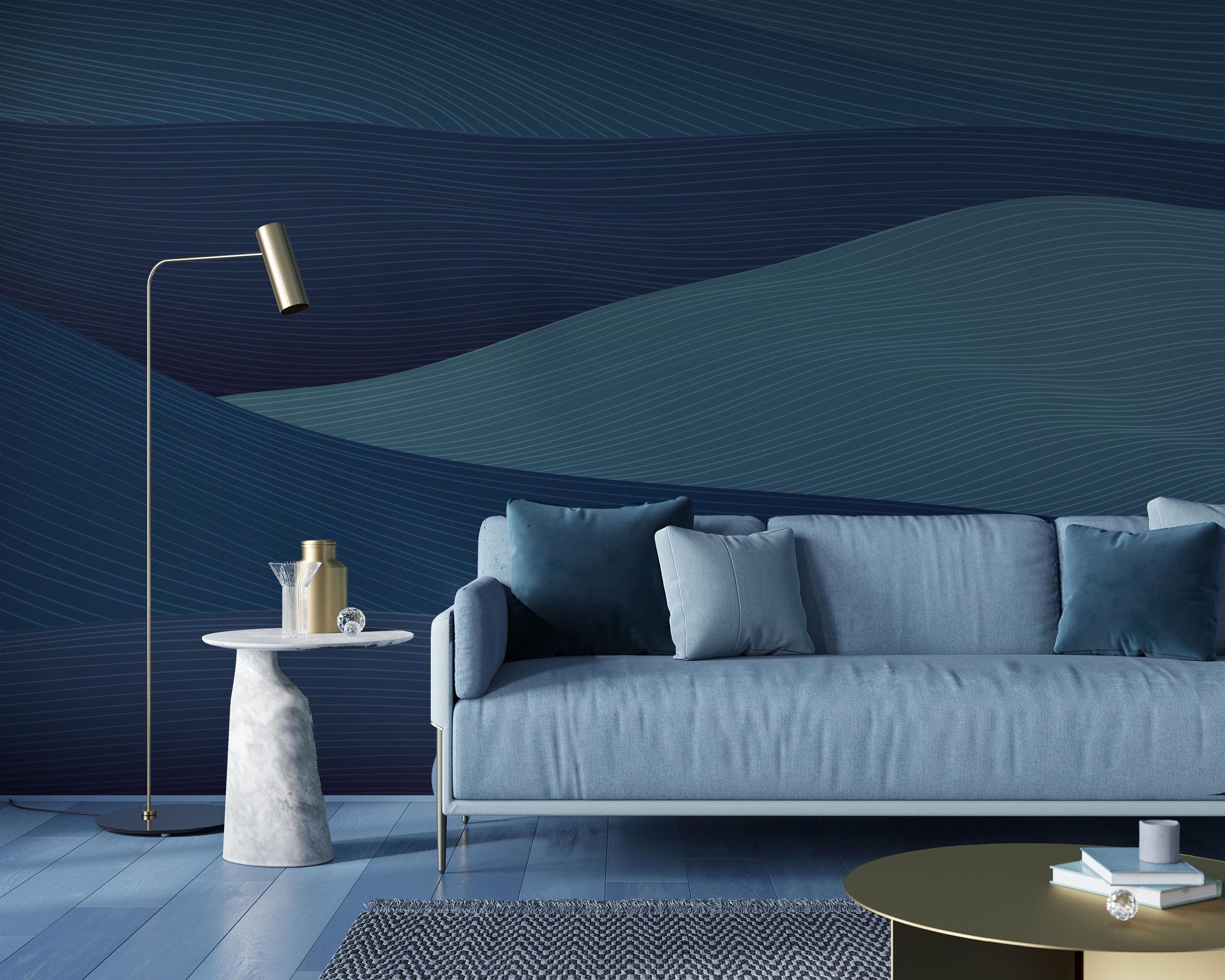 Navy Blue Abstract Line Art Wallpaper: Wavy Sea Peel and Stick Vinyl