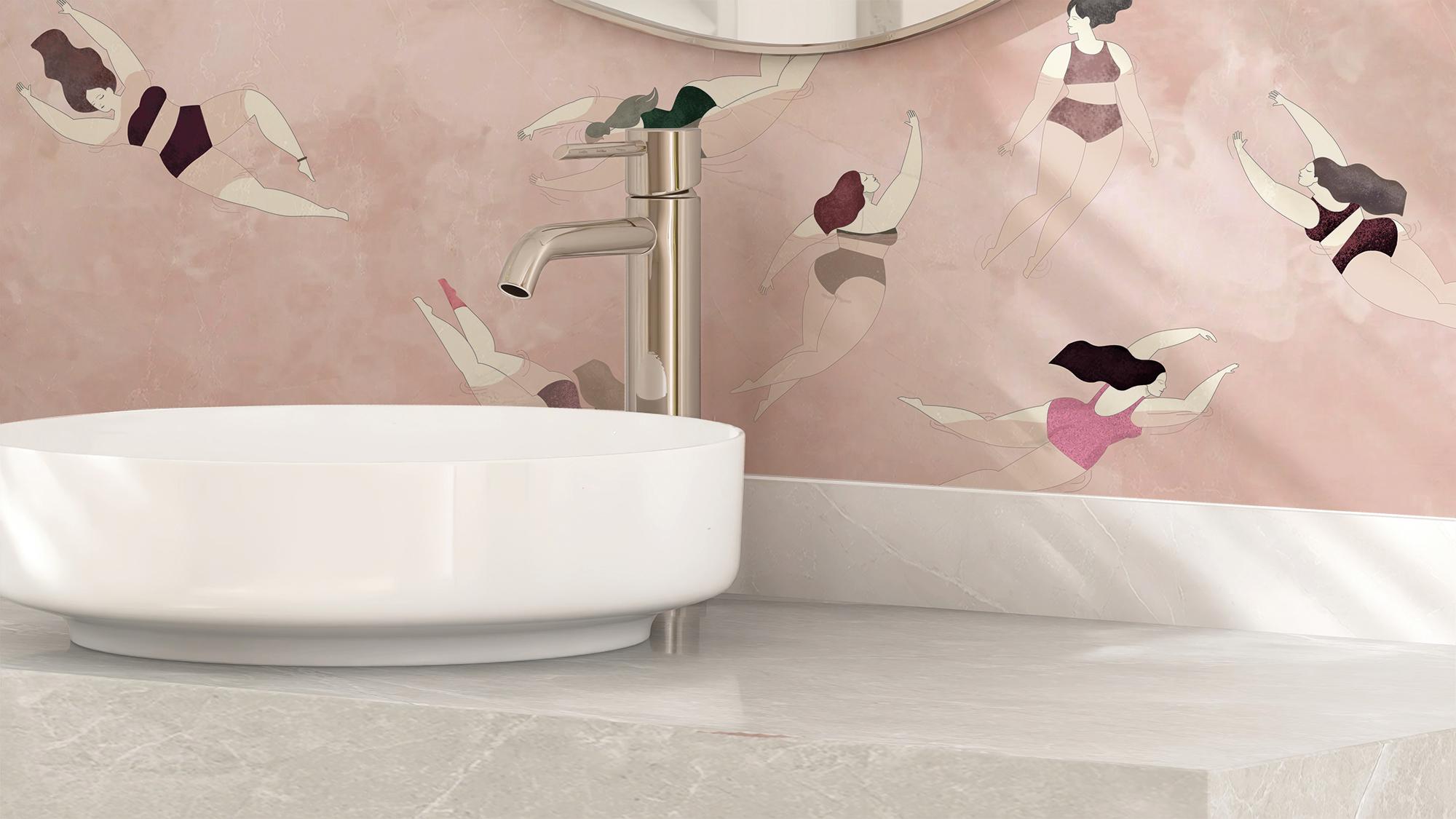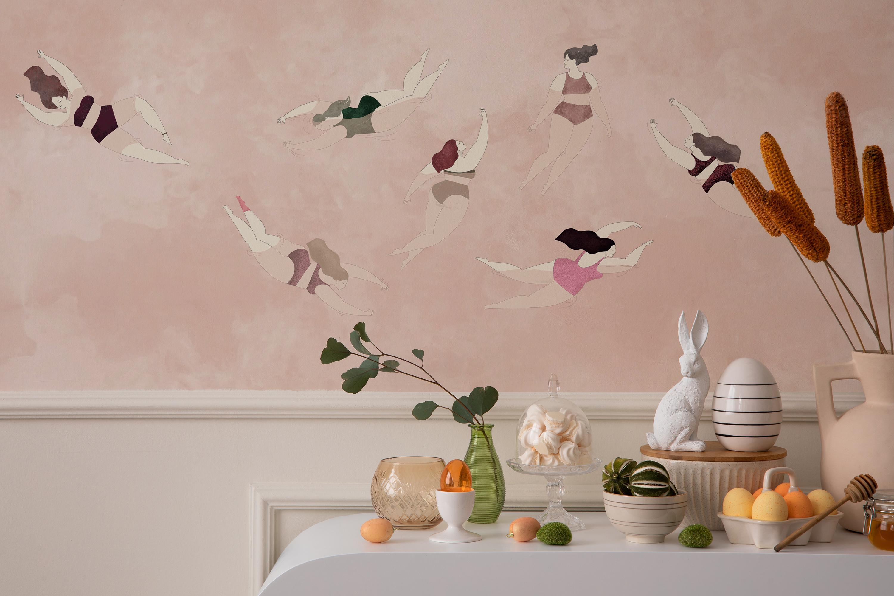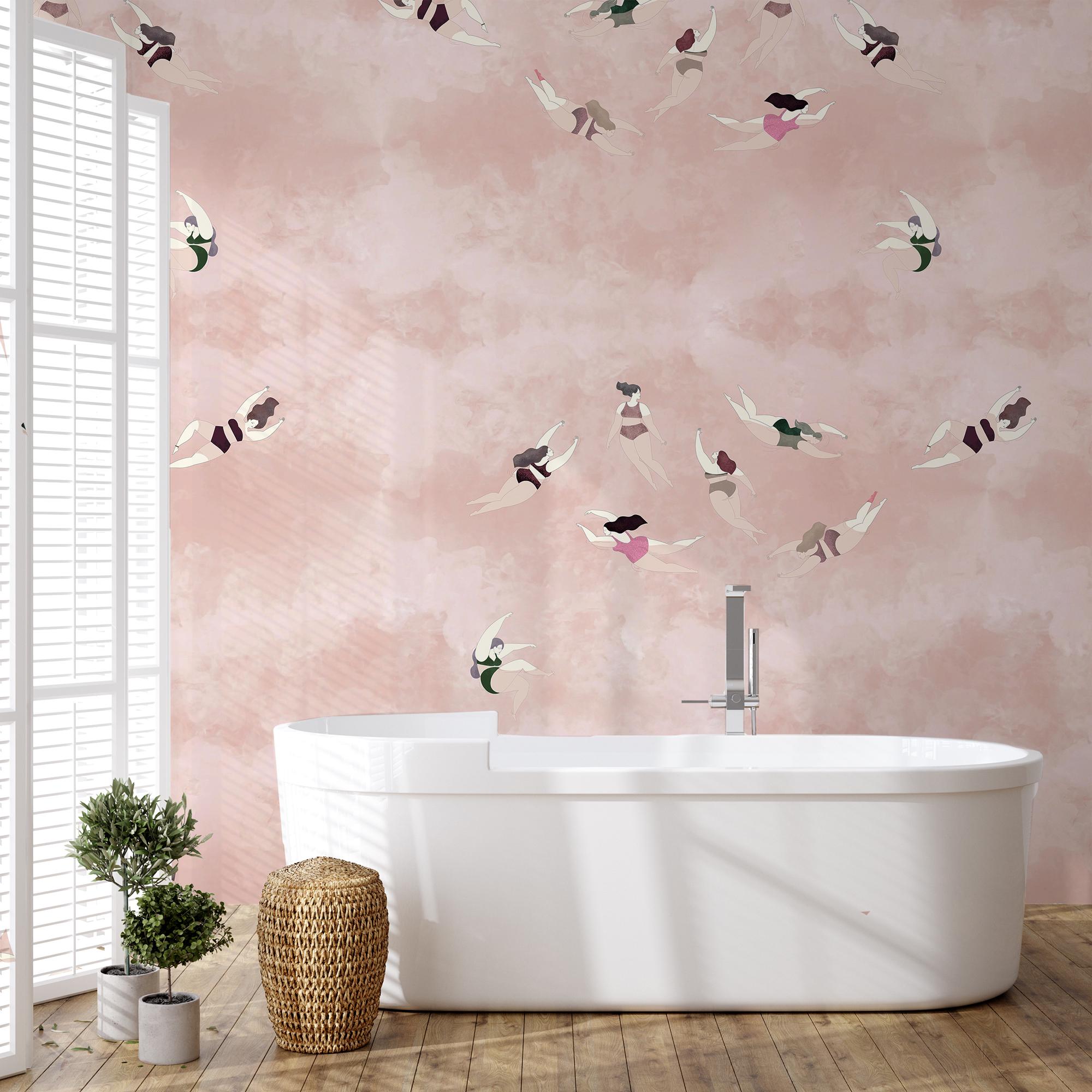 Swimming Women Wallpaper, Minimalist Pink Pastel Wallpaper – Transform your space into an elegant and serene atmosphere. This minimalist design features flowing female figures in soft pink pastel tones, adding an aesthetic rhythm to your walls with their graceful movements. The soft colors and minimal lines bring peace and sophistication to any room.