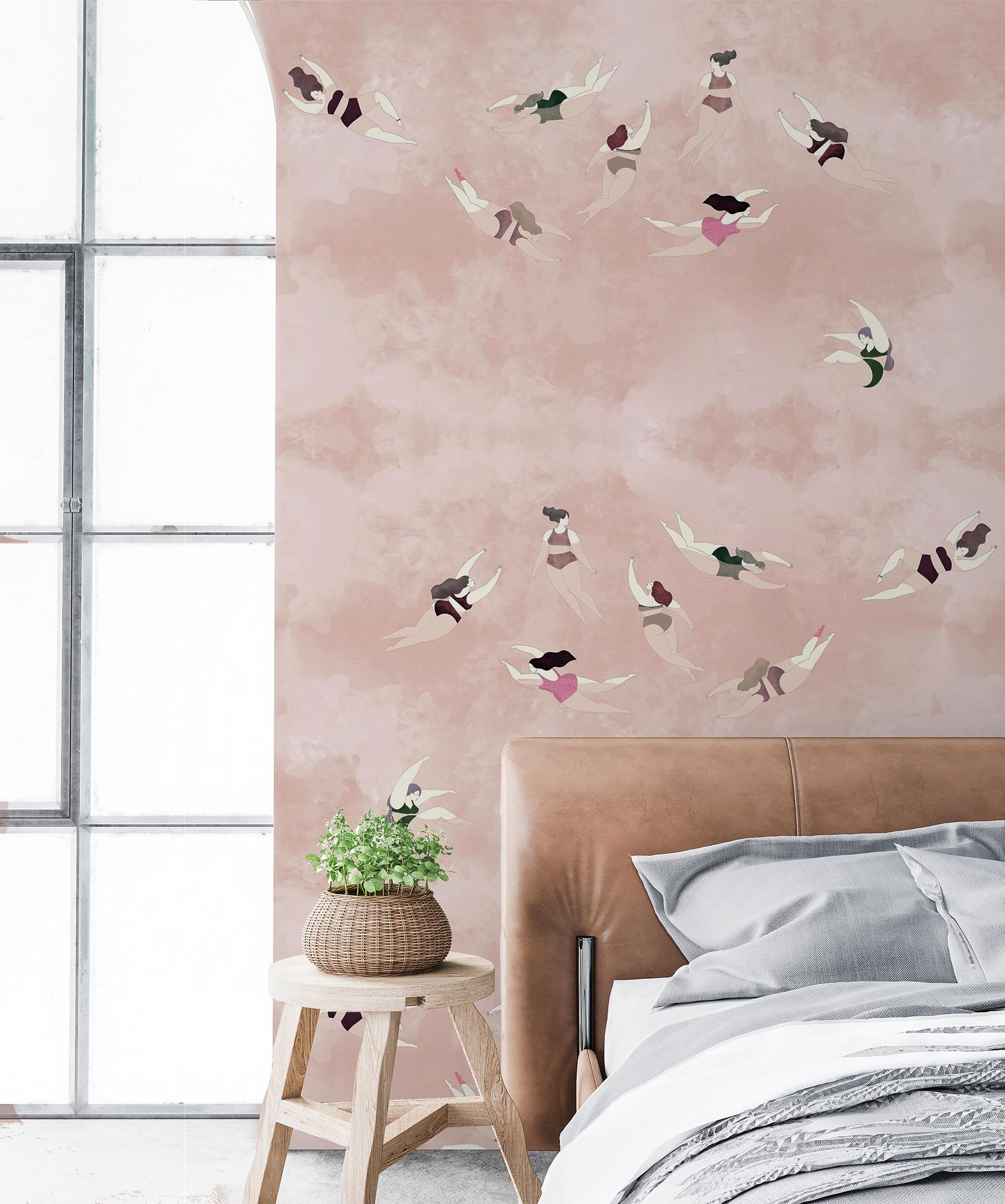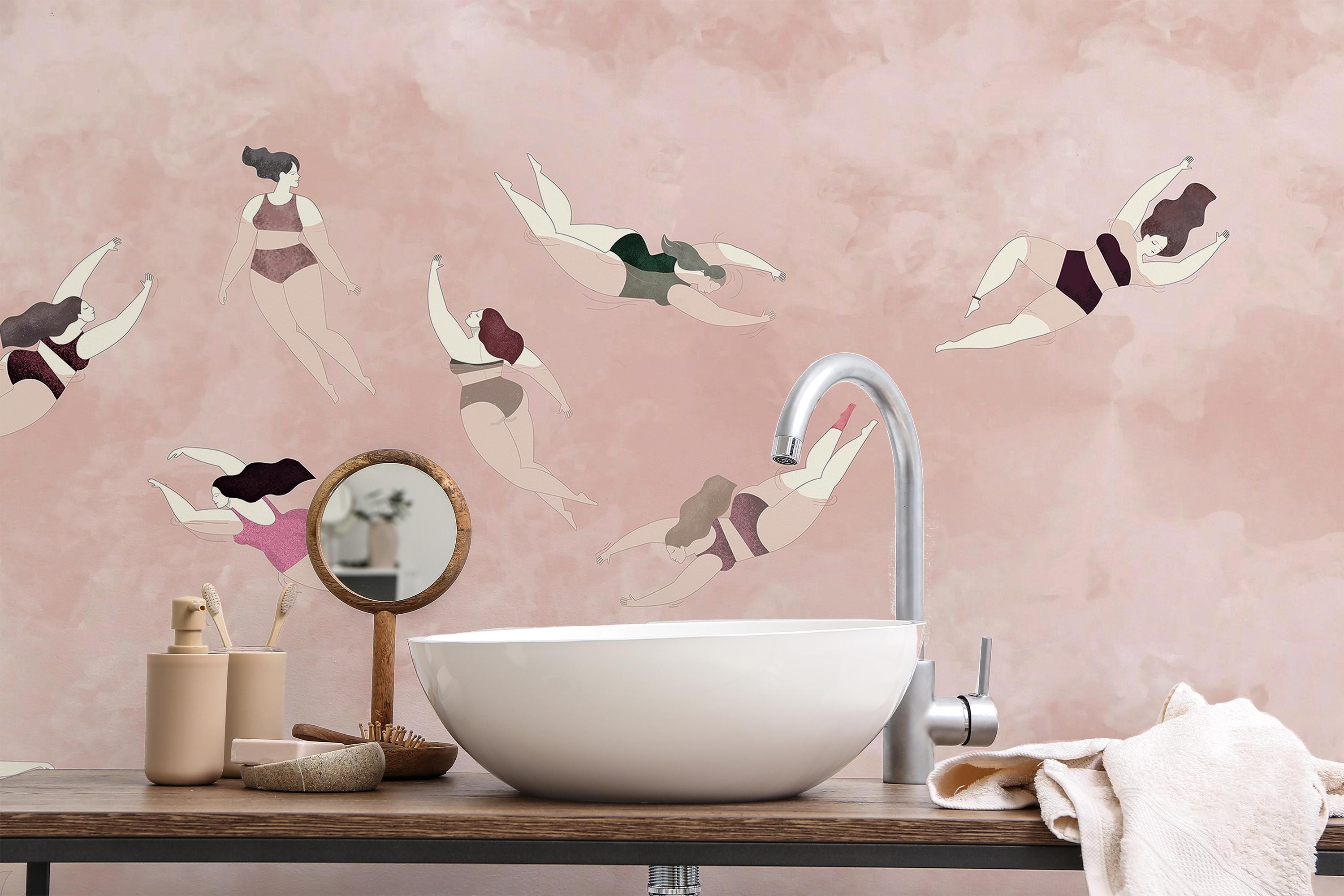 Swimming Women in Minimalist Pink Pastel Style - Vinyl and Peel and stick Wallpaper