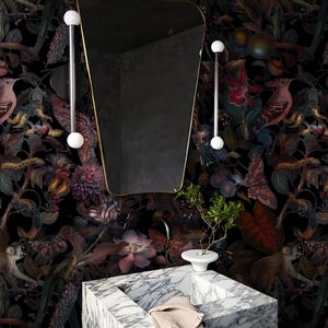 Step into an atmospheric world where the saturated energy of colorful tropical plants and playful figures punctuates a deep black horizon. This maximalist botanical mural features an intricate composition of vibrant blooms and exotic greenery. It is a bold, high-contrast visual signature that brings a sharp energy to your walls. Designed for all interiors, every vivid detail tells a story of elegance and sophisticated character. A powerful signature for any space with a daring soul.