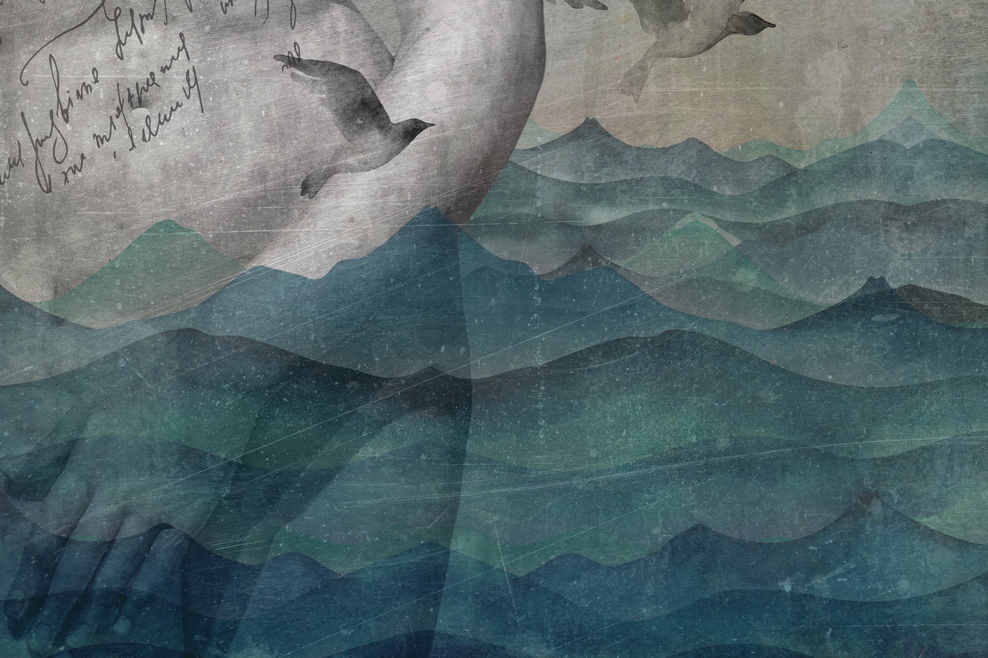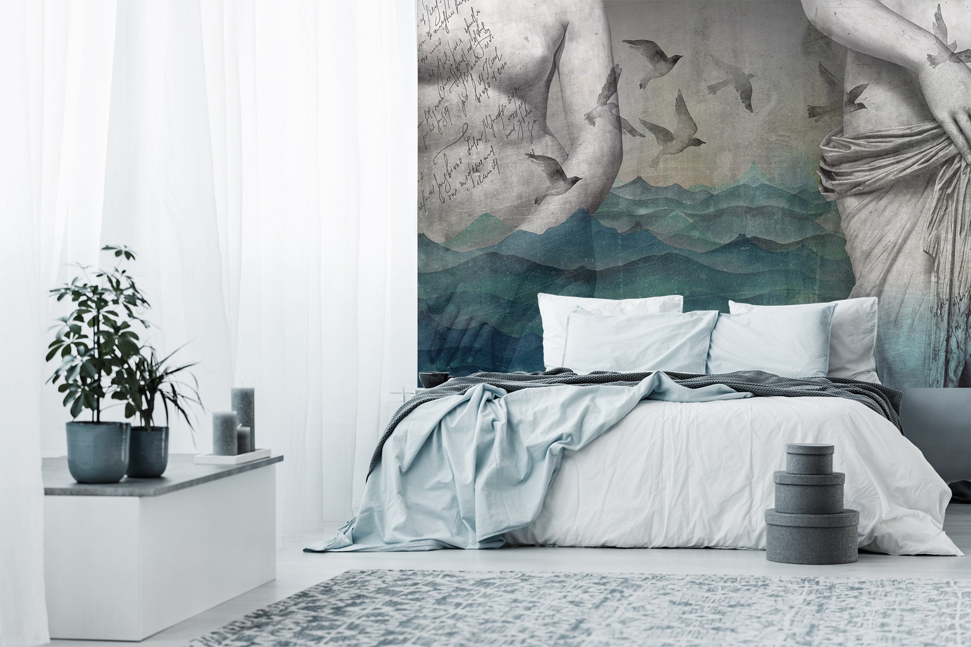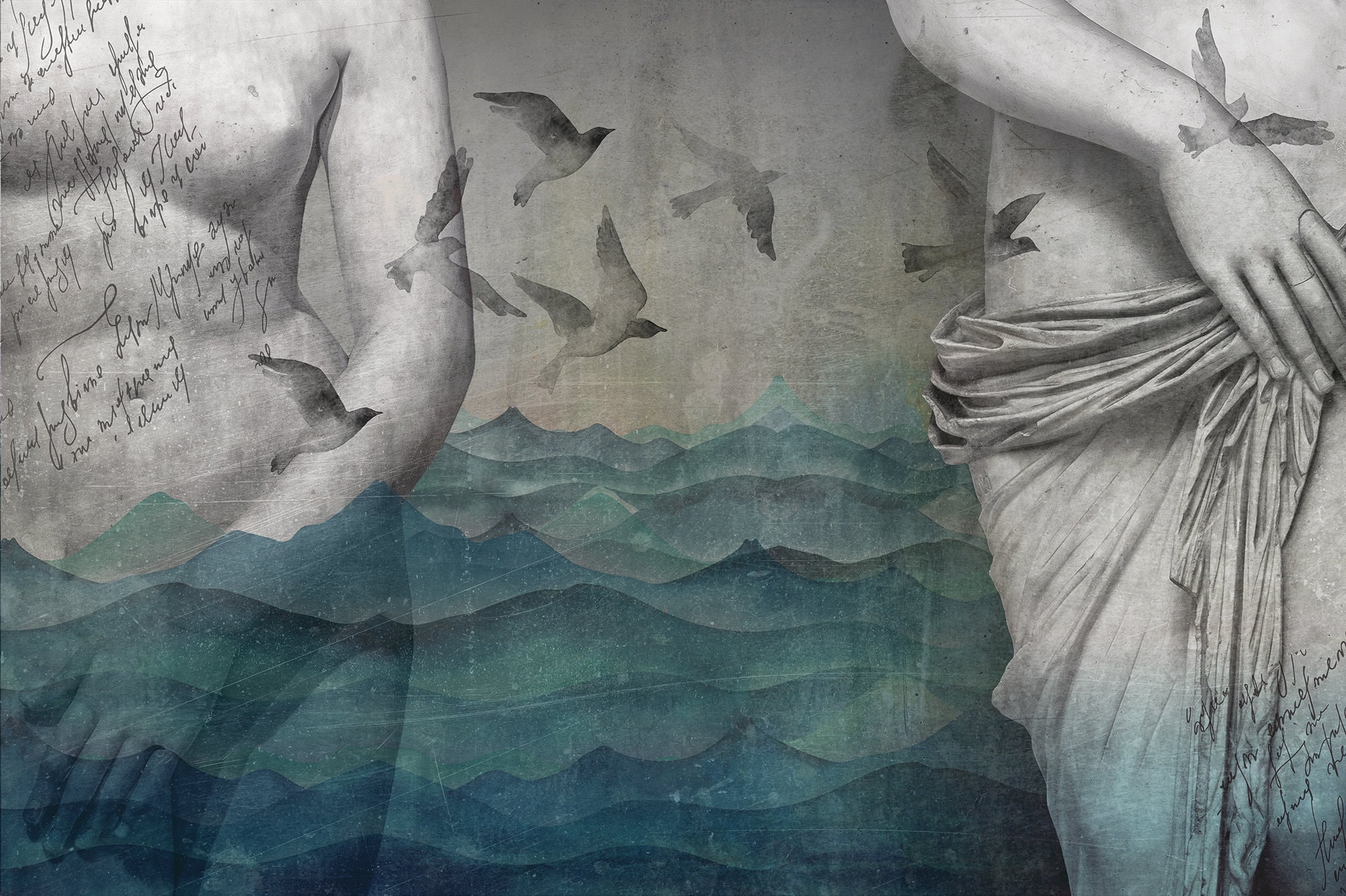 Transform your living space into a serene underwater oasis with this original wallpaper inspired by nature and the sea. Featuring beautiful blue watercolor waves and concrete effects, this unique wallpaper gives off a sculptural feel, as if ancient Roman statues have been unearthed from the depths of the ocean. Imagine the tranquility of the sea as birds take flight and the deep blue waters recede to reveal hidden treasures beneath. Bring the mystery and allure of the sea into your home with this one-of-a-kind wallpaper that is sure to captivate and inspire.