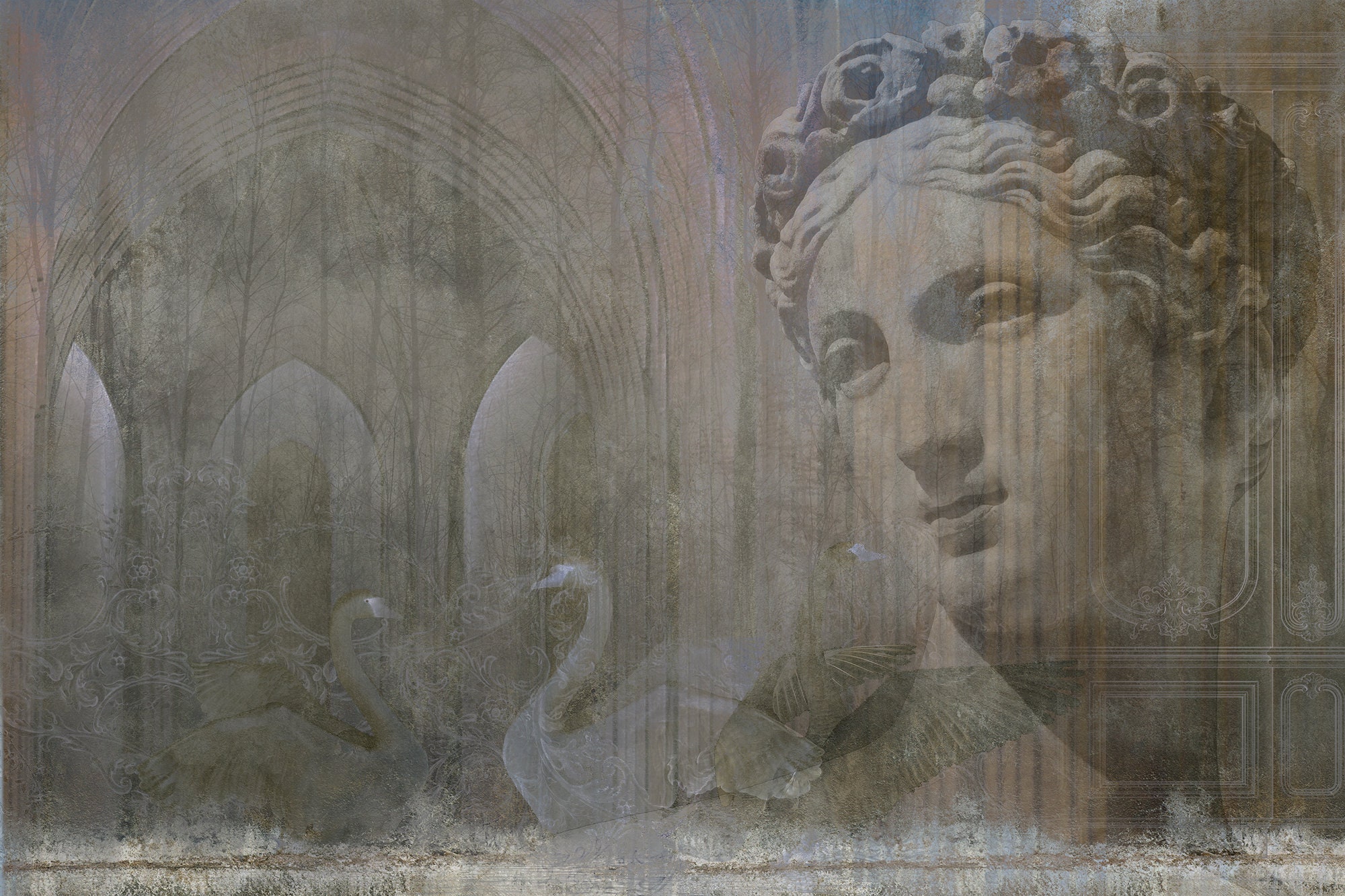 Introducing our unique and captivating interior architecture sculpture inspired by the Roman period, featuring intricate concrete effects and elegant swan motifs. This stunning piece combines the timeless beauty of classical art with a modern twist, perfect for adding a touch of sophistication to any space. Each sculpture is carefully crafted to resemble a beautiful mural, bringing a sense of artistry and charm to your home decor. The graceful swans, taken straight from nature, are delicately portrayed in a watercolor style, adding a whimsical and ethereal touch to the design. This sculpture is sure to make a statement in any room, whether displayed on its own or integrated into a larger mural or gallery wall. Elevate your space with this exquisite piece that seamlessly blends history, art, and nature into a seamless masterpiece.