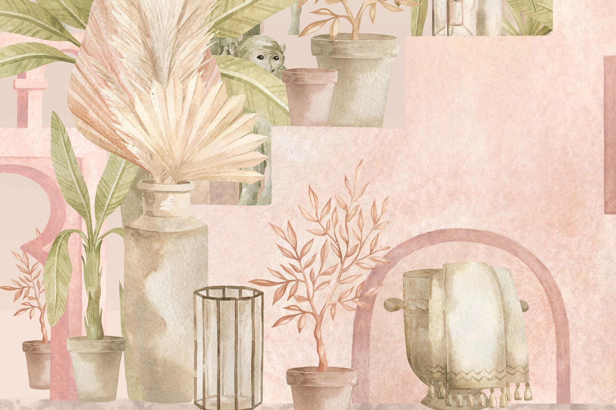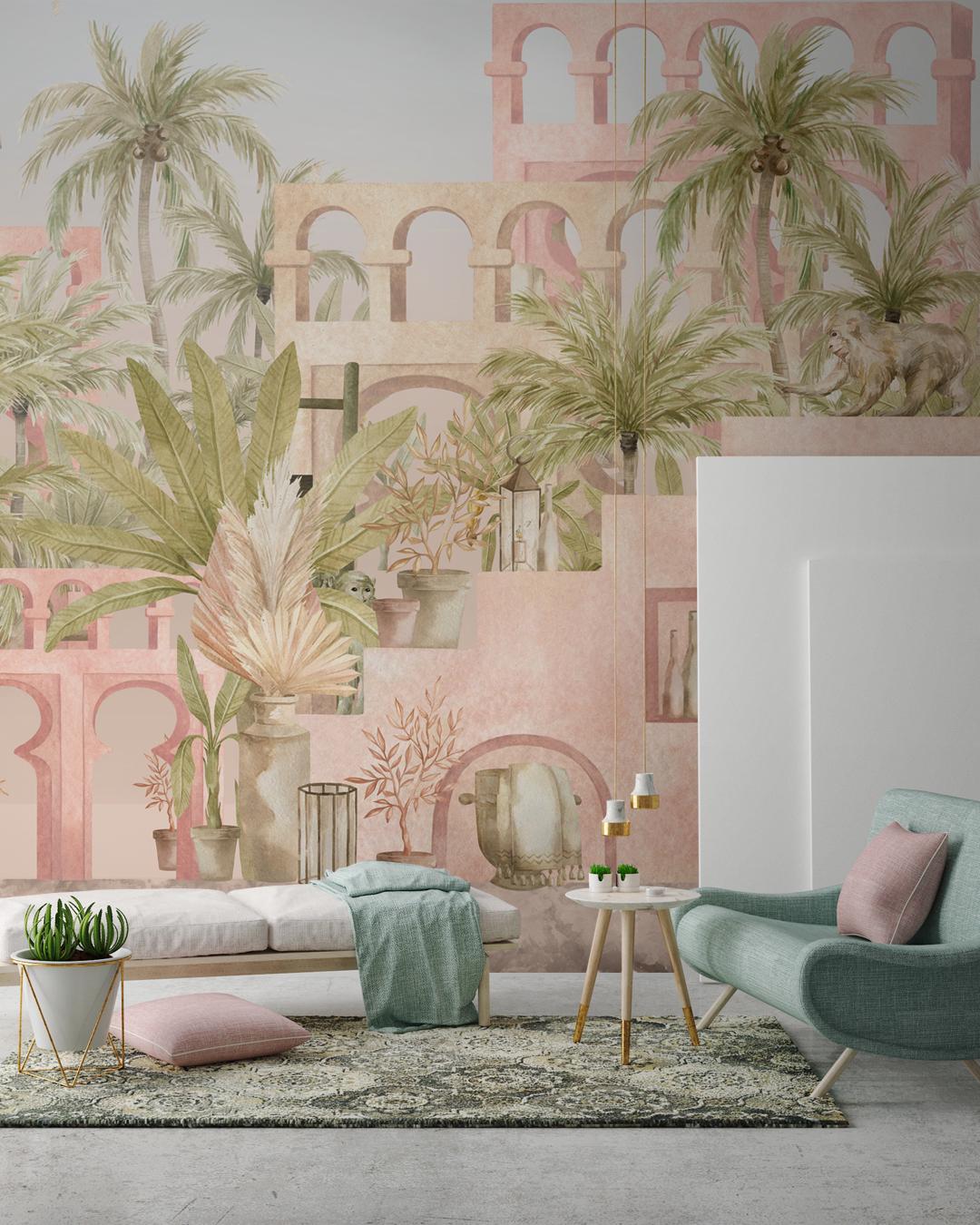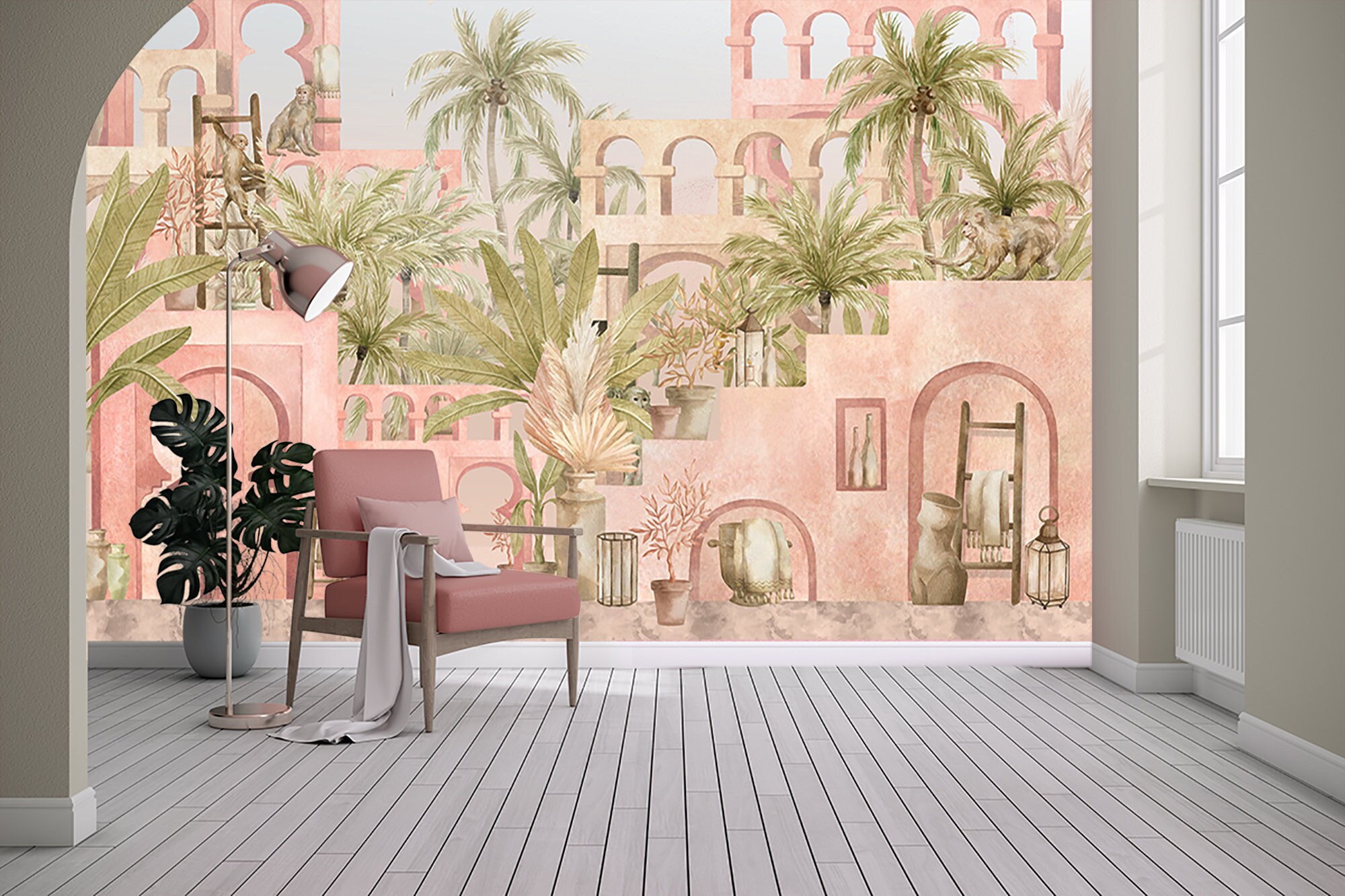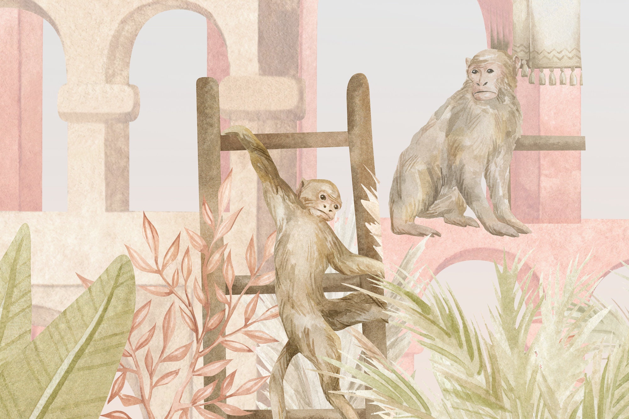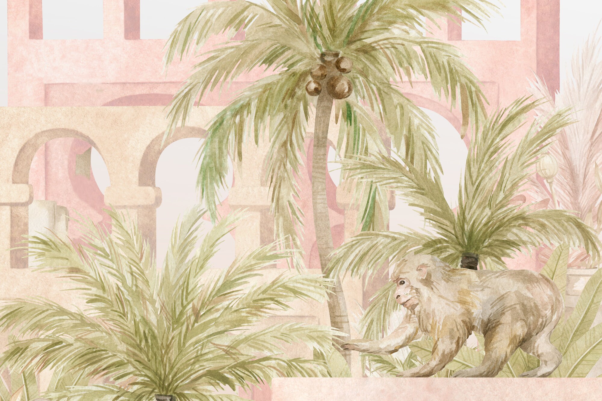 Courtyard City Wallpaper: Monkeys & Palm Trees, Peel and Stick Vinyl