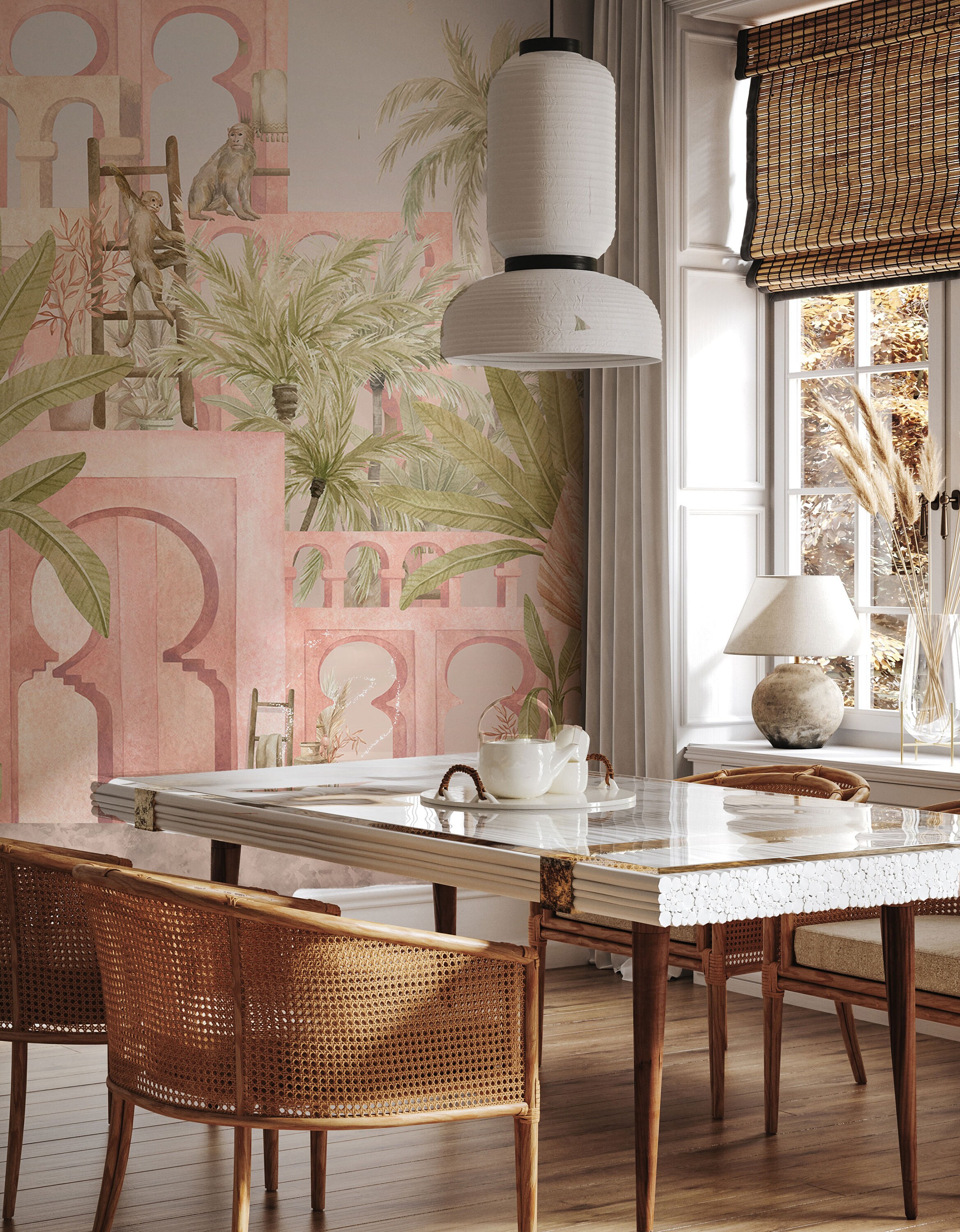 Introducing our stunning wallpaper that will transport you to an enchanting world filled with authenticity and charm. Imagine yourself wandering through the bustling streets of an ancient city, where every corner holds a story. As you explore, you will stumble upon a magnificent courtyard, adorned with vibrant greenery and captivating works of art. The sun's warm rays embrace you as cheerful monkeys playfully swing from tree branches above. This wallpaper captures the essence of this magical place, bringing depth and warmth to your space. Allow yourself to be captivated by the beauty and serenity it offers, transforming any room into a tranquil oasis. Step into a realm of endless possibilities with this mesmerizing wallpaper.