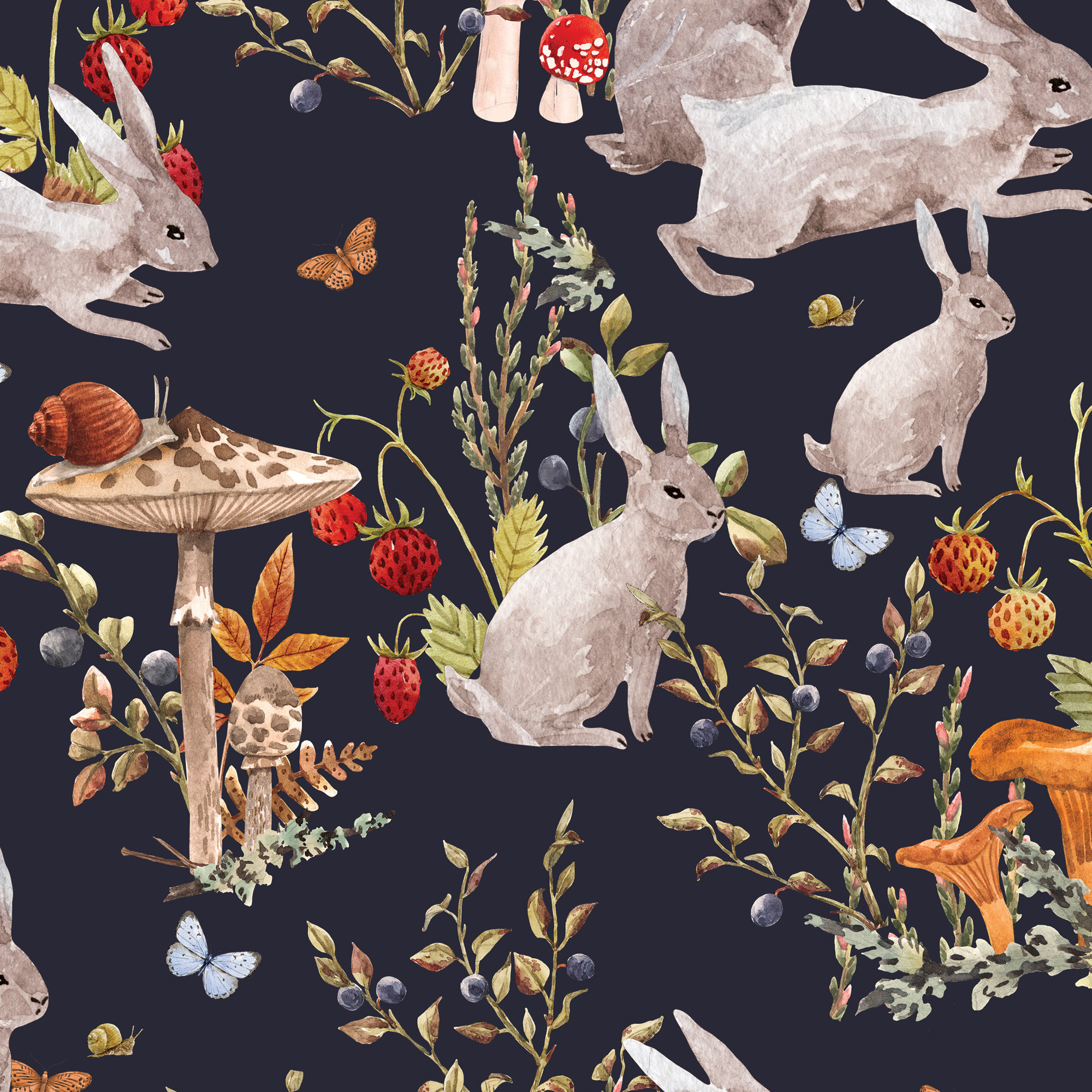 Bunny family Nursery wallpaper, Sweet Rabbits,Strawberries & red Mushrooms,dark nursery,vintage baby room,self adhesive,peel and stick,vinly