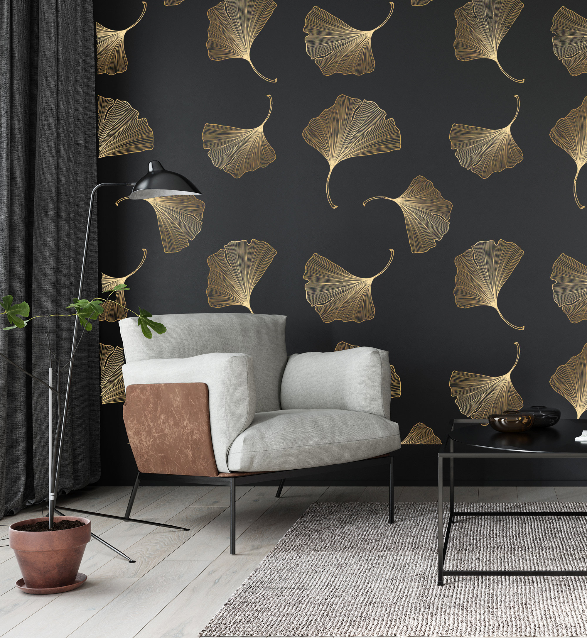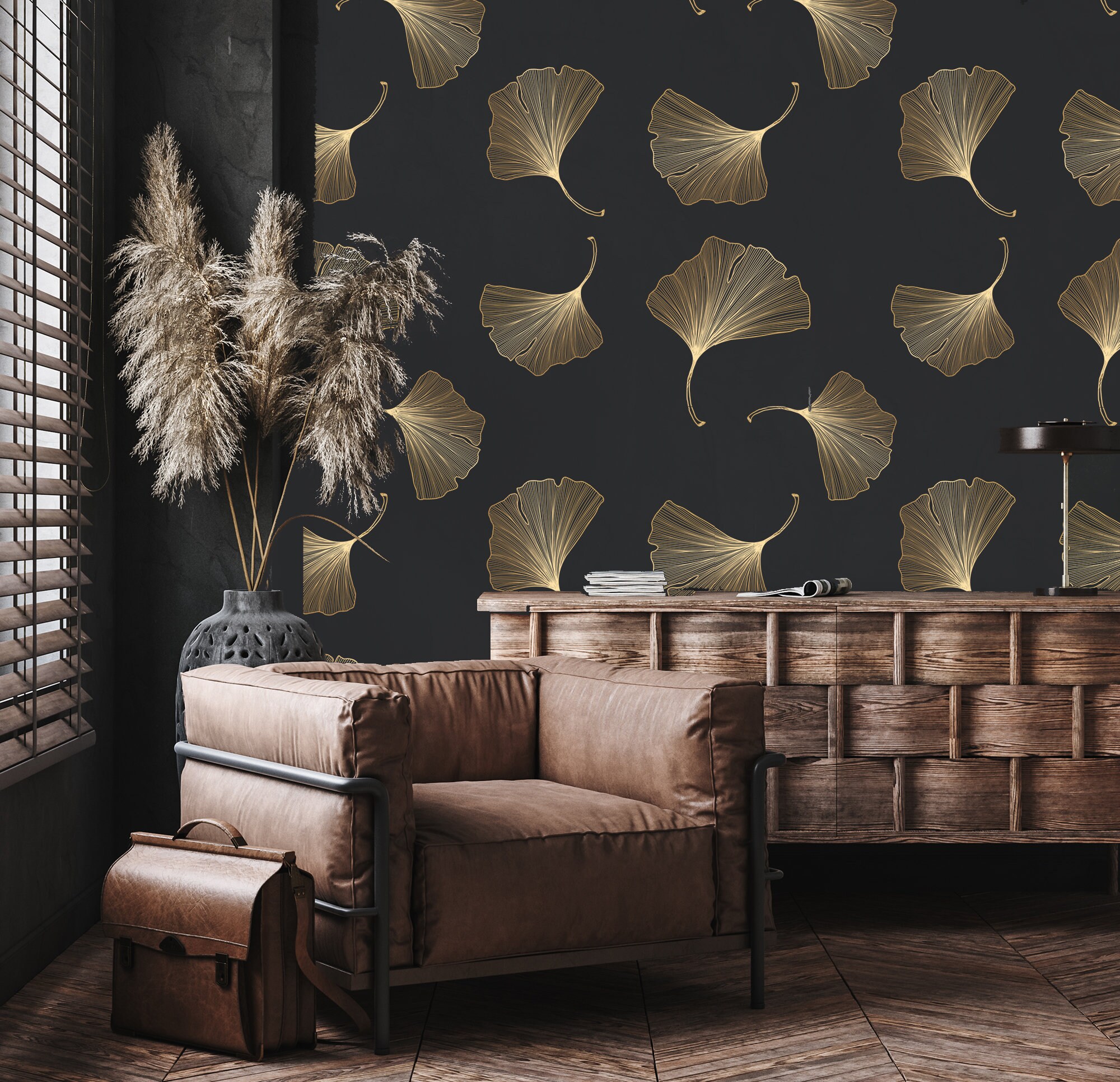 Modern Ginkgo Leaves Wallpaper - Chic Black and Gold Design, Peel and Stick, Removable Vinyl