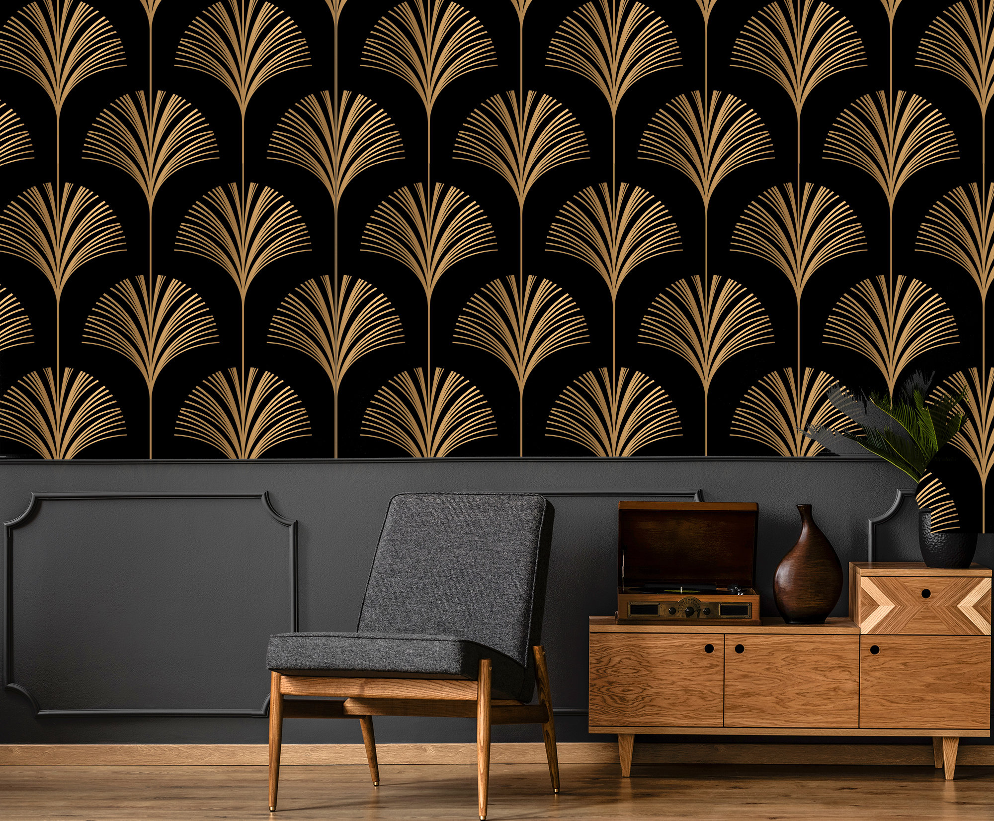 Meet our Artdeco Gold Striped Geometric leaf Abstract Design wallpaper, which is a perfect blend of black and gold nuances. Featuring a stunning dark background, this unique design effortlessly combines both sophistication and modern elegance. Elevate the elegance of any space in your home with this black and gold leaf masterpiece. Its geometric abstract pattern adds contemporary appeal, making it the perfect addition to any stylish interior. Add a sense of luxury and richness to your walls with our black and gold wallpaper, creating an atmosphere that is both ostentatious and fascinating.