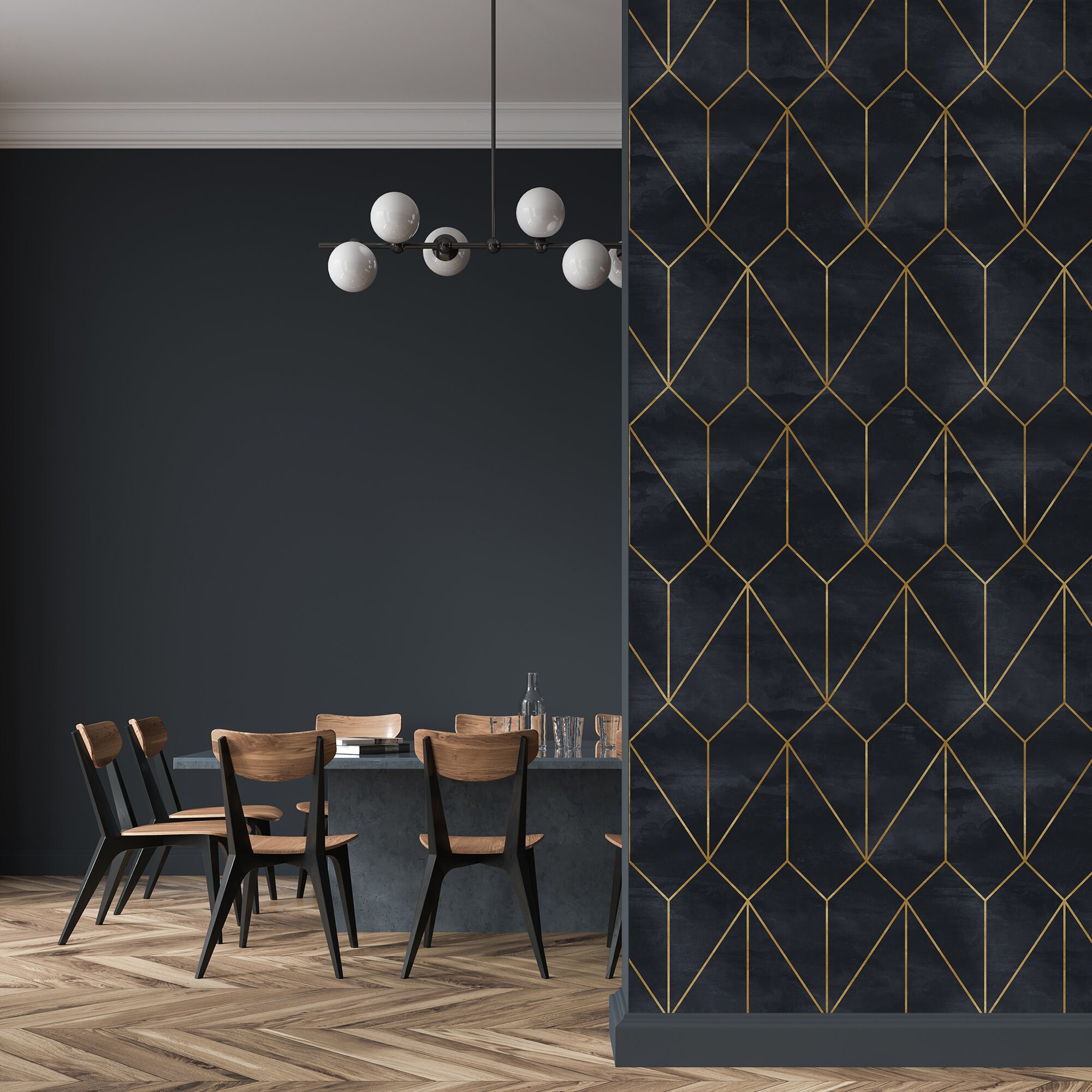 Introducing our Artdeco Golden Line Geometric Abstract Design wallpaper, an exquisite blend of black and gold nuances. With a captivating dark background, this unique design effortlessly combines both sophistication and modern chic. Elevate the elegance of any space in your home with this black and gold masterpiece. Its geometric abstract pattern adds a touch of contemporary allure, making it the perfect addition to any stylish interior. Bring a sense of luxury and opulence to your walls with our black and gold wallpaper, creating an ambiance that is both lavish and captivating.