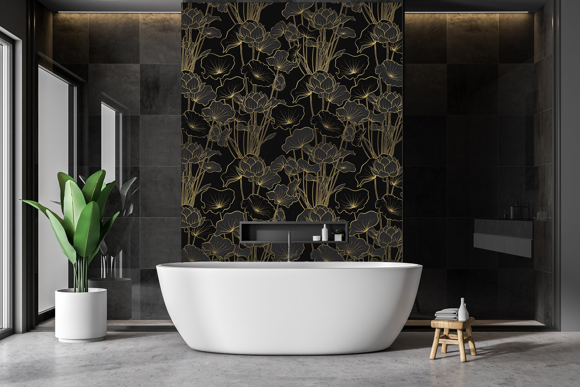 Art Deco Lotus Flower Mural: Black and Gold Peel & Stick Wallpaper