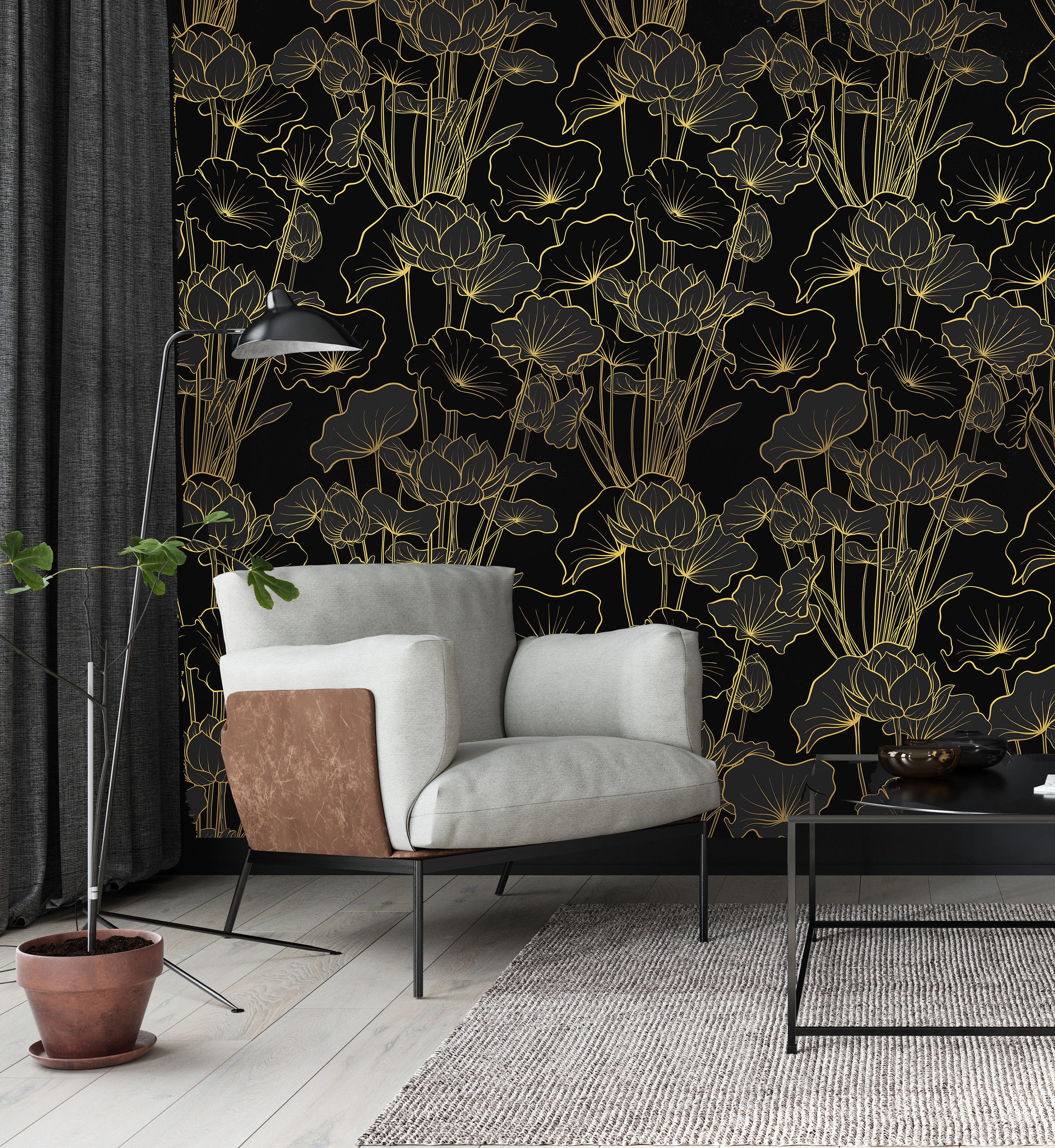 Introducing our exquisite artdeco Lotus flower, designed to grace the walls of your home with a touch of elegance. The stunning combination of black and gold creates a captivating aesthetic, exuding a sense of timeless beauty. With its minimal yet vintage style, this piece is bound to be the center of attention, as it effortlessly transforms any wall into a true work of art. Prepare to be dazzled by the way this exquisite artwork enhances your surroundings. From the moment guests lay eyes on your artfully adorned wallpaper, they won't be able to resist discussing its unique allure. Elevate your home decor with this captivating Lotus flower and let the conversations flourish.