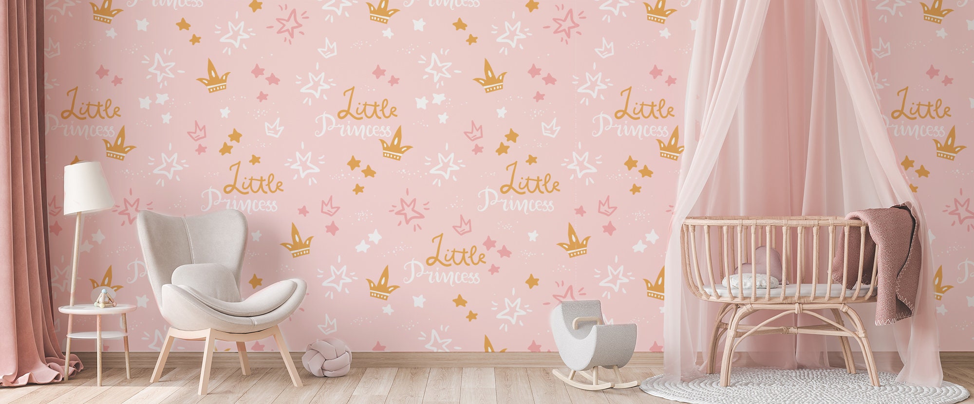 Meet our Little Princess Doll wallpaper suitable for your princess! This charming crown nursery theme is adorned with stunning baby girl stars, this princess-inspired pink and cute collection is sure to enchant your baby. Create a delightful haven for your little girl with this delightful baby room wallpaper that exudes elegance and regal beauty.