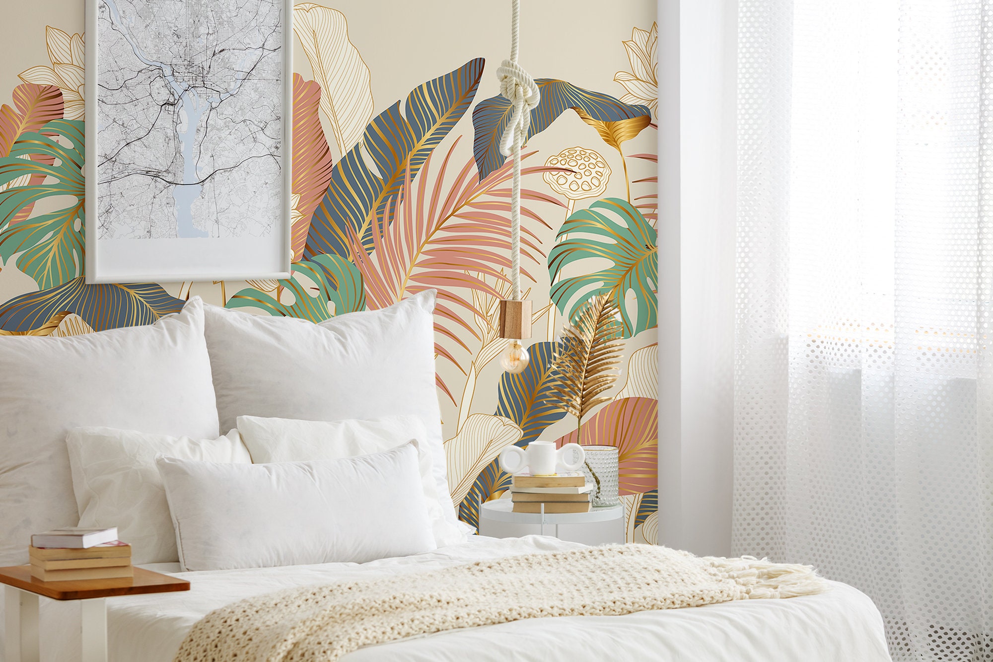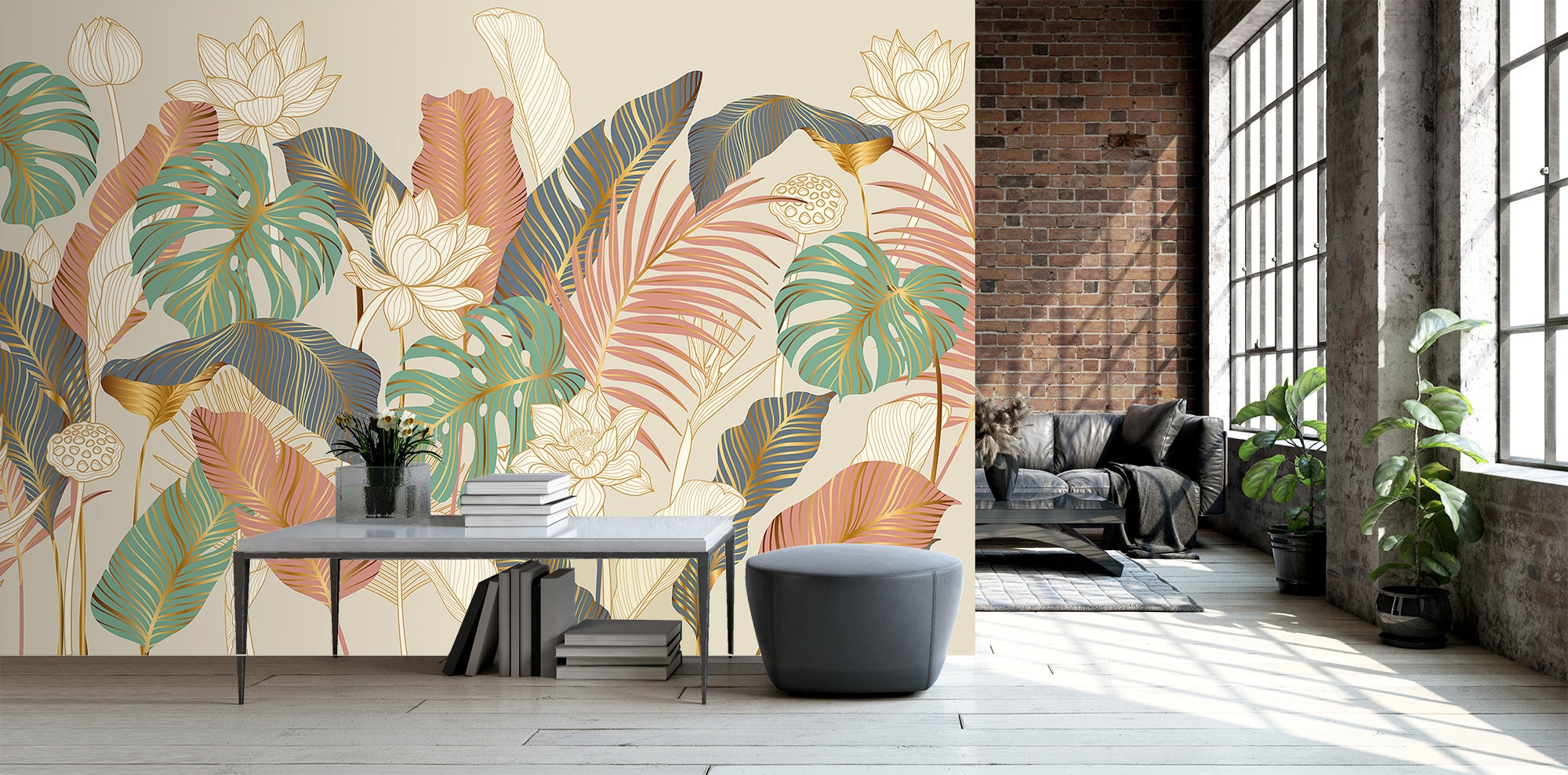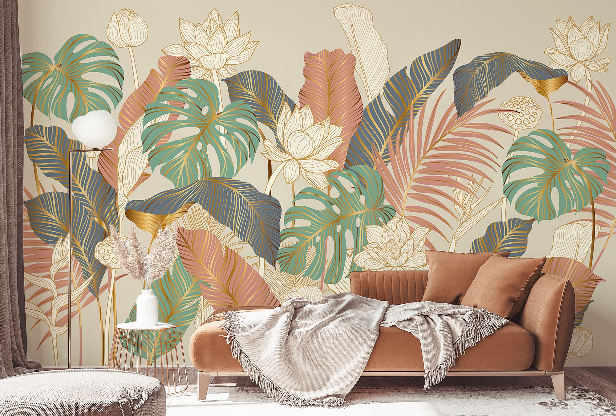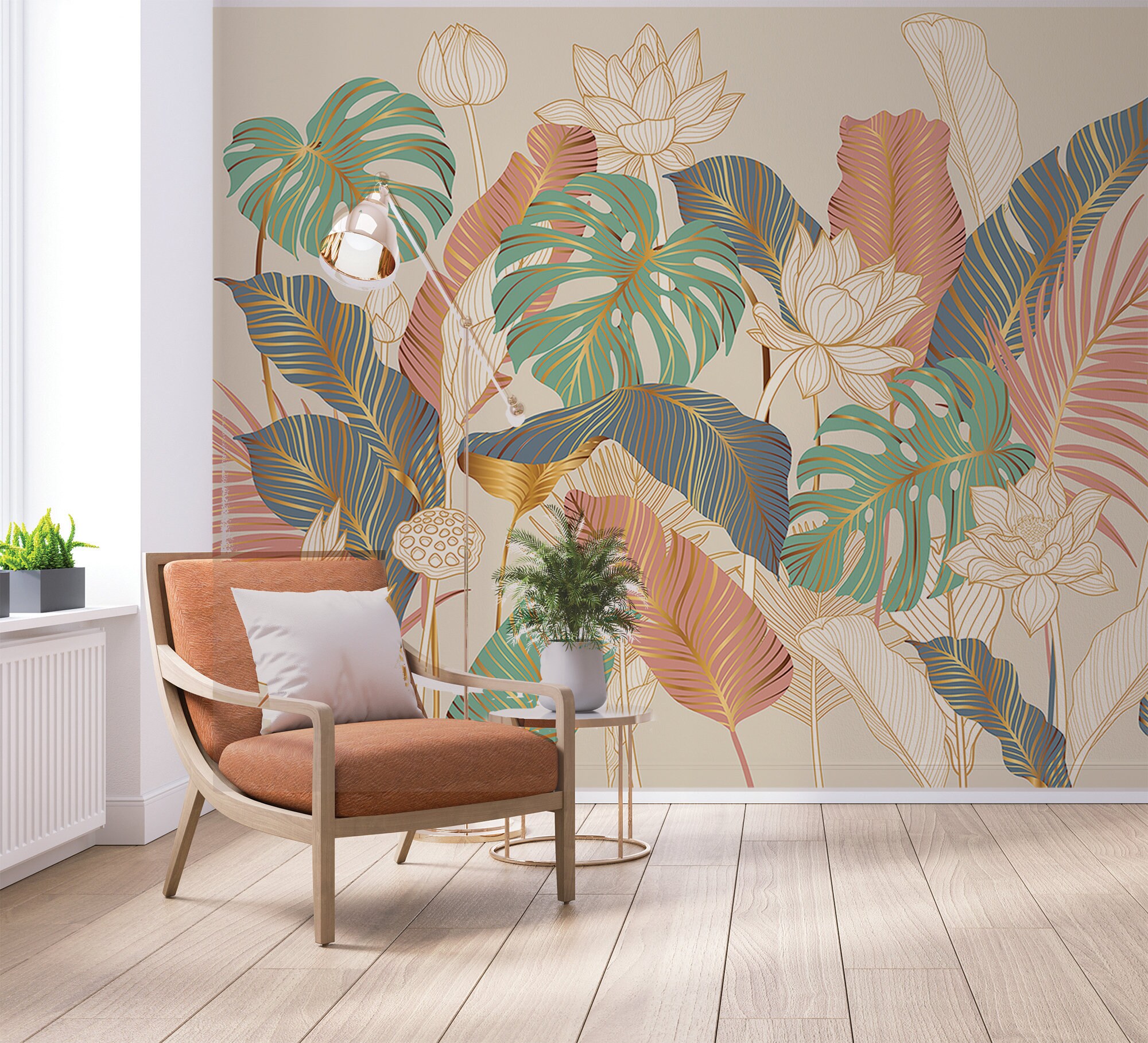 Exotic Forest Wall Mural: Minimalist Pastel Plant Print with Gold Lines