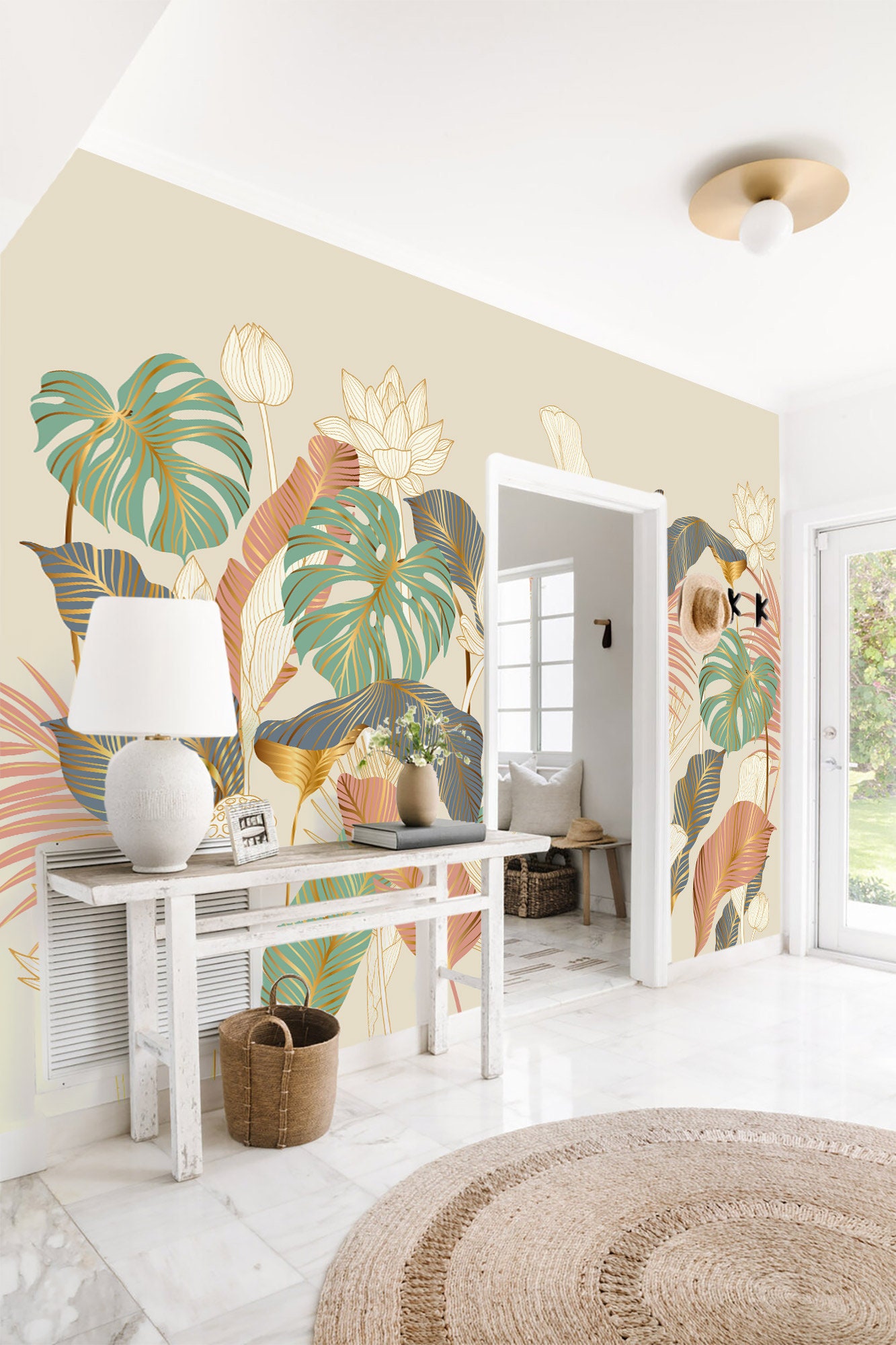Introducing our latest masterpiece - the exotic forest design. Embrace the beauty of minimalism with a touch of pastel colors that instantly transport you to a magical world of exotic plants. With its minimalist approach and elegant interpretation, this piece seamlessly harmonizes modernity and style. The captivating gold lines add a subtle hint of luxury to this enchanting artwork. Transform your home into a serene oasis with our new exotic forest design - a perfect blend of tranquility and elegance.