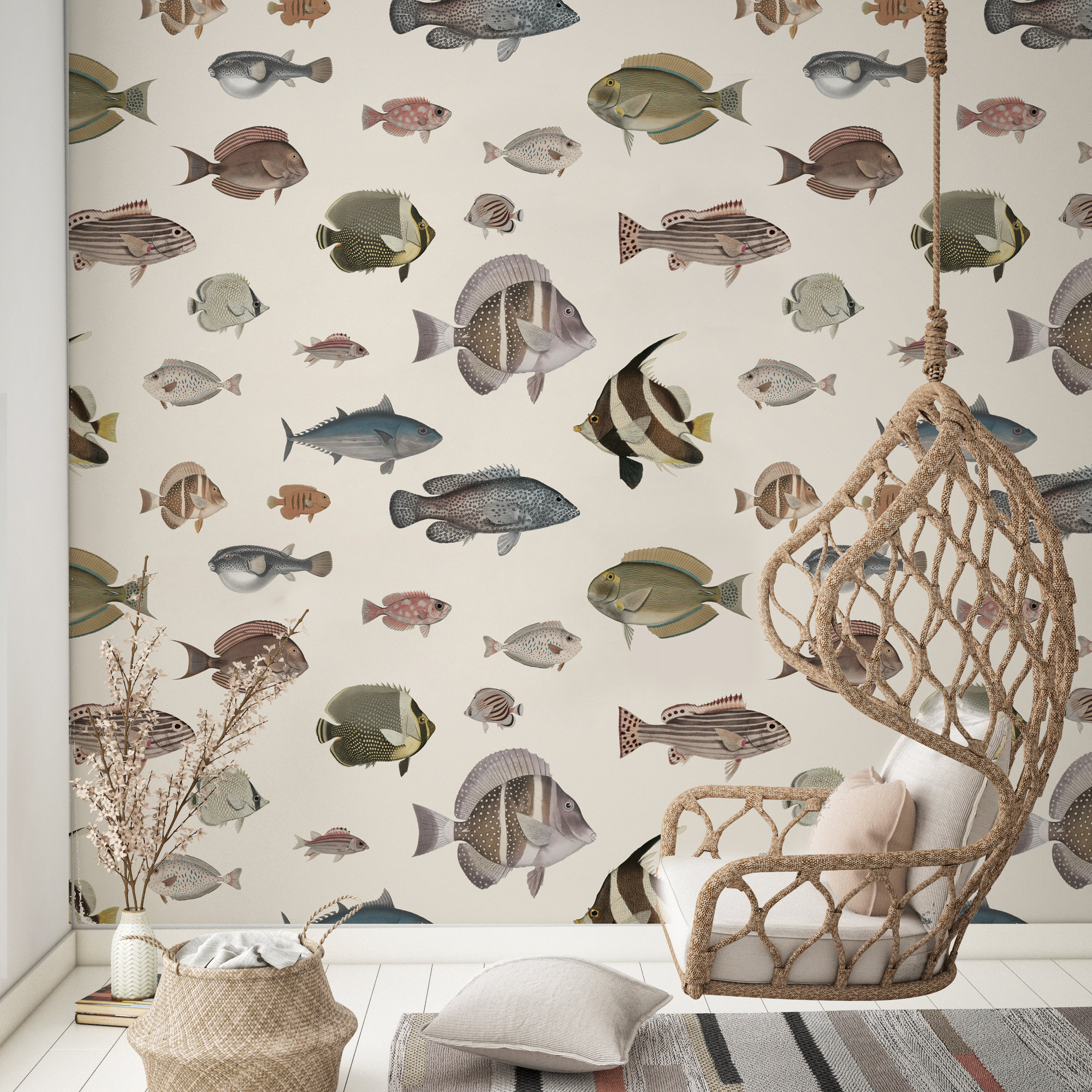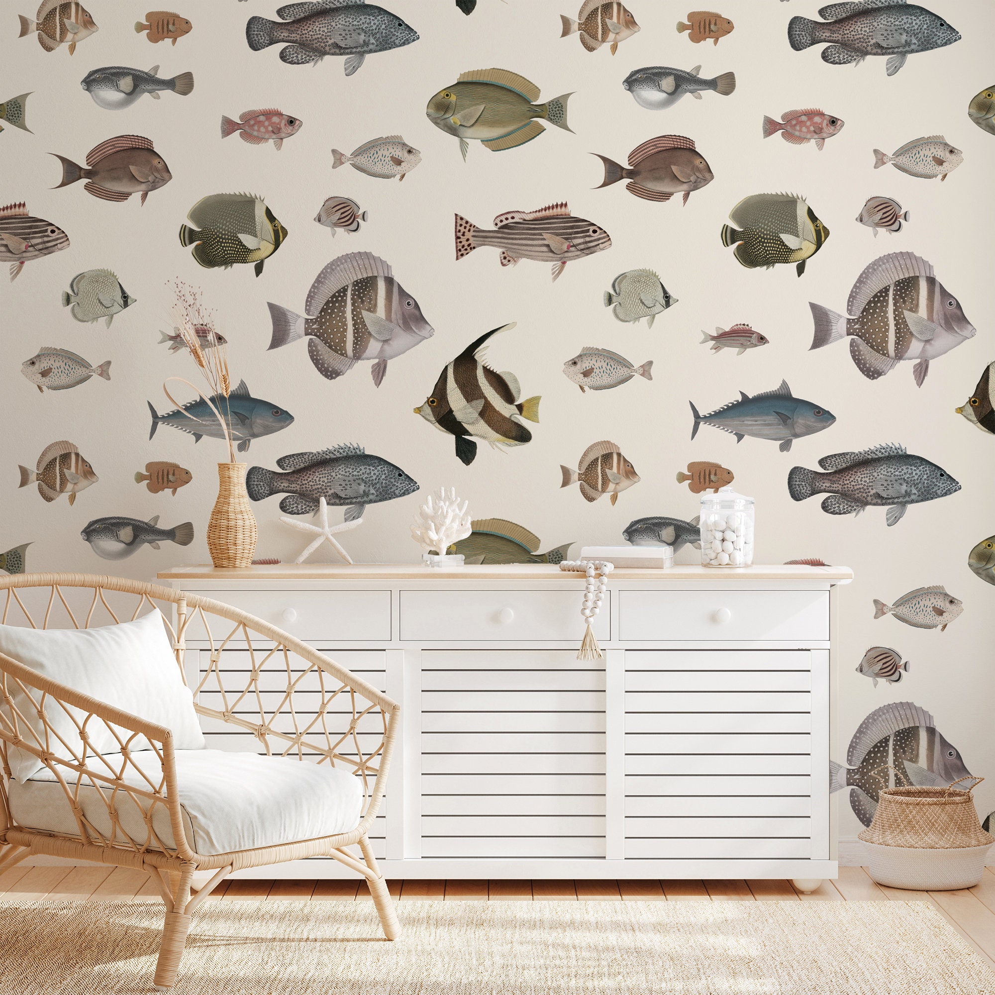 Introducing our exquisite hand-drawn fish pattern on a cream background, bringing the captivating beauty of vintage ocean fish into your home. Each meticulously painted fish showcases the intricate details and vibrant colors found in the depths of the sea. With this unique artwork, you can instantly infuse your living space with the serene and invigorating feeling of the ocean. With thousands of different fish designs to choose from, be marveled by the most beautiful creatures of the sea that will truly make a statement in your decor. Elevate your home with our hand-drawn and painted fish, and immerse yourself in the wonders of the ocean right from your own living room.