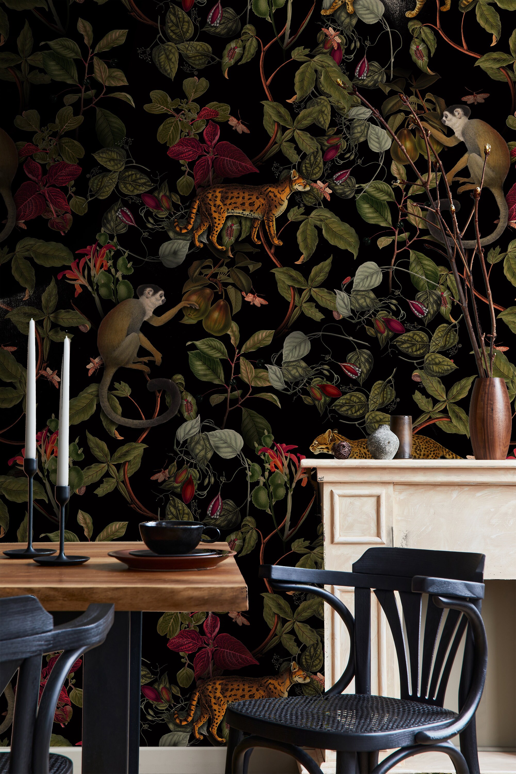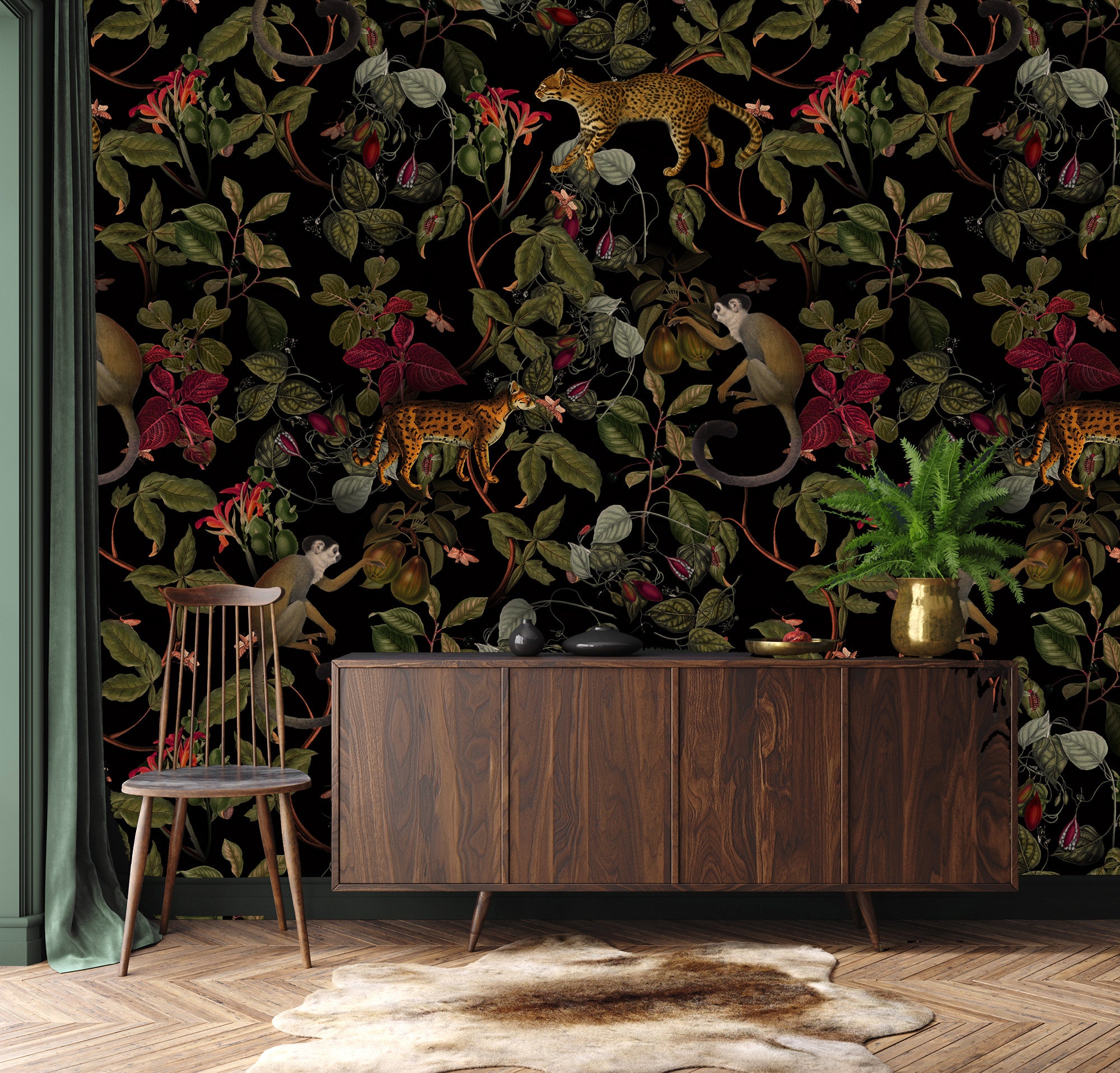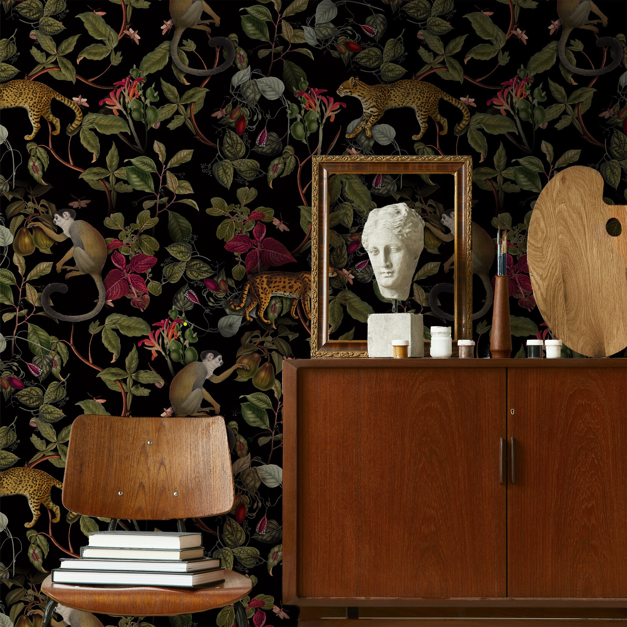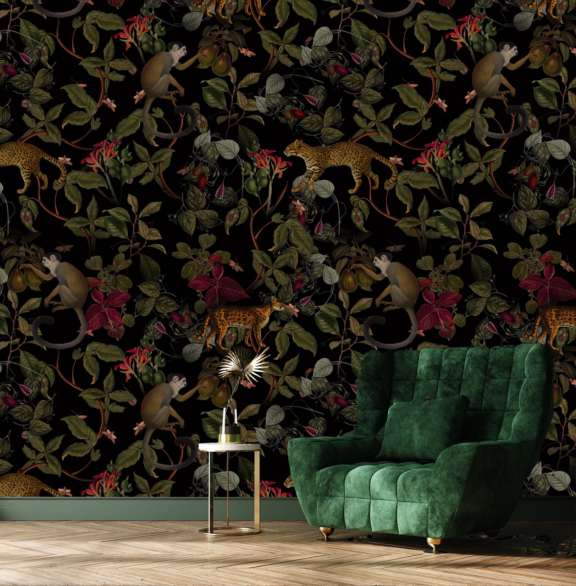 Introduce a touch of untamed beauty into your space with our mesmerizing Dark Botanic Wallpaper. This stunning design showcases the enchanting combination of cheetah and monkey motifs intertwined amidst a lush backdrop of leaves and vibrant red flowers. Its vintage appeal adds a timeless charm to any room, while the custom dark green nature pattern captivates with its vintage monkey and cheetah illustration. Experience the allure of the wild in your own home with this captivating and unique wallpaper design.