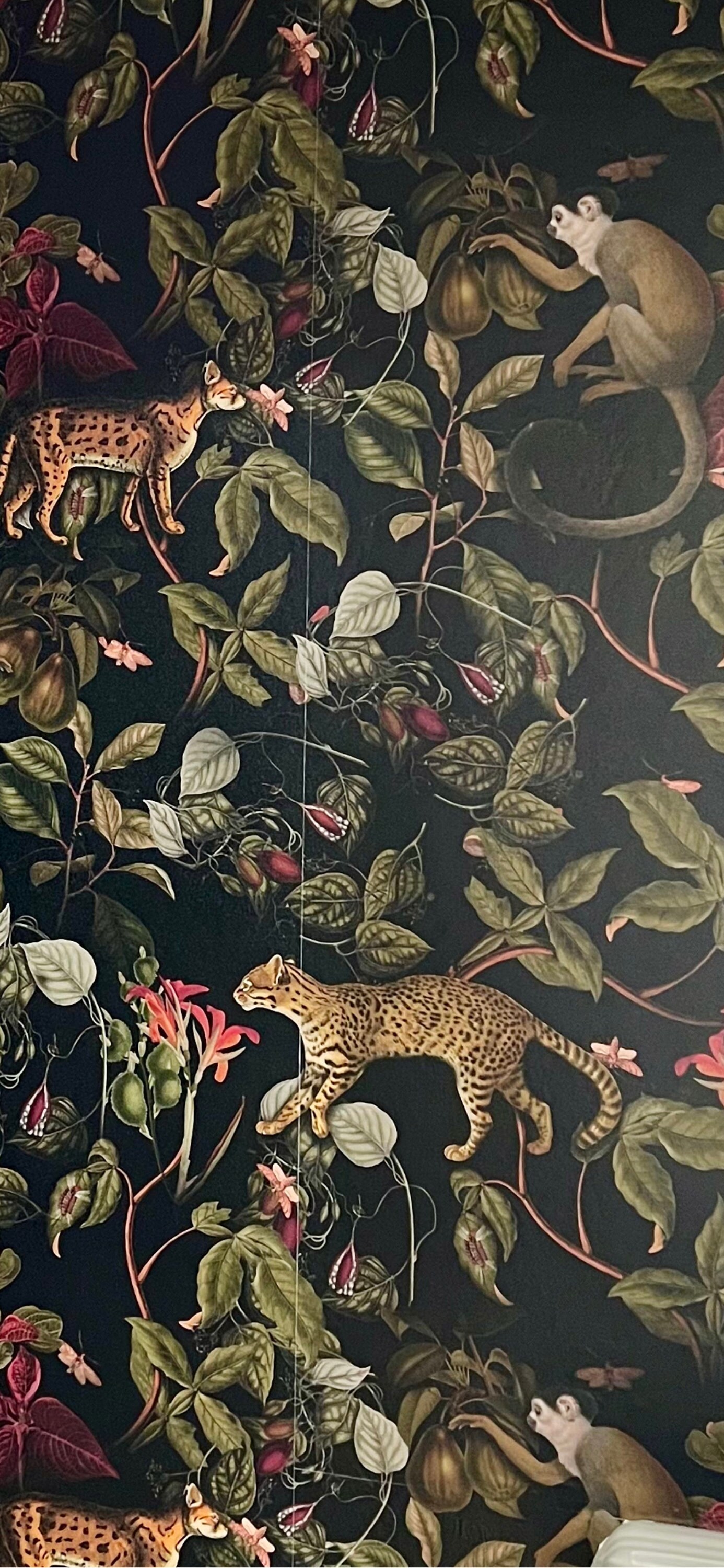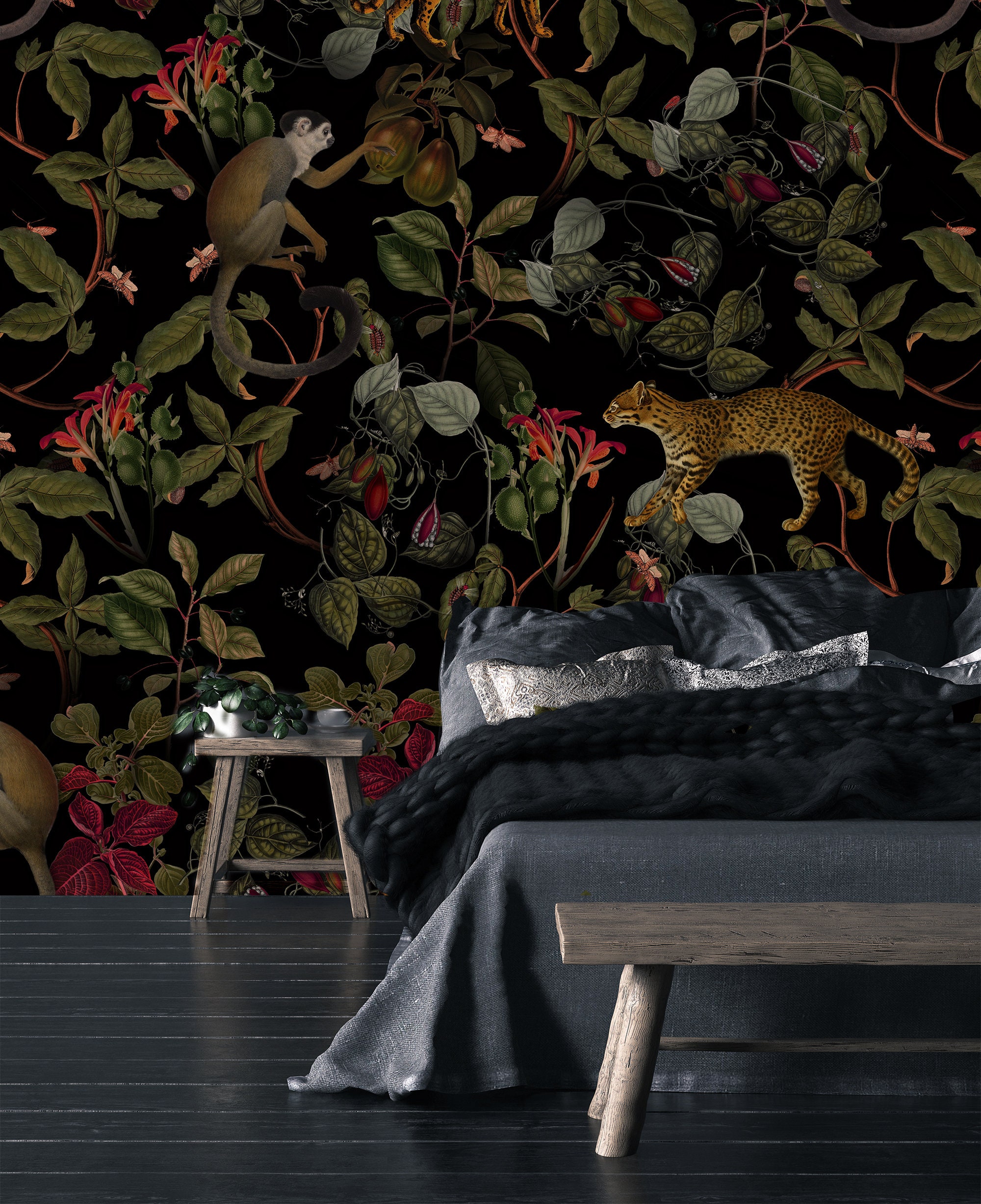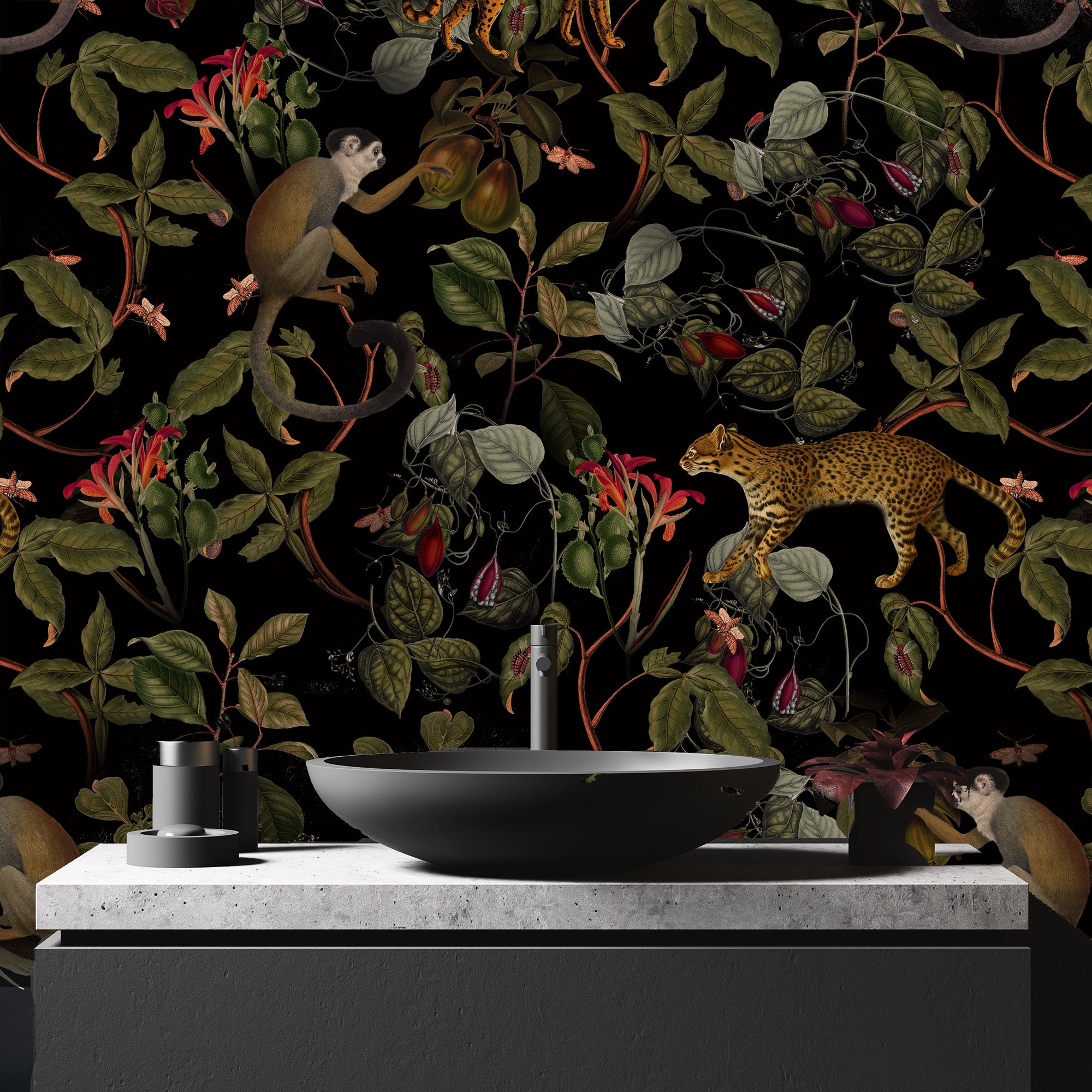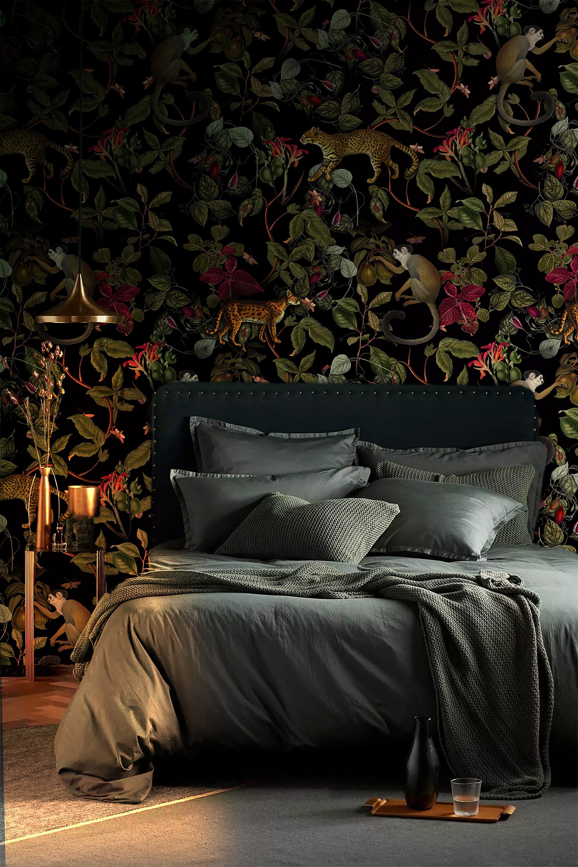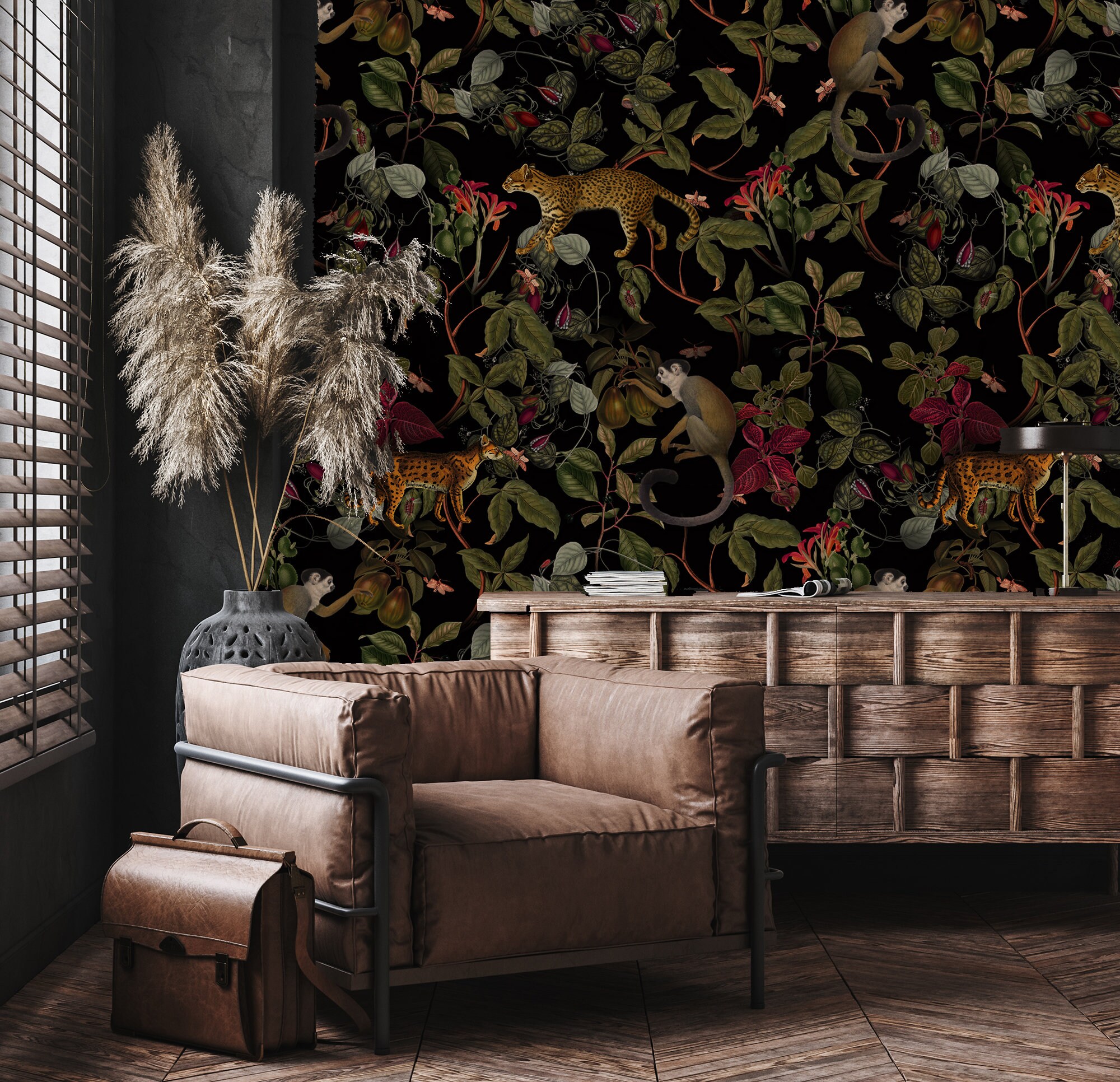 Introduce a touch of untamed beauty into your space with our mesmerizing Dark Botanic Wallpaper. This stunning design showcases the enchanting combination of cheetah and monkey motifs intertwined amidst a lush backdrop of leaves and vibrant red flowers. Its vintage appeal adds a timeless charm to any room, while the custom dark green nature pattern captivates with its vintage monkey and cheetah illustration. Experience the allure of the wild in your own home with this captivating and unique wallpaper design.