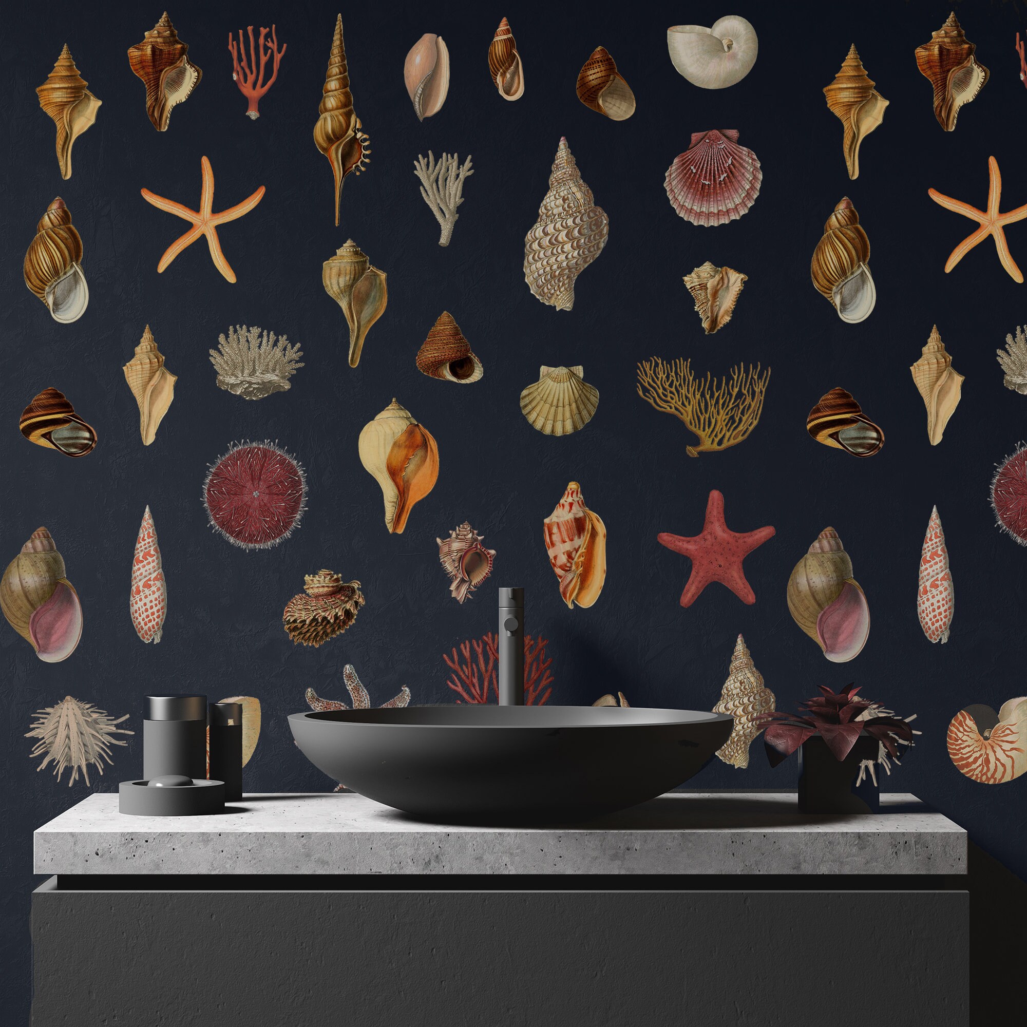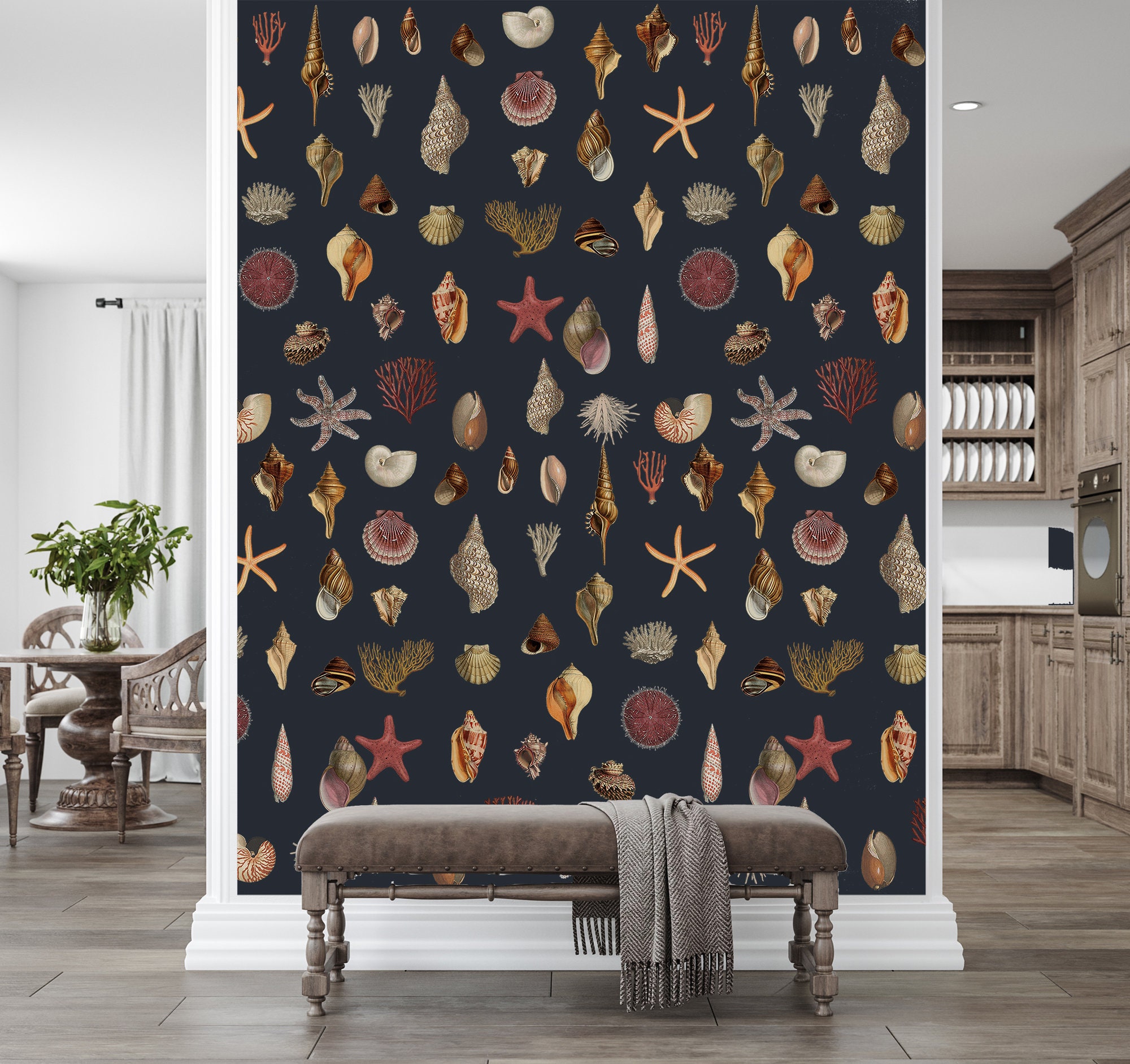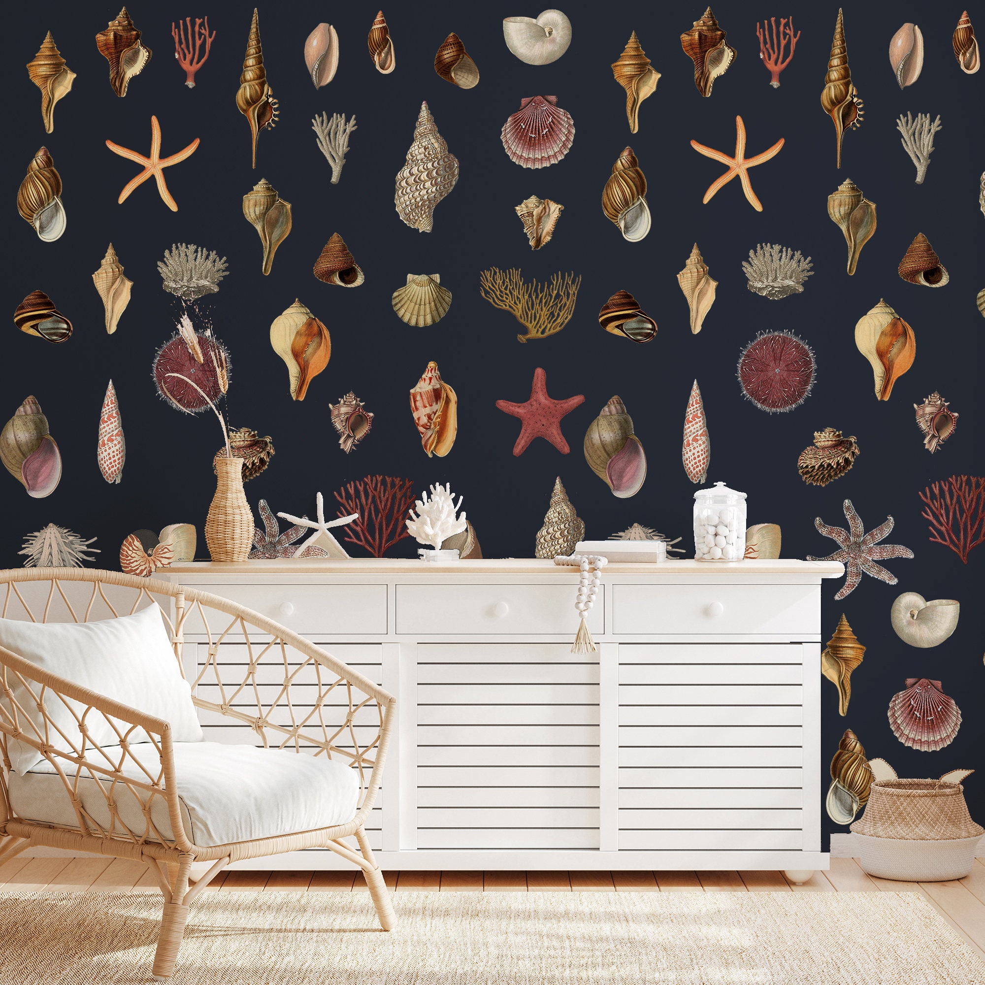 Introducing our magnificent Vintage Seashell Wallpaper, designed to transport you to the mesmerizing depths of the ocean. This unique wallpaper showcases exquisite starfish and coral motifs, creating an enchanting sea world right within your home. The sublime ocean, with its deep dark blue hues, unveils its precious jewels, gifting us with its awe-inspiring beauty. Embellish every corner of your living space with these immaculate treasures from the sea, and let their presence invoke a sense of tranquility and elegance. Transform your home into a captivating sanctuary with these extraordinary gifts from the sea.