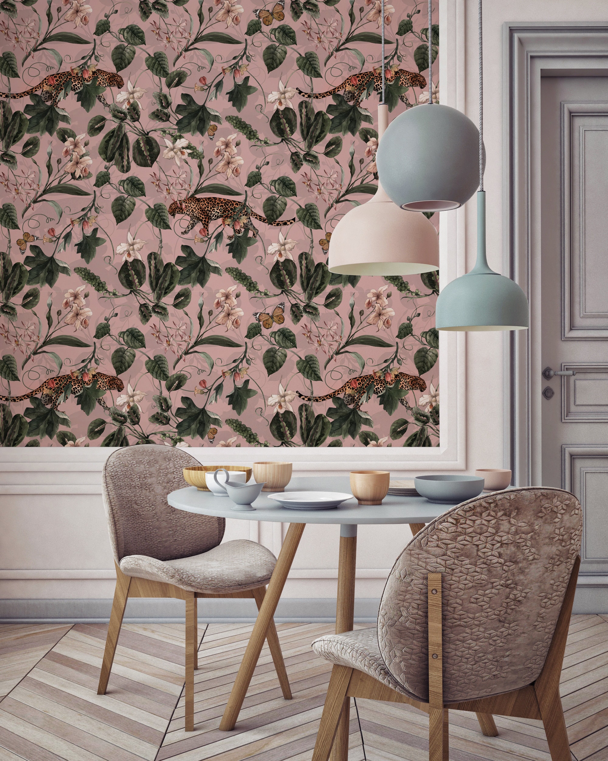 Meet our wild Plant Wallpaper with pink background! This one-of-a-kind design features a striking mix of flowers that contrast beautifully with the pink background. Vibrant tones instantly enliven any space, creating a warm atmosphere. Plus, the addition of the cheetah print adds exotic appeal. With the perfect combination of warm color sleeps (harmony of warm colors) and unique design, this wallpaper will definitely make a bold statement in your home or office. Elevate your interior decoration with this stunning piece of art today!